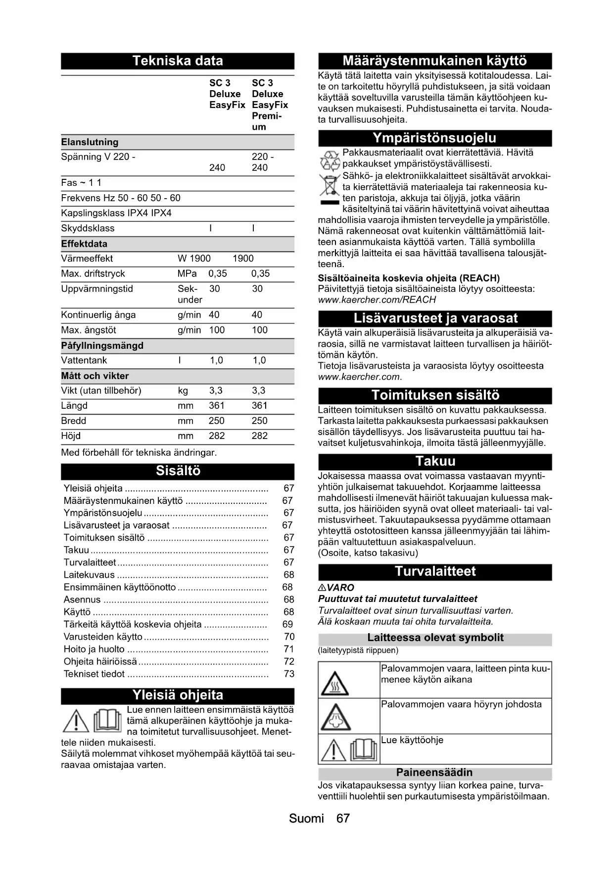 Ångspaken går inte att trycka in Ångspaken är säkrad med barnspärren. Skjut fram barnspärren. Ångspaken är upplåst. Ingen eller begränsad ånga trots tillräckligt med vat- ten i tanken Avkalkningspatronen inte isatt eller felaktigt isatt. Sätt i avkalkningspatronen eller justera dess läge. Avkalkningspatronen togs ut medan vatten fylldes på. Låt avkalkningspatronen sitta i medan maskinen fylls på. En ny avkalkningspatron har satts i. Håll ångspaken konstant intryckt. Efter ca 30 sekunder ges full ångeffekt. Röd kontrollampa ”Byte av avkalkningspatron” ly- ser eller blinkar Avkalkningspatronens körtid löper snart ut. Sätt i den nya avkalkningspatronen och återställs underhållsindikatorn, se kapitel Byta avkalknings- patron. Underhållsindikatorn återställdes inte efter att avkalk- ningspatronen bytts ut. Tryck samtidigt på knapparna ”Maximal ångmängd” och ”Reducerad ångmängd” och håll in dem tills kontrollampan ”Byte av avkalkningspatron” slocknar efter att avkalkningspatronen satts i, se kapitel Byta avkalkningspatron. Lysdiodslisten lyser konstant röd och ingen ånga trots tillräckligt med vatten i tanken. Avkalkningspatronens körtid har löpt ut. Sätt i den nya avkalkningspatronen och återställs underhållsindikatorn, se kapitel Byta avkalkningspa- tron. Underhållsindikatorn återställdes inte efter att avkalk- ningspatronen bytts ut. Tryck samtidigt på knapparna ”Maximal ångmängd” och ”Reducerad ångmängd” och håll in dem tills kontrollampan ”Byte av avkalkningspatron” slocknar efter att avkalkningspatronen satts i, se kapitel Byta avkalkningspatron. Hårdhet °dH mmol/l Antal blin- kande im- pulser Avstånd blinkan- de impul- ser I mjukt 0 - 7 0 - 1,3 1x 4 sekun- der II medel 7 - 14 1,3 - 2,5 2x III hårt 14 - 21 2,5 - 3,8 3x IV mycket hårt >21 >3,8 4xSuomi 67 Tekniska data Med förbehåll för tekniska ändringar. Sisältö Yleisiä ohjeita Lue ennen laitteen ensimmäistä käyttöä tämä alkuperäinen käyttöohje ja muka- na toimitetut turvallisuusohjeet. Menet- tele niiden mukaisesti. Säilytä molemmat vihkoset myöhempää käyttöä tai seu- raavaa omistajaa varten. Määräystenmukainen käyttö Käytä tätä laitetta vain yksityisessä kotitaloudessa. Lai- te on tarkoitettu höyryllä puhdistukseen, ja sitä voidaan käyttää soveltuvilla varusteilla tämän käyttöohjeen ku- vauksen mukaisesti. Puhdistusainetta ei tarvita. Nouda- ta turvallisuusohjeita. Ympäristönsuojelu Pakkausmateriaalit ovat kierrätettäviä. Hävitä pakkaukset ympäristöystävällisesti. Sähkö- ja elektroniikkalaitteet sisältävät arvokkai- ta kierrätettäviä materiaaleja tai rakenneosia ku- ten paristoja, akkuja tai öljyjä, jotka väärin käsiteltyinä tai väärin hävitettyinä voivat aiheuttaa mahdollisia vaaroja ihmisten terveydelle ja ympäristölle. Nämä rakenneosat ovat kuitenkin välttämättömiä lait- teen asianmukaista käyttöä varten. Tällä symbolilla merkittyjä laitteita ei saa hävittää tavallisena talousjät- teenä. Sisältöaineita koskevia ohjeita (REACH) Päivitettyjä tietoja sisältöaineista löytyy osoitteesta: www.kaercher.com/REACH Lisävarusteet ja varaosat Käytä vain alkuperäisiä lisävarusteita ja alkuperäisiä va- raosia, sillä ne varmistavat laitteen turvallisen ja häiriöt- tömän käytön. Tietoja lisävarusteista ja varaosista löytyy osoitteesta www.kaercher.com. Toimituksen sisältö Laitteen toimituksen sisältö on kuvattu pakkauksessa. Tarkasta laitetta pakkauksesta purkaessasi pakkauksen sisällön täydellisyys. Jos lisävarusteita puuttuu tai ha- vaitset kuljetusvahinkoja, ilmoita tästä jälleenmyyjälle. Takuu Jokaisessa maassa ovat voimassa vastaavan myynti- yhtiön julkaisemat takuuehdot. Korjaamme laitteessa mahdollisesti ilmenevät häiriöt takuuajan kuluessa mak- sutta, jos häiriöiden syynä ovat olleet materiaali- tai val- mistusvirheet. Takuutapauksessa pyydämme ottamaan yhteyttä ostotositteen kanssa jälleenmyyjään tai lähim- pään valtuutettuun asiakaspalveluun. (Osoite, katso takasivu) Turvalaitteet 몇 VARO Puuttuvat tai muutetut turvalaitteet Turvalaitteet ovat sinun turvallisuuttasi varten. Älä koskaan muuta tai ohita turvalaitteita. Laitteessa olevat symbolit (laitetyypistä riippuen) Paineensäädin Jos vikatapauksessa syntyy liian korkea paine, turva- venttiili huolehtii sen purkautumisesta ympäristöilmaan. SC 3 Deluxe EasyFix SC 3 Deluxe EasyFix Premi-