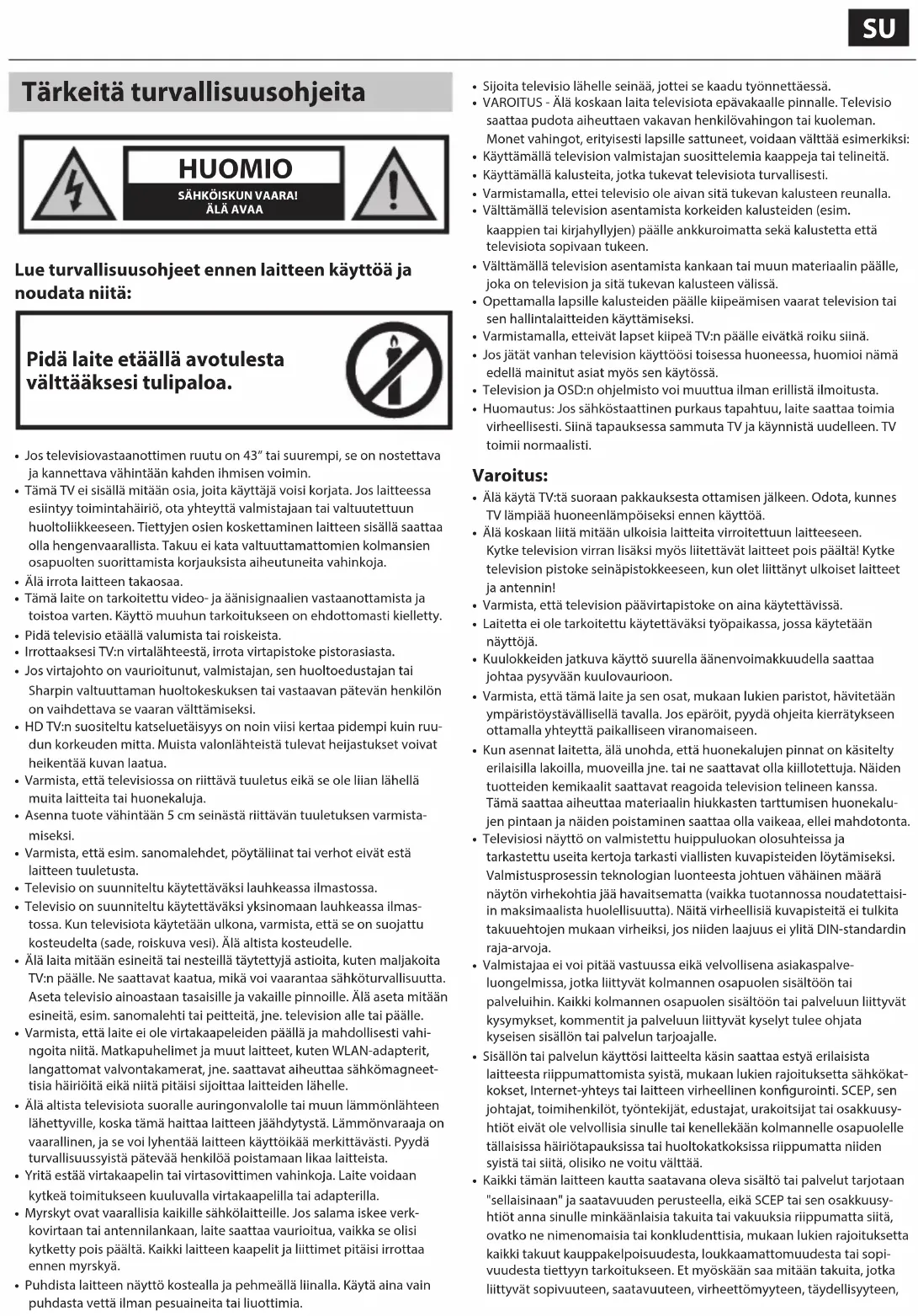 - Sharp Consumer Electronics Poland sp. z o.o. ilmoittaa, että tämä laite vastaa radio- ja telepäätelaitteista annetun 2014/53/EY-direktiivin olennaisia vaatimuksia ja muita asiaan liittyviä ehtoja.