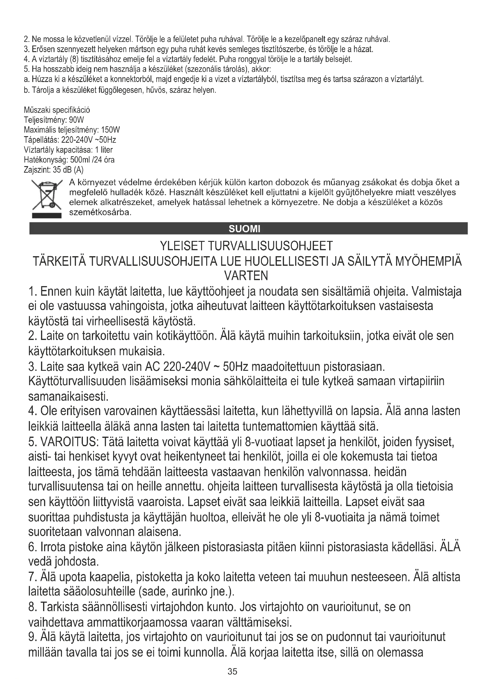 a. Irrota laite pistorasiasta, tyhjennä vesi vesisäiliöstä, puhdista se ja pidä vesisäiliö kuivana. b. Säilytä laitetta pystyasennossa viileässä, kuivassa paikassa. Tekniset ominaisuudet Teho: 90W Suurin teho: 150W Virtalähde: 220-240V ~ 50Hz Vesisäiliön tilavuus: 1 litra Tehokkuus: 500 ml / 24 tuntia Melutaso: 35dB (A) Suojellaksesi ympräristöäsi: hävitä pahvilaatikot ja muovipussit ja kierrätä ne niille tarkoitetuissa jäteastioissa. Käytetyt koneet tulee toimittaa niihin erioistuneisiin keräyspisteisiin ympäristölle vaarallisten aineiden takia. Älä hävitä laitteita sekajätteessä.38