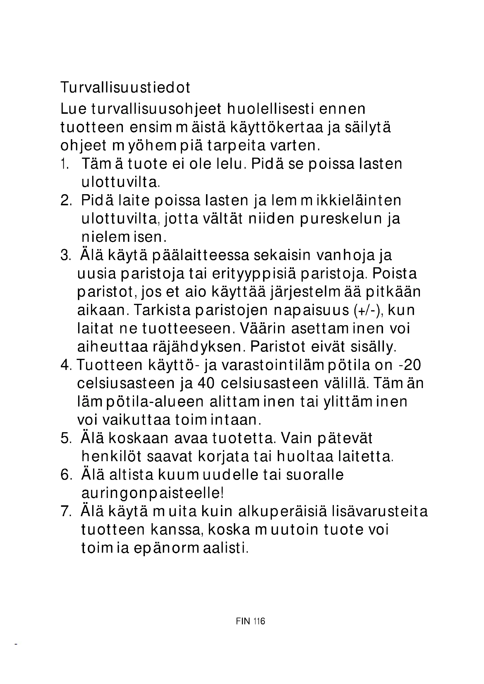 uusia paristoja tai erityyppisiä paristoja. Poista paristot, jos et aio käyttää järjestelmää pitkään aikaan. Tarkista paristojen napaisuus (+/-), kun laitat ne tuotteeseen. Väärin asettaminen voi aiheuttaa räjähdyksen. Paristot eivät sisälly.