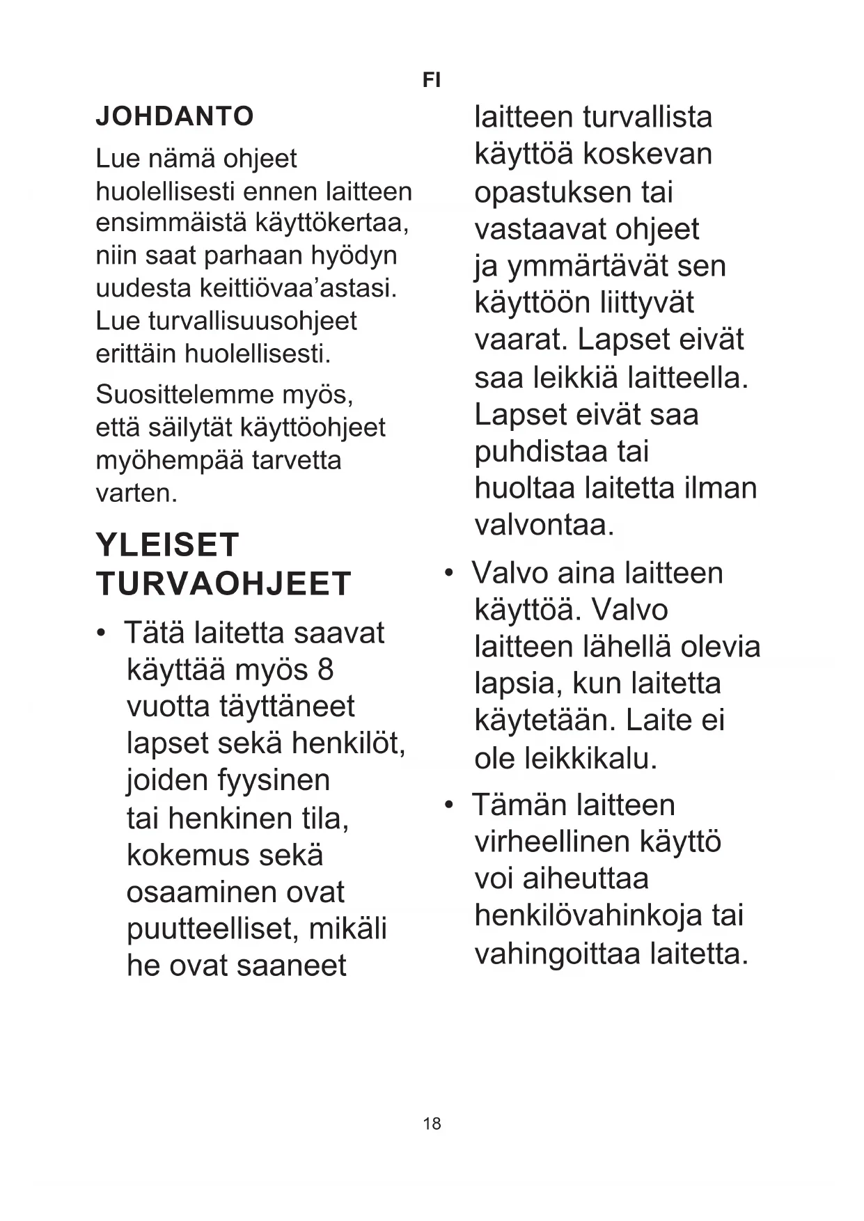 - Tätä laitetta saavat käyttää myös 8 vuotta täyttäneet lapset sekä henkilöt, joiden fyysinen tai henkinen tila, kokemus sekä osaaminen ovat puutteelliset, mikäli he ovat saaneet laitteen turvallista käyttöä koskevan opastuksen tai vastaavat ohjeet ja ymmärtävät sen käyttöön liittyvät vaarat. Lapset eivät saa leikkiä laitteella. Lapset eivät saa puhdistaa tai huoltaa laitetta ilman valvontaa.