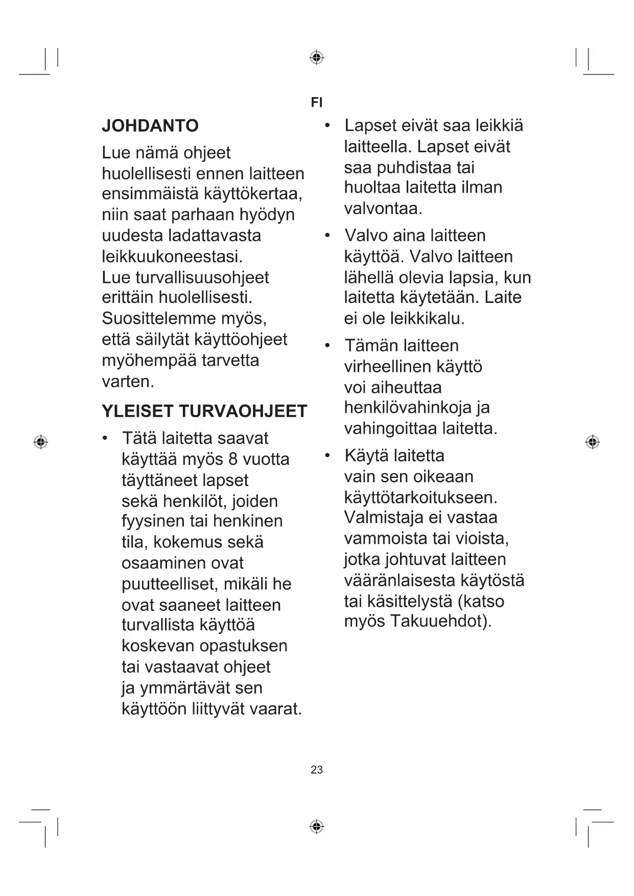 - Tätä laitetta saavat käyttää myös 8 vuotta täyttäneet lapset sekä henkilöt, joiden fyysinen tai henkinen tila, kokemus sekä osaaminen ovat puutteelliset, mikäli he ovat saaneet laitteen turvallista käyttöä koskevan opastuksen tai vastaavat ohjeet ja ymmärtävät sen käyttöön liittyvät vaarat.