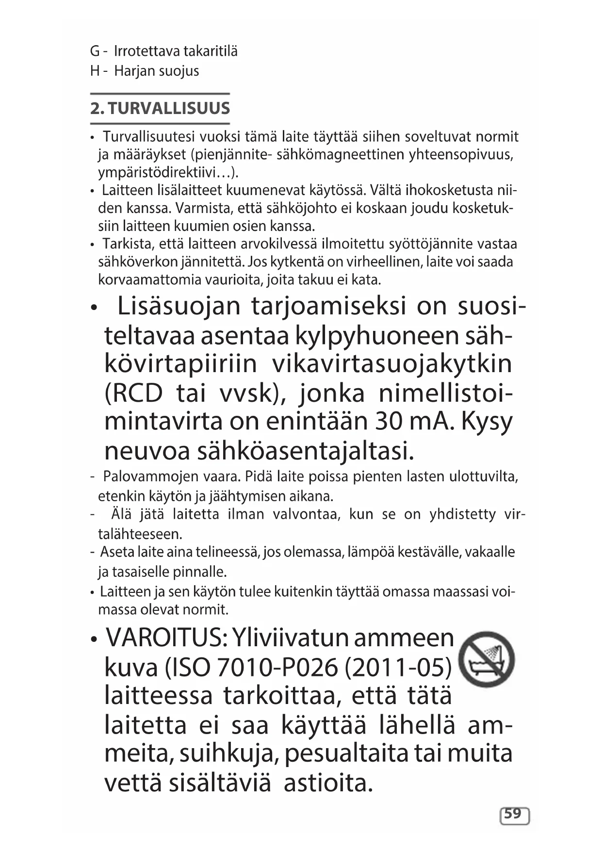 - VAROITUS: Yliviivatun ammeen kuva (ISO 7010-P026 (2011-05) laitteessa tarkoittaa, että tätä laitetta ei saa käyttää lähellä am- meita, suihkuja, pesualtaita tai muita vettä sisältäviä astioita.60 Maissa, joissa ei sovelleta EU:n asetuksia: