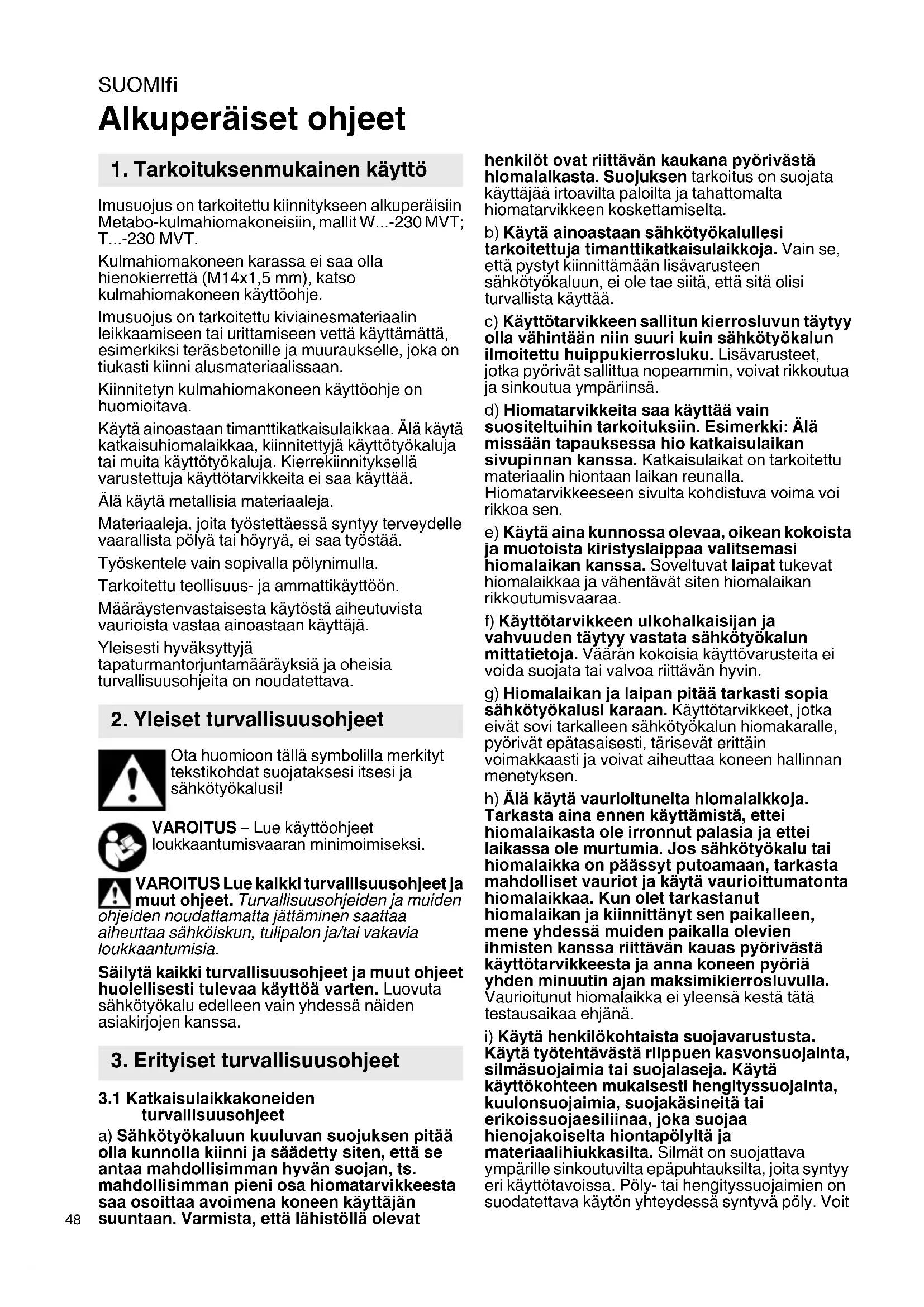 Alkuperäiset ohjeet Imusuojus on tarkoitettu kiinnitykseen alkuperäisiin Metabo-kulmahiomakoneisiin, mallit W...-230 MVT; T...-230 MVT. Kulmahiomakoneen karassa ei saa olla hienokierrettä (M14x1,5 mm), katso kulmahiomakoneen käyttöohje. Imusuojus on tarkoitettu kiviainesmateriaalin leikkaamiseen tai urittamiseen vettä käyttämättä, esimerkiksi teräsbetonille ja muuraukselle, joka on tiukasti kiinni alusmateriaalissaan. Kiinnitetyn kulmahiomakoneen käyttöohje on huomioitava. Käytä ainoastaan timanttikatkaisulaikkaa. Älä käytä katkaisuhiomalaikkaa, kiinnitettyjä käyttötyökaluja tai muita käyttötyökaluja. Kierrekiinnityksellä varustettuja käyttötarvikkeita ei saa käyttää. Älä käytä metallisia materiaaleja. Materiaaleja, joita työstettäessä syntyy terveydelle vaarallista pölyä tai höyryä, ei saa työstää. Työskentele vain sopivalla pölynimulla. Tarkoitettu teollisuus- ja ammattikäyttöön. Määräystenvastaisesta käytöstä aiheutuvista vaurioista vastaa ainoastaan käyttäjä. Yleisesti hyväksyttyjä tapaturmantorjuntamääräyksiä ja oheisia turvallisuusohjeita on noudatettava. Ota huomioon tällä symbolilla merkityt tekstikohdat suojataksesi itsesi ja sähkötyökalusi! VAROITUS – Lue käyttöohjeet loukkaantumisvaaran minimoimiseksi. VAROITUS Lue kaikki turvallisuusohjeet ja muut ohjeet. Turvallisuusohjeiden ja muiden ohjeiden noudattamatta jättäminen saattaa aiheuttaa sähköiskun, tulipalon ja/tai vakavia loukkaantumisia. Säilytä kaikki turvallisuusohjeet ja muut ohjeet huolellisesti tulevaa käyttöä varten. Luovuta sähkötyökalu edelleen vain yhdessä näiden asiakirjojen kanssa.