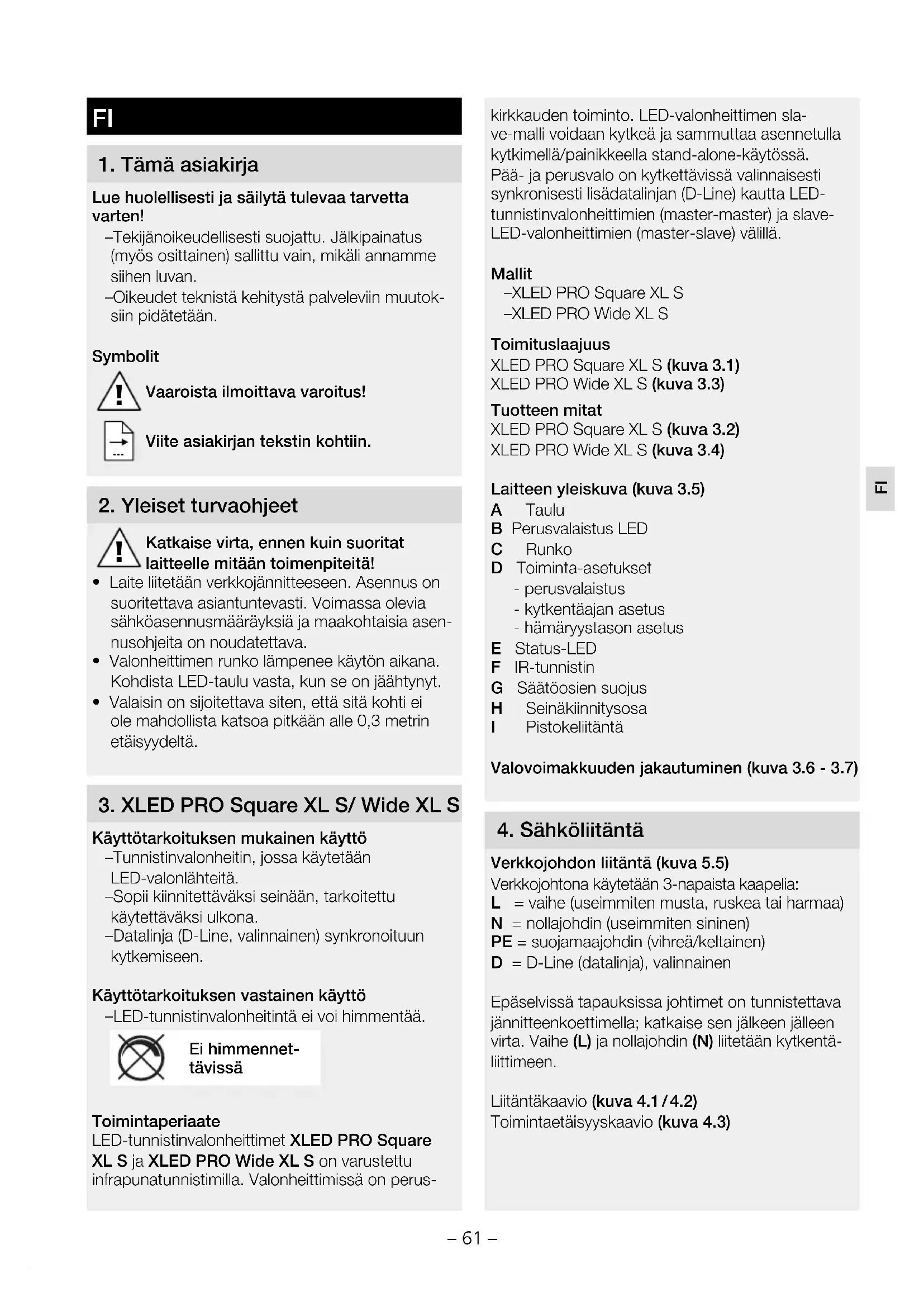 Käyttötarkoituksen mukainen käyttö – Tunnistinvalonheitin, jossa käytetään LED-valonlähteitä. – Sopii kiinnitettäväksi seinään, tarkoitettu käytettäväksi ulkona. – Datalinja (D-Line, valinnainen) synkronoituun kytkemiseen. Käyttötarkoituksen vastainen käyttö – LED-tunnistinvalonheitintä ei voi himmentää. Ei himmennet- tävissä Toimintaperiaate LED-tunnistinvalonheittimet XLEDPROSquare XLS ja XLEDPROWideXLS on varustettu infrapunatunnistimilla. Valonheittimissä on perus- kirkkauden toiminto. LED-valonheittimen sla- ve-malli voidaan kytkeä ja sammuttaa asennetulla kytkimellä/painikkeella stand-alone-käytössä. Pää- ja perusvalo on kytkettävissä valinnaisesti synkronisesti lisädatalinjan (D-Line) kautta LED- tunnistinvalonheittimien (master-master) ja slave- LED-valonheittimien (master-slave) välillä. Mallit – XLEDPROSquareXLS – XLEDPROWideXLS Toimituslaajuus XLEDPROSquareXLS (kuva 3.1) XLEDPROWideXLS (kuva 3.3) Tuotteen mitat XLEDPROSquareXLS (kuva 3.2) XLEDPROWideXLS (kuva 3.4) Laitteen yleiskuva (kuva 3.5) A Taulu B Perusvalaistus LED C Runko D Toiminta-asetukset - perusvalaistus - kytkentäajan asetus - hämäryystason asetus E Status-LED F IR-tunnistin G Säätöosien suojus H Seinäkiinnitysosa I Pistokeliitäntä Valovoimakkuuden jakautuminen (kuva 3.6 - 3.7)