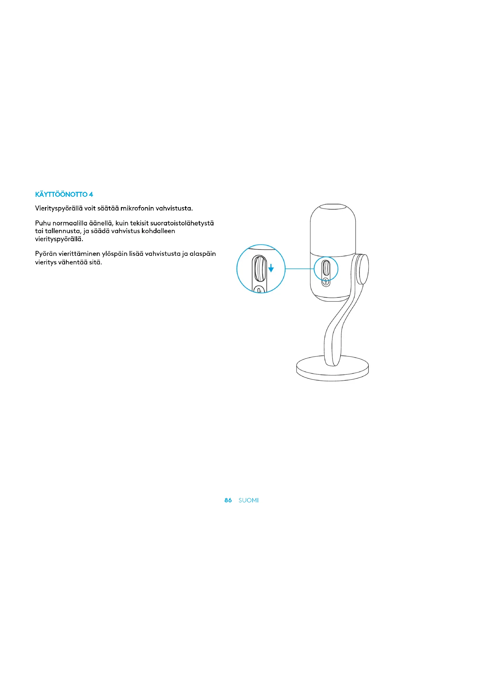 Vierityspyörällä voit säätää mikrofonin vahvistusta. Puhu normaalilla äänellä, kuin tekisit suoratoistolähetystä tai tallennusta, ja säädä vahvistus kohdalleen vierityspyörällä. Pyörän vierittäminen ylöspäin lisää vahvistusta ja alaspäin vieritys vähentää sitä.87 SUOMI