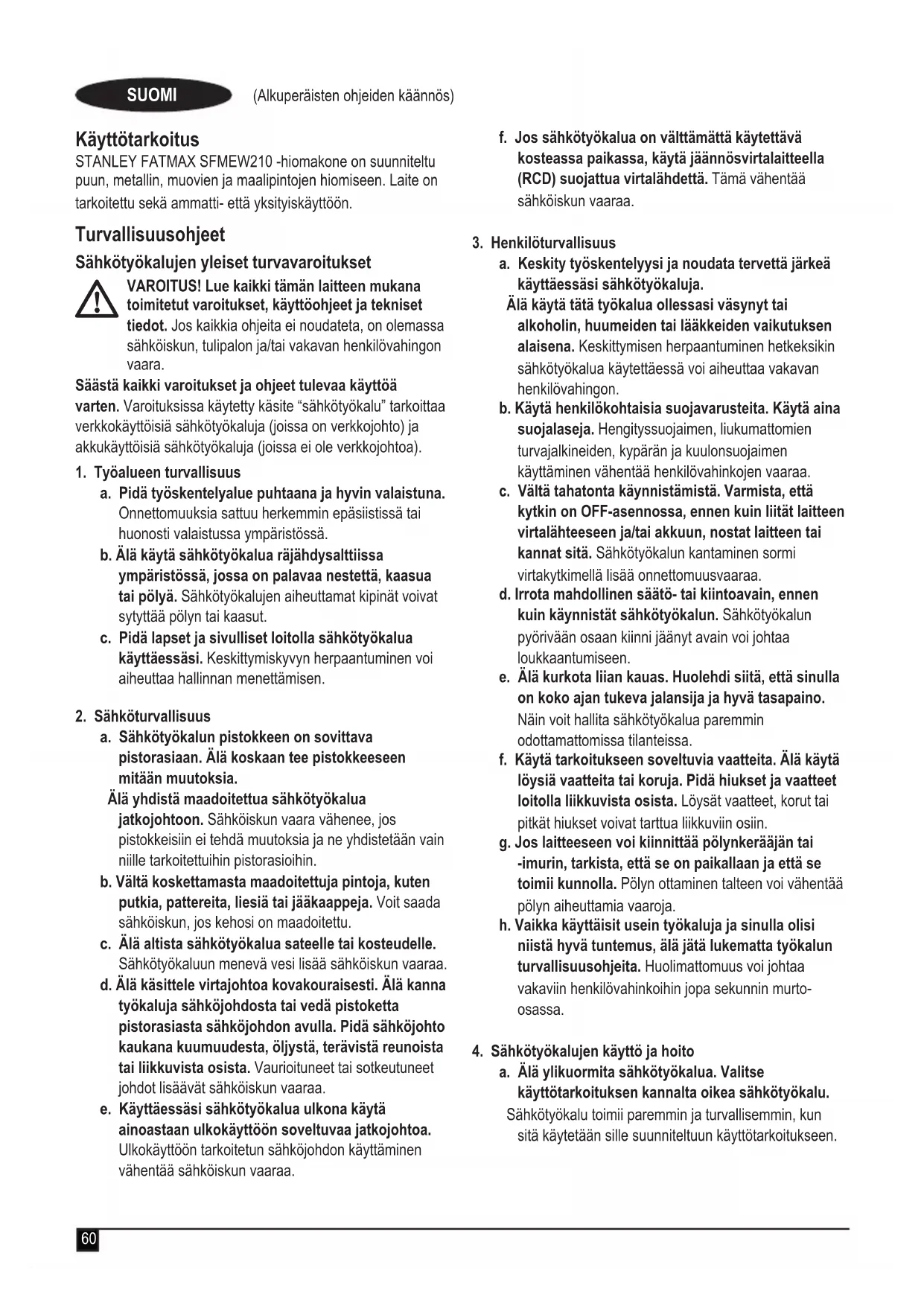 Takuu STANLEY FATMAX vakuuttunut tuotteidensa korkeasta laadusta ja tarjoaa kuluttajille 12 kuukauden takuun, joka astuu voimaan ostopäivänä. Takuu on lisäys kuluttajan laillisiin oikeuksiin eikä vaikuta niihin. Tämä takuu on voimassa kaikissa EU- ja ETA-maissa sekä Isossa-Britanniassa. Edellytyksenä takuun saamiselle on, että vaade täyttää STANLEY FATMAX -ehdot ja että ostaja toimittaa ostotositteen jälleenmyyjälle tai valtuutetulle huoltoliikkeelle. STANLEY FATMAXin 1 vuoden takuun ehdot ja lähimmän valtuutetun korjauspalvelun yhteystiedot ovat saatavilla osoitteessa www.2helpU.com, tai ottamalla yhteyttä paikalliseen STANLEY FATMAX -toimipisteeseen tässä ohjekirjassa ilmoitettuihin osoitteisiin. Käy verkkosivuillamme osoitteessa www.stanleytools.eu/3 ja rekisteröi uusi STANLEY FATMAX -tuotteesi saadaksesi tietoa uusista tuotteista ja erikoistarjouksista.65 (Μετάφραση των πρωτότυπων οδηγιών) Προβλεπόμενη χρήση Το τριβείο STANLEY FATMAX SFMEW210 έχει σχεδιαστεί για γυαλοχάρτισμα ξύλου, μετάλλου, πλαστικών υλικών και βαμμένων επιφανειών. Αυτή η συσκευή προορίζεται για επαγγελματίες και ιδιώτες, μη επαγγελματίες χρήστες. Οδηγίες ασφαλείας Γενικές προειδοποιήσεις ασφαλείας για ηλεκτρικά