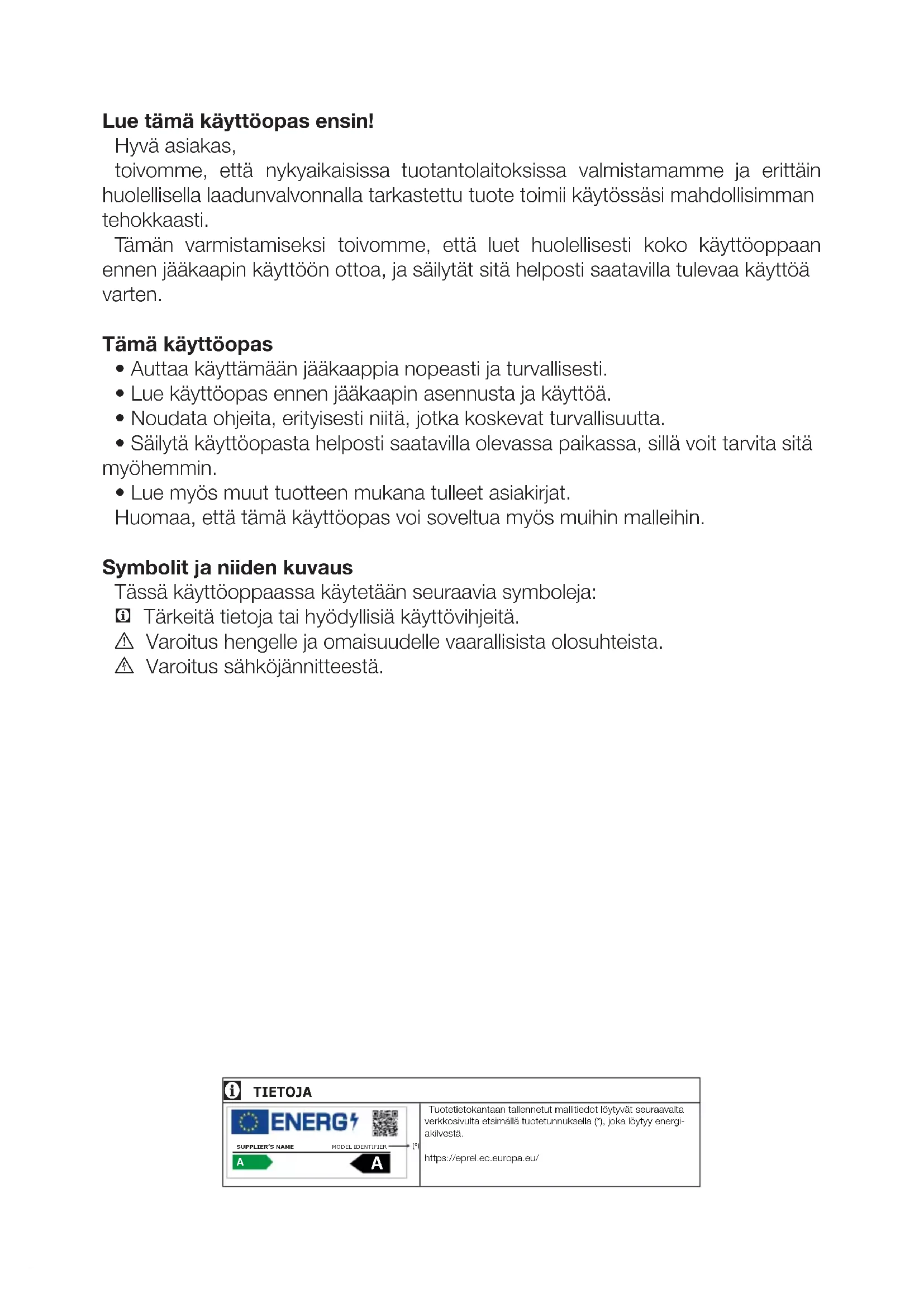 - Lue käyttöopas ennen jääkaapin asennusta ja käyttöä.