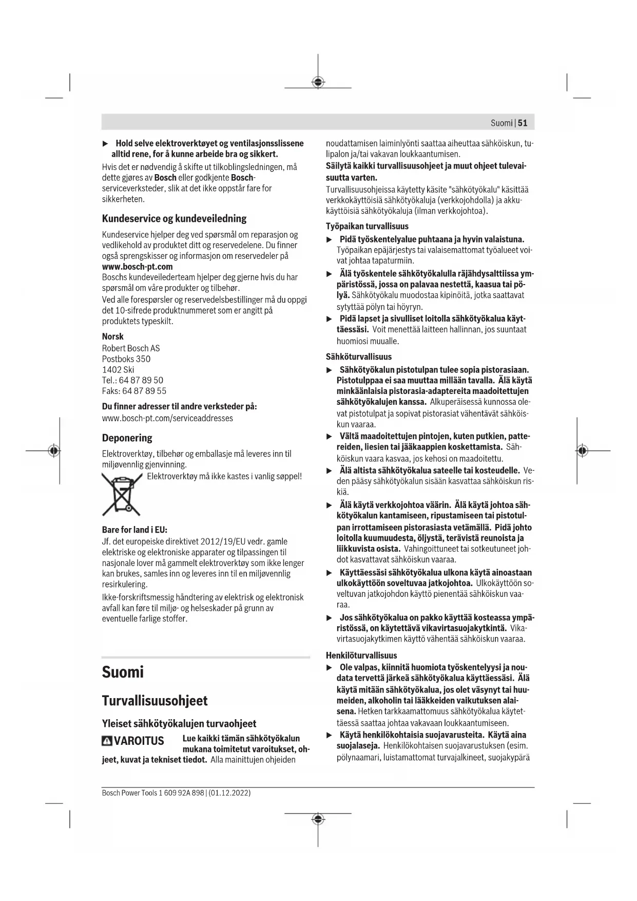 Vibrasjonsnivået og støyemisjonen som er angitt i disse anvisningene er målt i samsvar med en standardisert målemetode og kan brukes til sammenligning av elektroverktøy. Verdiene egner seg også til en foreløpig estimering av vibrasjonsnivået og støyutslippet. Angitt vibrasjonsnivå og støyutslipp representerer de hovedsakelige bruksområdene til elektroverktøyet. Men hvis elektroverktøyet brukes til andre formål, med andre innsatsverktøy eller utilstrekkelig vedlikehold, kan vibrasjonsnivået og støyutslippet avvike fra det som er angitt. Dette kan føre til en betydelig økning av vibrasjonsnivået og støyutslippet for hele arbeidstidsrommet. For en nøyaktig vurdering av vibrasjonsnivået og støyutslippet skal det også tas hensyn til de tidene verktøyet er slått av, eller går, men ikke faktisk er i bruk. Dette kan redusere vibrasjonsnivået og støyutslippet for hele arbeidstidsrommet betraktelig. Bestem ekstra sikkerhetstiltak til beskyttelse av brukeren mot vibrasjonenes virkning, som for eksempel: Vedlikehold av elektroverktøy og innsatsverktøy, holde hendene varme, organisere arbeidsforløpene. Montering u Før alle arbeider på elektroverktøyet utføres må støpselet trekkes ut av stikkontakten. Ekstrahåndtak (se bilde A) u Du må ikke bruke elektroverktøyet uten ekstrahåndtaket (6). Du kan stille inn ekstrahåndtaket (6) i 12 forskjellige posisjoner for å oppnå en kroppsstilling som er sikker og gir minst mulig belastning. Drei nedre gripestykke på ekstrahåndtaket (6) i dreieretningen ➊ og skyv ekstrahåndtaket (6) fremover helt til du kan svinge det i ønsket posisjon. Trekk deretter ekstrahåndtaket (6) tilbake igjen og skru det nedre gripestykket fast igjen i dreieretning ➋. Stille inn boredybden (se bilde A) Med dybdeanlegget (7) kan du bestemme boredybden X. Drei den nedre delen på ekstrahåndtaket (6) mot urviseren, og sett inn dybdestopperen (7). Trekk dybdestopperen (7) ut til avstanden mellom spissen på boret og spissen på dybdestopperen (7) tilsvarer den ønskede boredybden X. Skru deretter den nedre delen på ekstrahåndtaket (6) fast igjen med urviseren. Rillene på dybdestopperen (7) må vende ned. Bosch Power Tools 1 609 92A 898 | (01.12.2022)50 | Norsk Verktøyskifte u Bruk beskyttelseshansker ved skifte av verktøy. Chucken kan bli kraftig oppvarmet ved langvarig arbeid. Tannkranschuck (se bilde B) Åpne tannkranschucken (1) ved å dreie til verktøyet kan settes inn. Sett inn verktøyet. Sett chucknøkkelen (9) i de tilsvarende boringene på tannkranschucken (1), og spenn fast verktøyet jevnt. Skruverktøy (se bilde C) Ved bruk av skrubits (10) må du alltid bruke en universalbitsholder (11). Bruk den bare til skrubits som passer til skruhodet. For skruing setter du alltid omkobleren „Boring/slagboring“ (2) på symbolet „Boring“. Støv-/sponavsuging Støv fra materialer som blyholdig maling, noen tresorter, mineraler og metall kan være helsefarlige. Berøring eller innånding av støv kan utløse allergiske reaksjoner og/eller åndedrettssykdommer hos brukeren eller personer som befinner seg i nærheten. Visse typer støv som eik- eller bøkstøv gjelder som kreftfremkallende, spesielt i kombinasjon med tilsetningsstoffer til trebearbeidelse (kromat, trebeskyttelsesmidler). Asbestholdig materiale må kun bearbeides av fagfolk. – Sørg for god ventilasjon av arbeidsplassen. – Det anbefales å bruke en støvmaske med filterklasse P2. Følg ditt lands gyldige forskrifter for de materialene som skal bearbeides. u Unngå støv på arbeidsplassen. Støv kan lett antennes. Skifte chuck u På elektroverktøy uten borespindellås må chucken skiftes ut av et autorisert serviceverksted forBosch elektroverktøy. Chucken må strammes med et tiltrekkingsmoment på ca. 30 – 35Nm. Bruk Igangsetting u Vær oppmerksom på nettspenningen! Spenningen til strømkilden må stemme overens med angivelsene på elektroverktøyets typeskilt. Stille inn dreieretningen (se bilde D – E) u Du må bare aktivere høyre/venstre-bryteren(5) når elektroverktøyet er stanset. Med dreieretningsomkobleren (5) kan du endre dreieretningen til elektroverktøyet. Dette er ikke mulig når på/av-bryteren (4) er trykt inn. Høyrerotasjon: For å bore og skru inn skruer trykker du retningsvelgeren (5) mot venstre helt til den stopper. Venstregang: For løsing hhv. utskruing av skruer og muttere trykker du dreieretningsomkobleren (5) mot høyre til den stopper. Stille inn driftsmåte Boring og skruing Sett omkobleren (2) på symbolet „Boring“. Slagboring Sett omkobleren (2) på symbolet "Slagboring". Omkobleren (2) går merkbart i lås og kan også betjenes når motoren er i gang. Inn-/utkobling For å slå på elektroverktøyet trykker du på av/på-bryteren (4) og holder den inne. For å låse den inntrykte av/på-bryteren (4) trykker du på låseknappen (3). For å slå av slipper du av/på-bryteren (4), og hvis den er låst med låseknappen (3), trykker du kort på av/på-bryteren (4) og slipper den. Innstilling av turtallet/slagtallet Du kan regulere turtallet/slagtallet til det innkoblede elektroverktøyet trinnløst, avhengig av hvor langt inn du trykker av/på-bryteren (4). Et lett trykk på av/på-bryteren (4) gir lavt turtall/slagtall. Turtallet/slagtallet stiger med økende trykk. Arbeidshenvisninger u Før alle arbeider på elektroverktøyet utføres må støpselet trekkes ut av stikkontakten. u Sett elektroverktøyet bare mot mutteren/skruen når det er slått av. Innsatsverktøy som dreier seg kan skli. Etter langvarig arbeid med lavt turtall bør du avkjøle elektroverktøyet ved å la det gå på tomgang med maksimalt turtall i ca. 3 minutter. For å bore fliser setter du omkobleren (2) på symbolet „Boring“. Etter at du har boret gjennom flisene, setter du omkobleren på symbolet „Slagboring“ og arbeider med slag. Ved arbeid i betong, stein og mur må du bruke hardmetallbor. Ved boring i metall må du bare bruke feilfrie, 