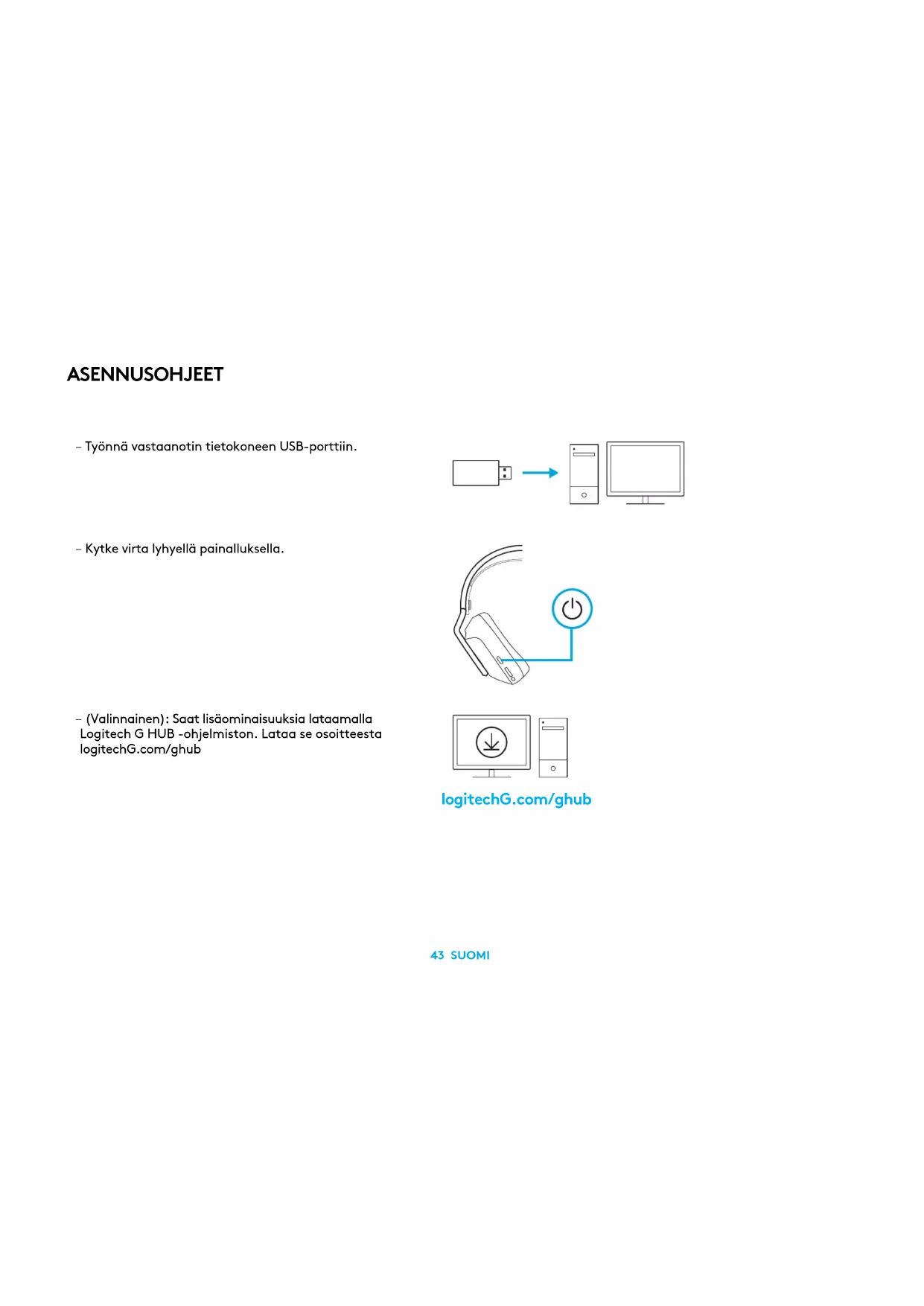 643 SUOMI ASENNUSOHJEET – Työnnä vastaanotin tietokoneen USB-porttiin. – Kytke virta lyhyellä painalluksella. – (Valinnainen): Saat lisäominaisuuksia lataamalla Logitech G HUB -ohjelmiston. Lataa se osoitteesta logitechG.com/ghub logitechG.com/ghub44 SUOMI – Korvakuppeja voi säätää ylös- tai alaspäin. – Pantaosan pituutta voi myös säätää.45 SUOMI – Käännä mikrofonin puomi ylös vaimentaaksesi mikrofonin. – Lataa kuulokemikrofoni, kun akku on vähissä.46 SUOMI OMINAISUUDET 1 Säädettävä ja käännettävä jousitettu hihna 2 Muodon muistavat vaahtomuovikorvatyynyt 3 40 mm:n kaiutinelementit 4 Äänenvoimakkuuden säädin korvakupissa 5 Kääntämällä vaimennettava 6 mm:n mikrofoni 6 USB-C-latausportti