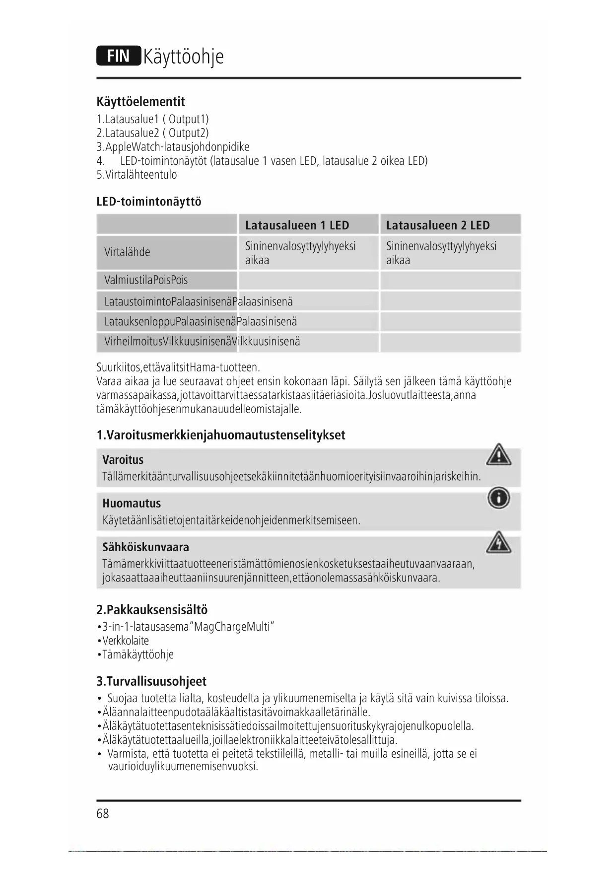 LED-toimintonäyttö Latausalueen 1LED Latausalueen 2LED Virtalähde Sininen valo syttyy lyhyeksi aikaa Sininen valo syttyy lyhyeksi aikaa Valmiustila Pois Pois Lataustoiminto Palaa sinisenä Palaa sinisenä Latauksen loppu Palaa sinisenä Palaa sinisenä Virheilmoitus Vilkkuu sinisenä Vilkkuu sinisenä Suurkiitos, että valitsit Hama-tuotteen. Varaaaikaa ja lue seuraavat ohjeet ensin kokonaan läpi. Säilytä sen jälkeen tämä käyttöohje varmassa paikassa, jotta voit tarvittaessa tarkistaa siitä eri asioita. Jos luovut laitteesta, anna tämä käyttöohje sen mukana uudelle omistajalle.