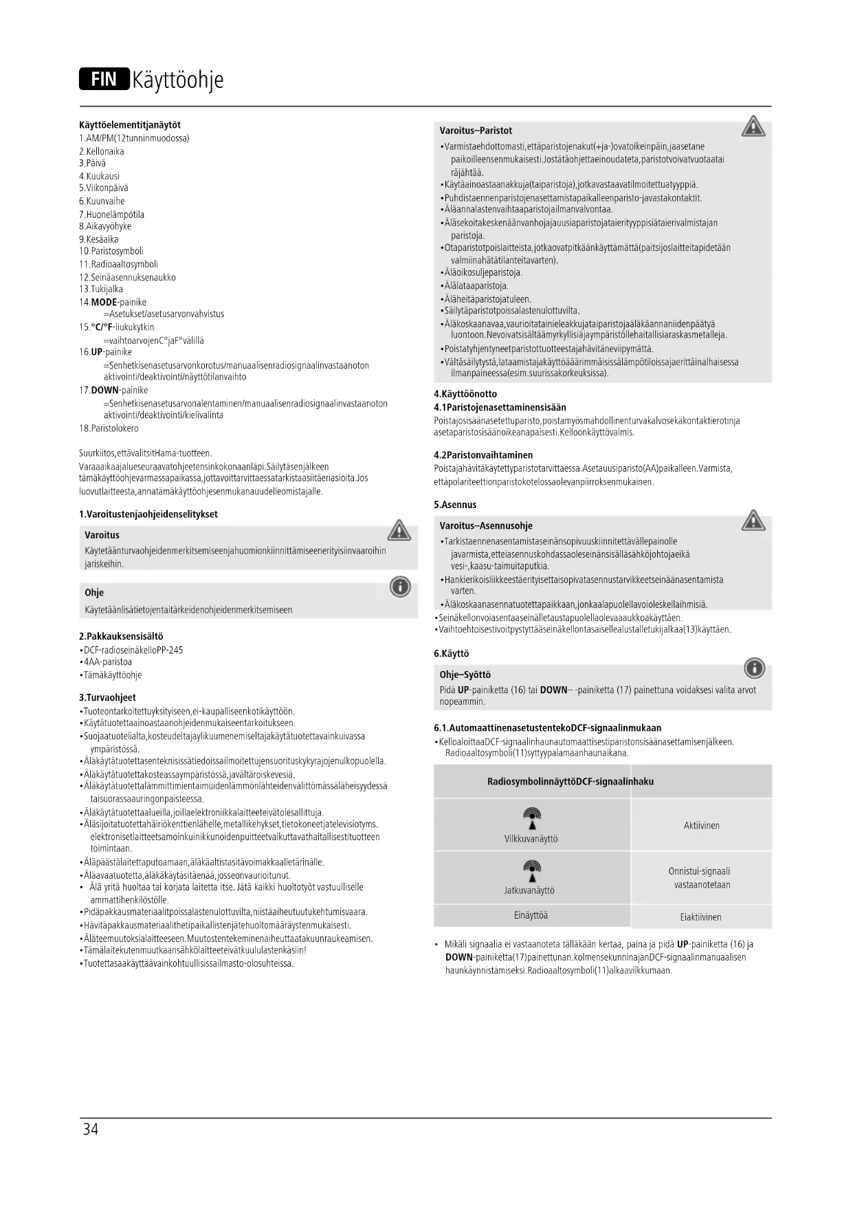 - Tuotetta saa käyttää vain kohtuullisissa ilmasto-olosuhteissa. Varoitus – Paristot