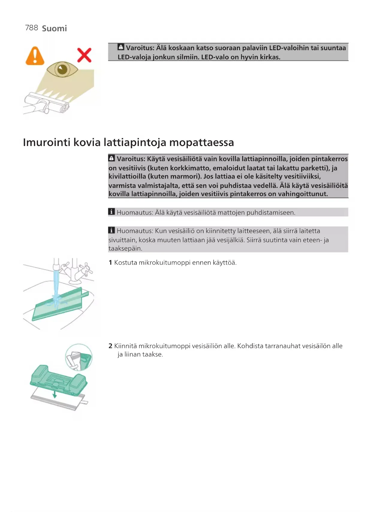 3 Laite on suunniteltu latautumaan täyteen 6 tunnissa. Voit valvoa latausprosessia näytössä. Kun laite on latautunut kokonaan, näyttöön tulee arvo 100%. Näyttö sammuu muutaman minuutin kuluttua. Käyttö Laitteen kokoaminen 1 Kiinnitä rikkaimuri putkeen. Varmista, että se napsahtaa paikalleen. 2 Kiinnitä putki suuttimeen. Varmista, että se napsahtaa paikalleen.787 Suomi Pehmeiden ja kovien lattiapintojen imurointi 1 Käynnistä laite painamalla virtapainiketta. Huomautus: Voit sammuttaa laitteen painamalla virtapainiketta uudelleen. 2 Plus (+)- ja miinus (–) -painikkeilla voit valita kolme eri tehoasetusta. E – Eco-tila N – Normaali tila T – Turbo-tila 3 Voit puhdistaa imurilla kovia tai pehmeitä lattiapintoja. Kun lattiatyypin tunnistus on käytössä, laite tunnistaa lattian tyypin ja optimoi suorituskyvyn valitsemaasi tehoasetusta varten. Jos haluat poistaa tämän toiminnon käytöstä, perehdy alla oleviin mukautusasetuksiin. Varoitus: Älä imuroi vettä tai muita nesteitä.788 Suomi Varoitus: Älä koskaan katso suoraan palaviin LED-valoihin tai suuntaa LED-valoja jonkun silmiin. LED-valo on hyvin kirkas. Imurointi kovia lattiapintoja mopattaessa Varoitus: Käytä vesisäiliötä vain kovilla lattiapinnoilla, joiden pintakerros on vesitiivis (kuten korkkimatto, emaloidut laatat tai lakattu parketti), ja kivilattioilla (kuten marmori). Jos lattiaa ei ole käsitelty vesitiiviiksi, varmista valmistajalta, että sen voi puhdistaa vedellä. Älä käytä vesisäiliöitä kovilla lattiapinnoilla, joiden vesitiivis pintakerros on vahingoittunut. Huomautus: Älä käytä vesisäiliötä mattojen puhdistamiseen. Huomautus: Kun vesisäiliö on kiinnitetty laitteeseen, älä siirrä laitetta sivuittain, koska muuten lattiaan jää vesijälkiä. Siirrä suutinta vain eteen- ja taaksepäin. 1 Kostuta mikrokuitumoppi ennen käyttöä. 2 Kiinnitä mikrokuitumoppi vesisäiliön alle. Kohdista tarranauhat vesisäilön alle ja liinan taakse.789 Suomi MAX 50 °C 3 Täytä vesisäiliö vedellä ja varmista, että veden lämpötila on alle 50°C. 10 ml 4 (Valinnainen) Jos haluat lisätä lattianpuhdistusnestettä vesisäiliöön, käytä vähän vaahtoavaa tai vaahtoamatonta, laimennettavaa ainetta. Suosittelemme XV1792‑lattianpuhdistusnestettä. Lisää veteen vain muutama pisara puhdistusnestettä. 5 Sulje vesisäiliö oikein. 6 Kiinnitä valmisteltu vesisäiliö vesisuuttimeen, niin voit aloittaa. Varmista, että vesisäiliö on suunnattu oikein. 7 Käynnistä laite painamalla virtapainiketta. Kiinnittämällä vesimoduulin suuttimeen voit puhdistaa kovia lattiapintoja tehokkaasti.790 Suomi Huomautus: Vesimoduuli ei sovellu käytettäväksi pehmeillä lattiapinnoilla, kuten matoilla. Huomautus: Älä käytä vesisuutinta siivoamiseen, jos vesisäiliötä ei ole asetettu paikalleen. Varoitus: Vesimoduulia ei pidä käyttää vesilätäköiden nostamiseen. Vinkkejä ja muita tärkeitä tietoja