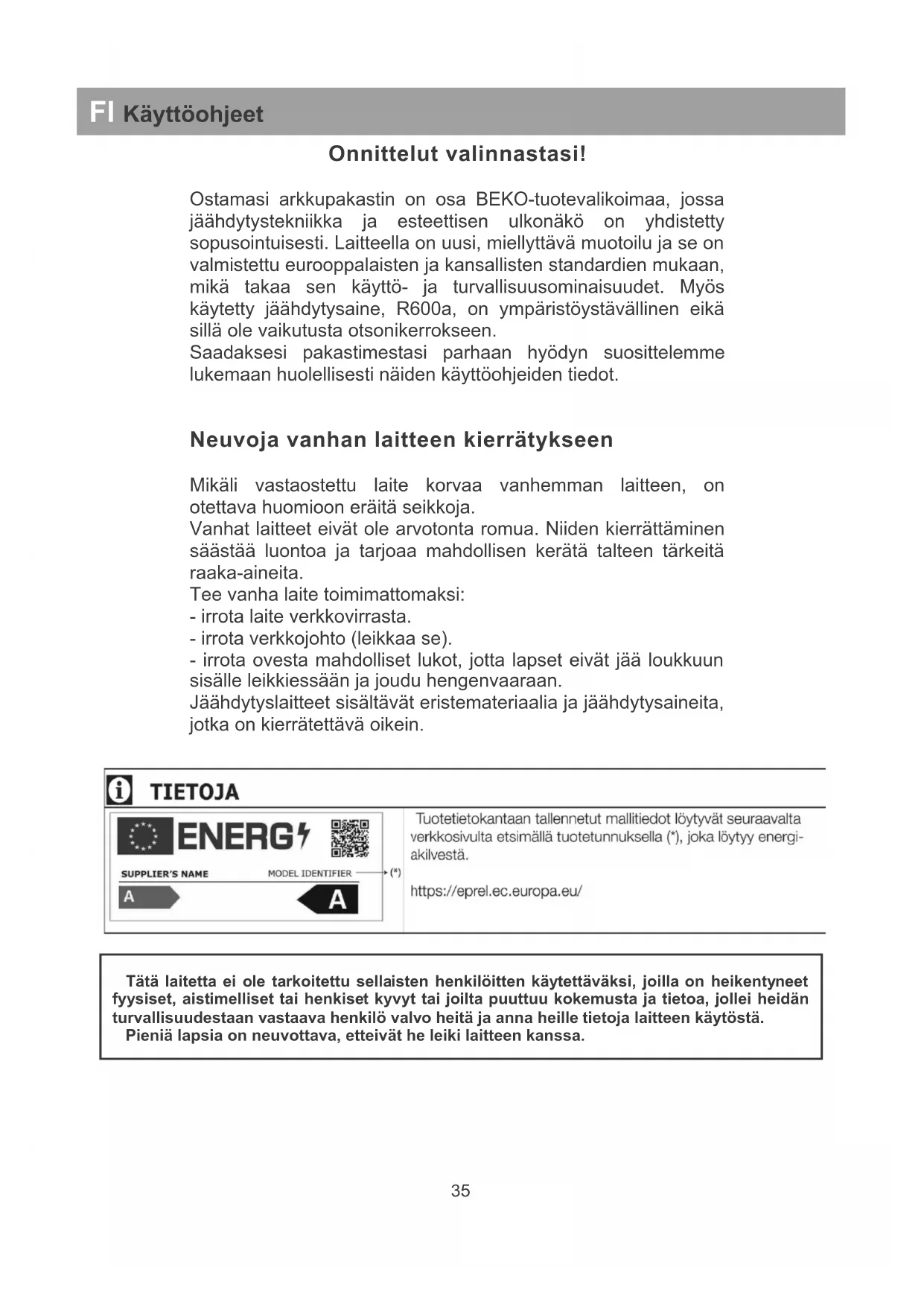 FI Käyttöohjeet Tätä laitetta ei ole tarkoitettu sellaisten henkilöitten käytettäväksi, joilla on heikentyneet fyysiset, aistimelliset tai henkiset kyvyt tai joilta puuttuu kokemusta ja tietoa, jollei heidän turvallisuudestaan vastaava henkilö valvo heitä ja anna heille tietoja laitteen käytöstä. Pieniä lapsia on neuvottava, etteivät he leiki laitteen kanssa. Pakkauksen kierrätys VAROITUS! Älä anna lasten leikkiä pakkauksella tai sen osilla. Aaltopahvin tai muovikelmun palasiin voi tukehtua. Jotta saisit laitteen hyvässä kunnossa, se on suojattu soveliaalla pakkausmateriaalilla. Kaikki pakkausmateriaalit ovat yhteensopivia ympäristön kanssa ja kierrätettäviä. Auta meitä kierrättämään pakkausmateriaali ja suojelemaan ympäristöä! TÄRKEÄÄ! Ennen kuin käytät laitetta lue nämä ohjeet huolellisesti ja kokonaisuudessaan. Ne sisältävät tärkeää tietoa laitteen asennuksesta, käytöstä ja huollosta. Valmistaja on vapaa kaikista vastuista, mikäli tämän ohjekirjan neuvoja ei noudateta. Säilytä nämä ohjeet varmassa paikassa, jotta ne ovat tarvittaessa helposti saatavilla. Niistä voi myös olla hyötyä seuraavalle käyttäjälle. HUOMIO! Laitetta saa käyttää ainoastaan käyttötarkoitukseensa (kotitalouskäyttö), sopivassa paikassa suojattuna sateelta, kosteudelta ja muilta sääilmiöiltä. Kuljetusohjeet Laitetta on kuljetettava mahdollisuuksien mukaan ainoastaan pystyasennossa. Pakkauksen on oltava täysin ehjä kuljetuksen aikana. Jos laite asetetaan kuljetuksen aikana vaakatasoon (vain pakkauksen merkintöjen mukaan), suositellaan, että ennen käyttöä laitteen annetaan olla paikoillaan 4 tuntia kuljetuksen jälkeen, jotta jäähdytysvirtapiiri ehtii asettua. Näiden ohjeiden noudattamatta jättäminen voi aiheuttaa kompressorimoottorin rikkoutumisen ja tämän takuun raukeamiseen.