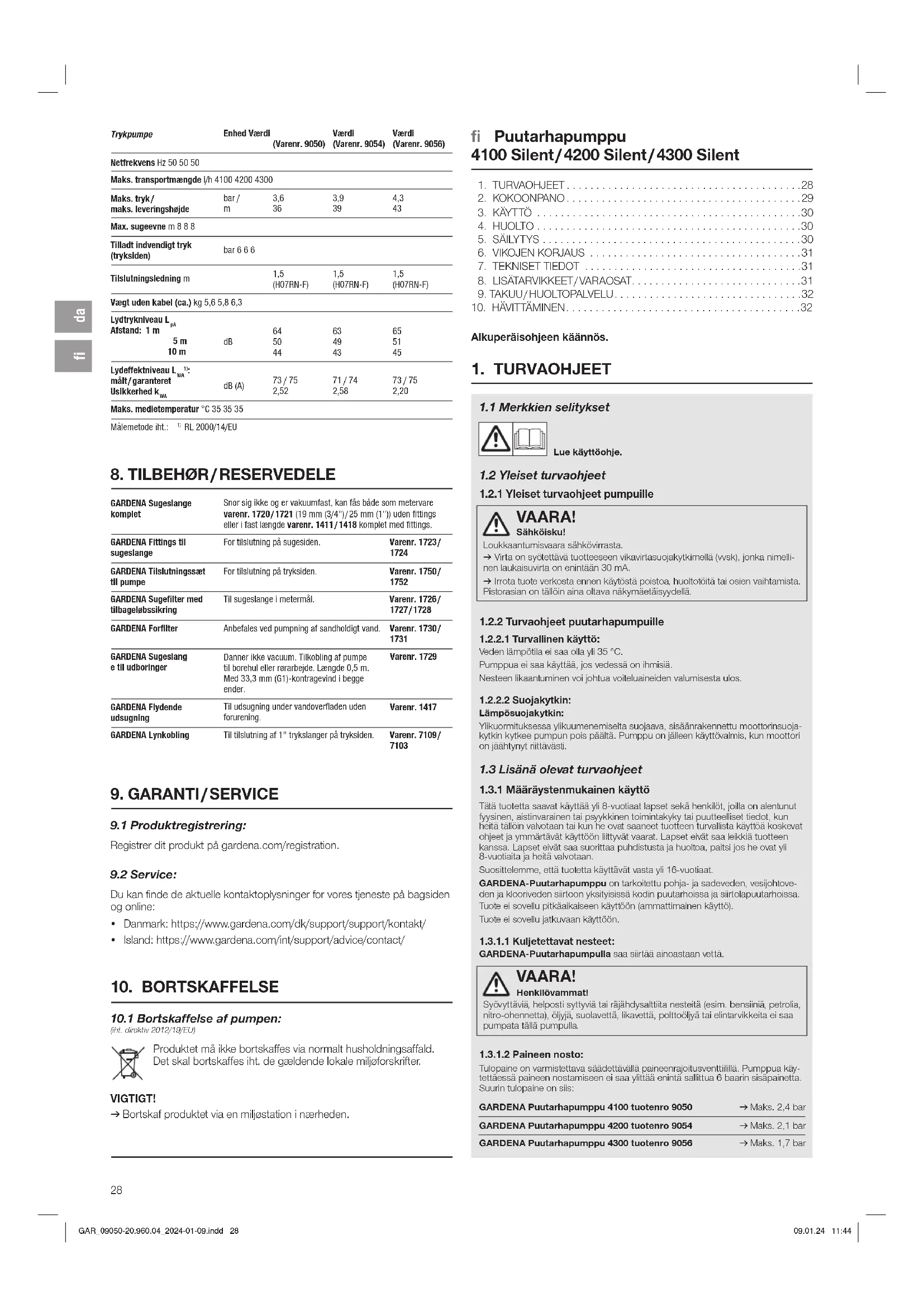 VAARA! Sydänkohtauksen vaara!Tuote muodostaa käytön aikana sähkömagneettisen kentän. Kenttä voi vaikut-taa aktiivisten tai passiivisten lääketieteellisten implanttien (esimerkiksi sydämen-tahdistimet) toimintaan ja aiheuttaa vakavia tai kuolemaan johtavia vammoja. v Keskustele lääkärin ja implantin valmistajan kanssa ennen tämän tuotteen käyttöä.v Irrota pistoke pistorasiasta tuotteen käytön jälkeen.Pumpun on oltava pystytetty tukevasti ja tulvavedeltä suojattuna ja sen on var-mistettava veteen putoamista vastaan. Sijoita pumppu turvalliselle etäisyydelle (vähintään 2 m) pumpattavasta aineesta. Lisäksi turvallisuutta voidaan parantaa hyväksytyn henkilösuojakytkimen käytöllä.v Kysy lisää sähköalan asiantuntijalta.Jos tuotteen verkkoliitäntäjohto vaurioituu, se on annettava valmistajan tai sen asiakaspalvelun tai vastaavan valtuutetun henkilön vaihdettavaksi vaaratilanteiden välttämiseksi.v Suojaa verkkopistoke ja verkkoliitäntäjohto kuumuudelta, öljyltä ja teräviltä reunoilta.v Älä kanna pumppua johdosta kiinni pitäen äläkä vedä johdosta irrottaessasi pistoketta verkkopistorasiasta.v Aseta pumppu tulvavedeltä suojattuun paikkaan.v Tarkista verkkokaapeli säännöllisesti.v Suorita silmämääräinen tarkastus aina ennen pumpun käyttöä (erityisesti verkkoliitäntäjohdolle ja verkkopistokkeelle).Viallista pumppua ei saa käyttää.v Vauriotapauksessa anna pumppu ehdottomasti GARDENA-huoltopalvelun tarkastettavaksi.Sähköiset muutokset saa suorittaa vain sähköalan ammattihenkilö.v Virtalähde on irrotettava ennen täyttämistä, purkamista ja huoltoa.v Huomioi generaattorin valmistajan varoitukset, kun pumppujamme käytetään generaattorin kanssa.1.3.2.1 Johto:Jatkojohtoa käytettäessä sen on vastattava seuraavan taulukon vähimmäishal-kaisijoita:Jännite Johdon pituus Halkaisija230 – 240 V / 50 Hz Enintään 20 m 1,5 mm²230 – 240 V / 50 Hz 20 – 50 m 2,5 mm²1.3.3 Lisänä olevat henkilökohtaiset turvaohjeet VAARA! Tukehtumisvaara!Pienet osat voidaan niellä helposti.v Pidä pienet lapset kaukana kokoamisen aikana. VAARA! Loukkaantumisvaara johtuen kuumasta vedestä!Pumpattu vesi on paineen alainen ja voi aiheuttaa loukkaantumisia, jos se osuu suoraan vartaloon tai silmiin.Mikäli pumppu käy kauemmin (> 5 min.) painepuolen ollessa suljettuna, saattaa pumpussa oleva vesi kuumentua, mikä voi johtaa palovammoi- hin. v Anna pumpun käydä korkeintaan 5 minuuttia suljettua painepuolta vastaan tai jos vedensyöttö ei toimi.Mikäli pumppu käy kauemmin ilman imupuolelta saatavaa vettä, saat-taa pum pussa oleva vesi kuumentua, mikä voi johtaa palovammoihin.v Irrota pumppu verkkovirrasta ja anna veden jäähtyä.v Älä avaa lukituksia ja ruuvauksia, kun vesi on kuumaa.v Varmista imupuolen vedensyöttö ennen uutta käyttöönottoa ja täytä pumppu täyteen vettä.Jos letkut ja johdot ovat auringossa, ne voivat kuumentua voimak kaasti.Älä käytä tuotetta hiusten ollessa vapaana.Pumppua vesijohtoverkkoon liitettäessä on noudatettava paikallisia LVI-alan määräyksiä harmaan veden takaisinimun estämiseksi.v Käänny saniteettialan ammattilaisen puoleen.Katso, että imuletkun pää on aina pumpat tavassa nesteessä pumpun kuivana käynnin estämiseksi.v Täytä pumppu vedellä ylivuotokohtaan asti (väh. 1,1 l) ennen jokaista käyt-töönottoa!v Varmista, että pumppua täytettäessä vedellä pumppuun ei ole kytketty letkuja ja kuluttajia ja että pumppu on yleisesti vaakasuorassa.v Varmista, että letkuissa ei ole taitoksia.Hiekka ja muuta hankaavat aineet lisäävät pumpun kulumista ja vähentävät sen tehoa.v Käytä pumpun esisuodatinta, jos vesi on hiekkaista.Likaantuneen veden, jossa on esim. kiviä ja havunneulasia, pumppaaminen voi johtaa pumpun vaurioitumiseen.v Älä käytä likaista vettä.Läpivirtauksen vähimmäismäärä on 90 l/h (1,5 l/min). Liitettäviä laitteita, joiden läpivirtaus on pienempi, ei saa käyttää.
