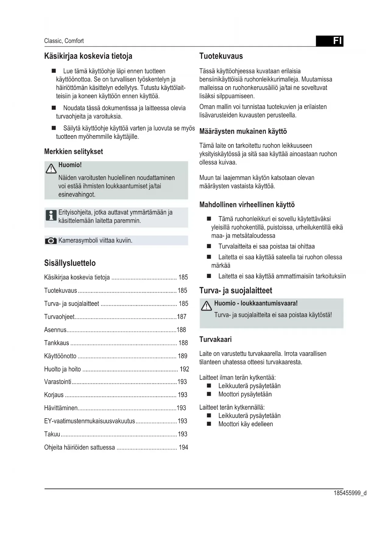 - Kontroller skjærekniven Ved feil som ikke er oppført i denne tabellen eller som du selv ikke kan rette opp, kan du ta kontakt med vår kundeservice.FI 185455999_d Classic, Comfort Sisällysluettelo Käsikirjaa koskevia tietoja ......................................... 185 Tuotekuvaus .............................................................. 185 Turva- ja suojalaitteet ................................................ 185 Turvaohjeet ................................................................ 187 Asennus ..................................................................... 188 Tankkaus ................................................................... 188 Käyttöönotto .............................................................. 189 Huolto ja hoito ............................................................ 192 Varastointi .................................................................. 193 Korjaus ...................................................................... 193 Hävittäminen .............................................................. 193 EY-vaatimustenmukaisuusvakuutus .......................... 193 Takuu ......................................................................... 193 Ohjeita häiriöiden sattuessa ...................................... 194 Käsikirjaa koskevia tietoja Lue tämä käyttöohje läpi ennen tuotteen käyttöönottoa. Se on turvallisen työskentelyn ja häiriöttömän käsittelyn edellytys. Tutustu käyttölait- teisiin ja koneen käyttöön ennen käyttöä. Noudata tässä dokumentissa ja laitteessa olevia turvaohjeita ja varoituksia. Säilytä käyttöohje käyttöä varten ja luovuta se myös tuotteen myöhemmille käyttäjille. Merkkien selitykset Huomio! Näiden varoitusten huolellinen noudattaminen voi estää ihmisten loukkaantumiset ja/tai esinevahingot. Erityisohjeita, jotka auttavat ymmärtämään ja käsittelemään laitetta paremmin. Kamerasymboli viittaa kuviin. Tuotekuvaus Tässä käyttöohjeessa kuvataan erilaisia bensiinikäyttöisiä ruohonleikkurimalleja. Muutamissa malleissa on ruohonkeruusäiliö ja/tai ne soveltuvat lisäksi silppuamiseen. Oman mallin voi tunnistaa tuotekuvien ja erilaisten lisävarusteiden kuvausten perusteella. Määräysten mukainen käyttö Tämä laite on tarkoitettu ruohon leikkuuseen yksityiskäytössä ja sitä saa käyttää ainoastaan ruohon ollessa kuivaa. Muun tai laajemman käytön katsotaan olevan määräysten vastaista käyttöä. Mahdollinen virheellinen käyttö Tämä ruohonleikkuri ei sovellu käytettäväksi yleisillä ruohokentillä, puistoissa, urheilukentillä eikä maa- ja metsätaloudessa Turvalaitteita ei saa poistaa tai ohittaa Laitetta ei saa käyttää sateella tai ruohon ollessa märkää Laitetta ei saa käyttää ammattimaisiin tarkoituksiin Turva- ja suojalaitteet Huomio - loukkaantumisvaara! Turva- ja suojalaitteita ei saa poistaa käytöstä! Turvakaari Laite on varustettu turvakaarella. Irrota vaarallisen tilanteen uhatessa otteesi turvakaaresta. Laitteet ilman terän kytkentää: Leikkuuterä pysäytetään Moottori pysäytetään Laitteet terän kytkennällä: Leikkuuterä pysäytetään Moottori käy edelleenFI Alkuperäisen käyttöohjeen käännös Bensiinikäyttöinen ruohonleikkuri1 Käynnistysnaru 10 Vario-vaihteisto*2 Pyöräveto* 11 Käyttöohje3 Turvakaari 12 Ulostulo-osa*4 Ergonominen korkeudensäätö* 13 Sulkukansi*5 Täyttötason näyttö* 14 Silppuamislaite*6 Suojaläppä 15 Virtalukko sähkökäynnistystä varten*7 Ruohonkerääjä 16 Pikaoppaan8 Leikkuukorkeuden säätö 17 Kaasun kauko-ohjaus*9 Terän kytkentä* * riippuen mallistaLaitteessa olevat symbolitHuomio!Käsittelyssä on noudatettava ehdotonta varovaisuutta.Irrota ennen leikkuuterien kanssa työskentelyä sytytystulpan pistoke.Lue käyttöohje ennen käyttöönottoa!STARTVirtalukko sähkökäynnistystä varten:Poista avain virtalukosta ennen huolto- ja korjaustöitä!Vaara-alueella ei saa oleskella muita ihmisiä!PikaoppaanVapauta moottorijarru.Jalat ja kädet on pidettävä kaukana leikkuriterien alueelta!PikaoppaanKytke pyöräveto päälle.Pysy etäällä vaaralliselta alueelta.PikaoppaanKaasun kauko-ohjaus käynnistys / pysäytys.