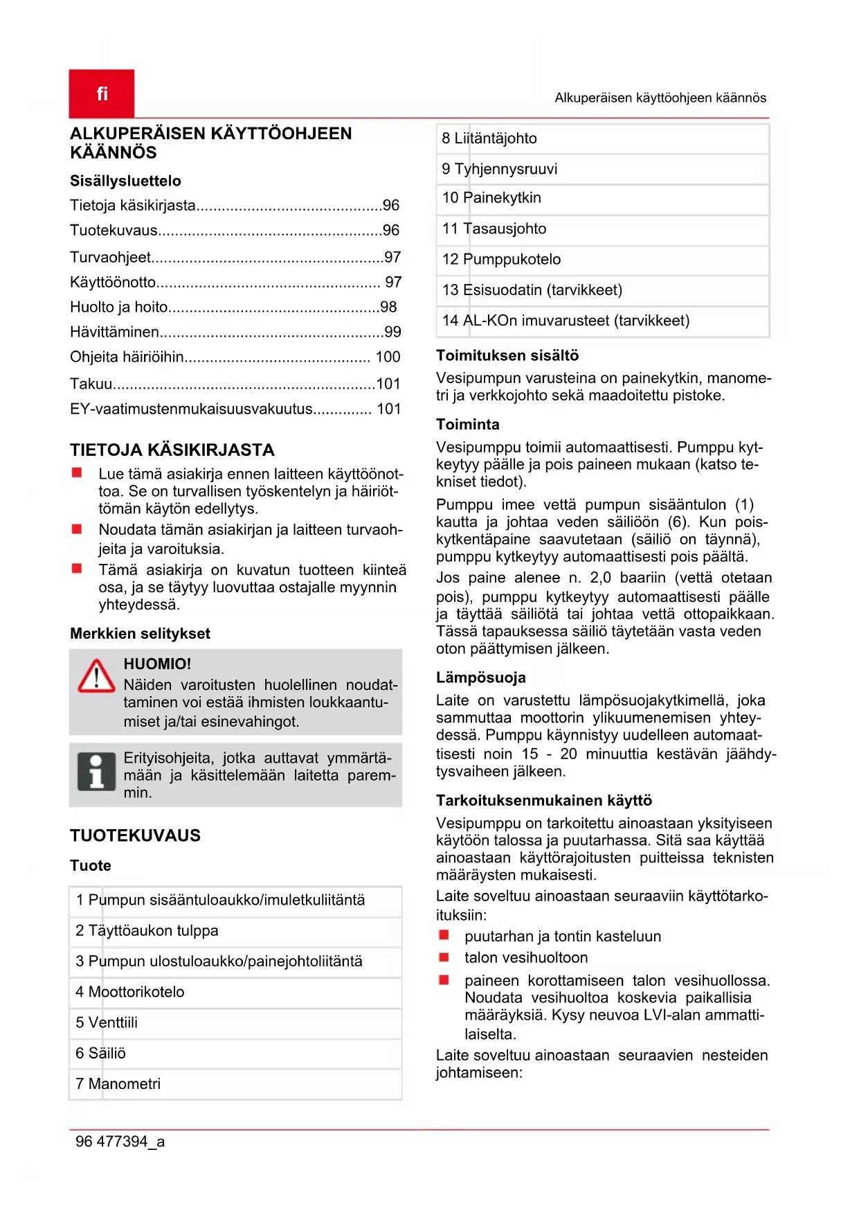 Lue tämä asiakirja ennen laitteen käyttöönot- toa. Se on turvallisen työskentelyn ja häiriöt- tömän käytön edellytys. Noudata tämän asiakirjan ja laitteen turvaoh- jeita ja varoituksia. Tämä asiakirja on kuvatun tuotteen kiinteä osa, ja se täytyy luovuttaa ostajalle myynnin yhteydessä. Merkkien selitykset HUOMIO! Näiden varoitusten huolellinen noudat- taminen voi estää ihmisten loukkaantu- miset ja/tai esinevahingot. ADVICE Erityisohjeita, jotka auttavat ymmärtä- mään ja käsittelemään laitetta parem- min. TUOTEKUVAUS Tuote 1 Pumpun sisääntuloaukko/imuletkuliitäntä 2 Täyttöaukon tulppa 3 Pumpun ulostuloaukko/painejohtoliitäntä 4 Moottorikotelo 5 Venttiili 6 Säiliö 7 Manometri 8 Liitäntäjohto 9 Tyhjennysruuvi 10 Painekytkin 11 Tasausjohto 12 Pumppukotelo 13 Esisuodatin (tarvikkeet) 14 AL-KOn imuvarusteet (tarvikkeet) Toimituksen sisältö Vesipumpun varusteina on painekytkin, manome- tri ja verkkojohto sekä maadoitettu pistoke. Toiminta Vesipumppu toimii automaattisesti. Pumppu kyt- keytyy päälle ja pois paineen mukaan (katso te- kniset tiedot). Pumppu imee vettä pumpun sisääntulon (1) kautta ja johtaa veden säiliöön (6). Kun pois- kytkentäpaine saavutetaan (säiliö on täynnä), pumppu kytkeytyy automaattisesti pois päältä. Jos paine alenee n. 2,0 baariin (vettä otetaan pois), pumppu kytkeytyy automaattisesti päälle ja täyttää säiliötä tai johtaa vettä ottopaikkaan. Tässä tapauksessa säiliö täytetään vasta veden oton päättymisen jälkeen. Lämpösuoja Laite on varustettu lämpösuojakytkimellä, joka sammuttaa moottorin ylikuumenemisen yhtey- dessä. Pumppu käynnistyy uudelleen automaat- tisesti noin 15 - 20 minuuttia kestävän jäähdy- tysvaiheen jälkeen. Tarkoituksenmukainen käyttö Vesipumppu on tarkoitettu ainoastaan yksityiseen käytöön talossa ja puutarhassa. Sitä saa käyttää ainoastaan käyttörajoitusten puitteissa teknisten määräysten mukaisesti. Laite soveltuu ainoastaan seuraaviin käyttötarko- ituksiin: puutarhan ja tontin kasteluun talon vesihuoltoon paineen korottamiseen talon vesihuollossa. Noudata vesihuoltoa koskevia paikallisia määräyksiä. Kysy neuvoa LVI-alan ammatti- laiselta. Laite soveltuu ainoastaan seuraavien nesteiden johtamiseen:Tuotekuvaus 477394_a 97 puhdas vesi sadevesi Mahdollinen väärä käyttö Laitetta ei saa käyttää yhtäjaksoisesti. Laite ei sovellu seuraavien nesteiden johtamiseen: juomavesi suolapitoinen vesi elintarvikkeet aggressiiviset aineet, kemikaalit syövyttävät, syttyvät, räjähtävät tai kaasuun- tuvat nesteet nesteet, jotka joiden lämpötila on yli 35 °C hiekkapitoinen vesi ja hiovat aineet TURVAOHJEET HUOMIO! Laitetta saa käyttää ainoastaan määr- äykset DIN/VDE 0100, osa 737, 738 ja 702 (uima-altaat) täyttävien sähkölait- teiden yhteydessä. Laitteen varmistami- seksi tulee asentaa 10 A:n suojajohdin sekä vikavirtakatkaisin, jonka nimellisvi- kavirta on 10/30 mA. HUOMIO! Arvokilvessä olevien verkkojännite- ja virtatyyppitietojen on vastattava käy- tettävän sähköverkon tietoja. HUOMIO! Käytä vain 3 x 1,5 mm²:n H07RN-Flaa- tuista (standardin DIN 57282/57245 mu- kaan) jatkojohtoa, jonka pistokeliitäntä on roiskesuojattu. Kaapelikelojen on ol- tava täysin auki rullattuja. HUOMIO! Laitteeseen ei saa tehdä itse mitään muutoksia tai korjauksia. HUOMIO! Vaurioituneita laitteita ei saa käyttää. Laitteen korjaukset tulee tehdä valmista- jan omassa asiakaspalvelu-huollossa. HUOMIO! Älä koskaan nosta, kuljeta tai kiinnitä lai- tetta liitäntäjohdosta. Älä irrota pistoketta pistorasiasta liitäntäjohdosta vetämällä. HUOMIO! Irrota verkkopistoke ennen huolto-, hoi- toja korjaustöitä sekä häiriöiden yhtey- dessä. Suojaa verkkopistoke kosteu- delta. HUOMIO! Laitetta saa käyttää ainoastaan määr- äysten mukaisesti. Varmista ennen käyt- töä, että: laite, säiliö, liitäntäjohto ja verkko- pistoke ovat moitteettomassa kun- nossa. HUOMIO! Kuuman veden aiheuttamaloukkaan- tumisvaara! Kun laitetta käytetään pitkään (>10 min) painepuolen ollessa suljettuna, pum- pussa oleva vesi voi kuumentua voimak- kaasti. Tämä vaara voi aiheutua seuraavista sy- istä: painepuoli suljettu veden puute imujohdossa epäasianmukaisesti suoritettu asen- nus viallinen painekytkin Tällöin: kytke pumppu irti verkosta anna pumpun ja veden jäähtyä tarkasta veden määrä imupuolella tarkasta johtojen tiiviys tarkasta asennus tarkasta painekytkin ota pumppu uudelleen käyttöön vasta sitten, kun puutteet on korjattu Lapset ja henkilöt, jotka eivät ole tutustuneet käyttöohjeeseen, eivät saa käyttää laitetta