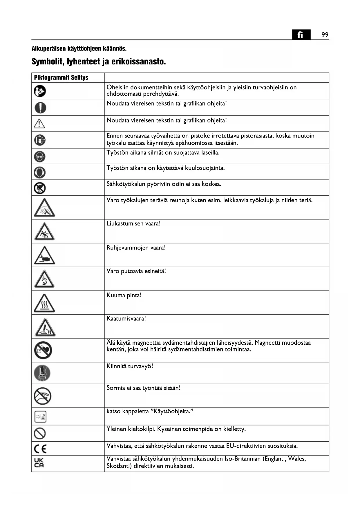 Alkuperäisen käyttöohjeen käännös. Symbolit, lyhenteet ja erikoissanasto. Piktogrammit Selitys Oheisiin dokumentteihin sekä käyttöohjeisiin ja yleisiin turvaohjeisiin on ehdottomasti perehdyttävä. Noudata viereisen tekstin tai grafiikan ohjeita! Noudata viereisen tekstin tai grafiikan ohjeita! Ennen seuraavaa työvaihetta on pistoke irrotettava pistorasiasta, koska muutoin työkalu saattaa käynnistyä epähuomiossa itsestään. Työstön aikana silmät on suojattava laseilla. Työstön aikana on käytettävä kuulosuojainta. Sähkötyökalun pyöriviin osiin ei saa koskea. Varo työkalujen teräviä reunoja kuten esim. leikkaavia työkaluja ja niiden teriä. Liukastumisen vaara! Ruhjevammojen vaara! Varo putoavia esineitä! Kuuma pinta! Kaatumisvaara! Älä käytä magneettia sydämentahdistajien läheisyydessä. Magneetti muodostaa kentän, joka voi häiritä sydämentahdistimien toimintaa. Kiinnitä turvavyö! Sormia ei saa työntää sisään! katso kappaletta ”Käyttöohjeita.” Yleinen kieltokilpi. Kyseinen toimenpide on kielletty. Vahvistaa, että sähkötyökalun rakenne vastaa EU-direktiivien suosituksia. Vahvistaa sähkötyökalun yhdenmukaisuuden Iso-Britannian (Englanti, Wales, Skotlanti) direktiivien mukaisesti.100