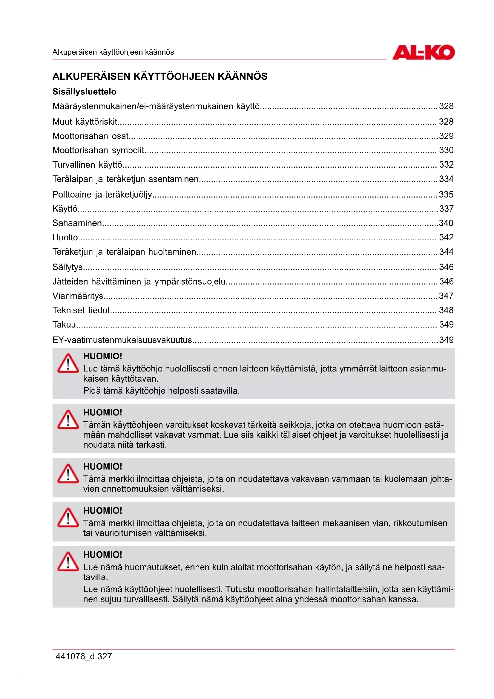 - Intertek Deutschland GmbH Stangenstr. 1 D-70771 Leinfelden-Echterdingen Nr. 0905 Intertek Deutschland GmbH Stangenstr. 1 70771 Leinfelden-Echterdingen Nr. 0905 Wolfgang Hergeth Managing DirectorAlkuperäisen käyttöohjeen käännös 441076_d 327 ALKUPERÄISEN KÄYTTÖOHJEEN KÄÄNNÖS Sisällysluettelo Määräystenmukainen/ei-määräystenmukainen käyttö p. 328