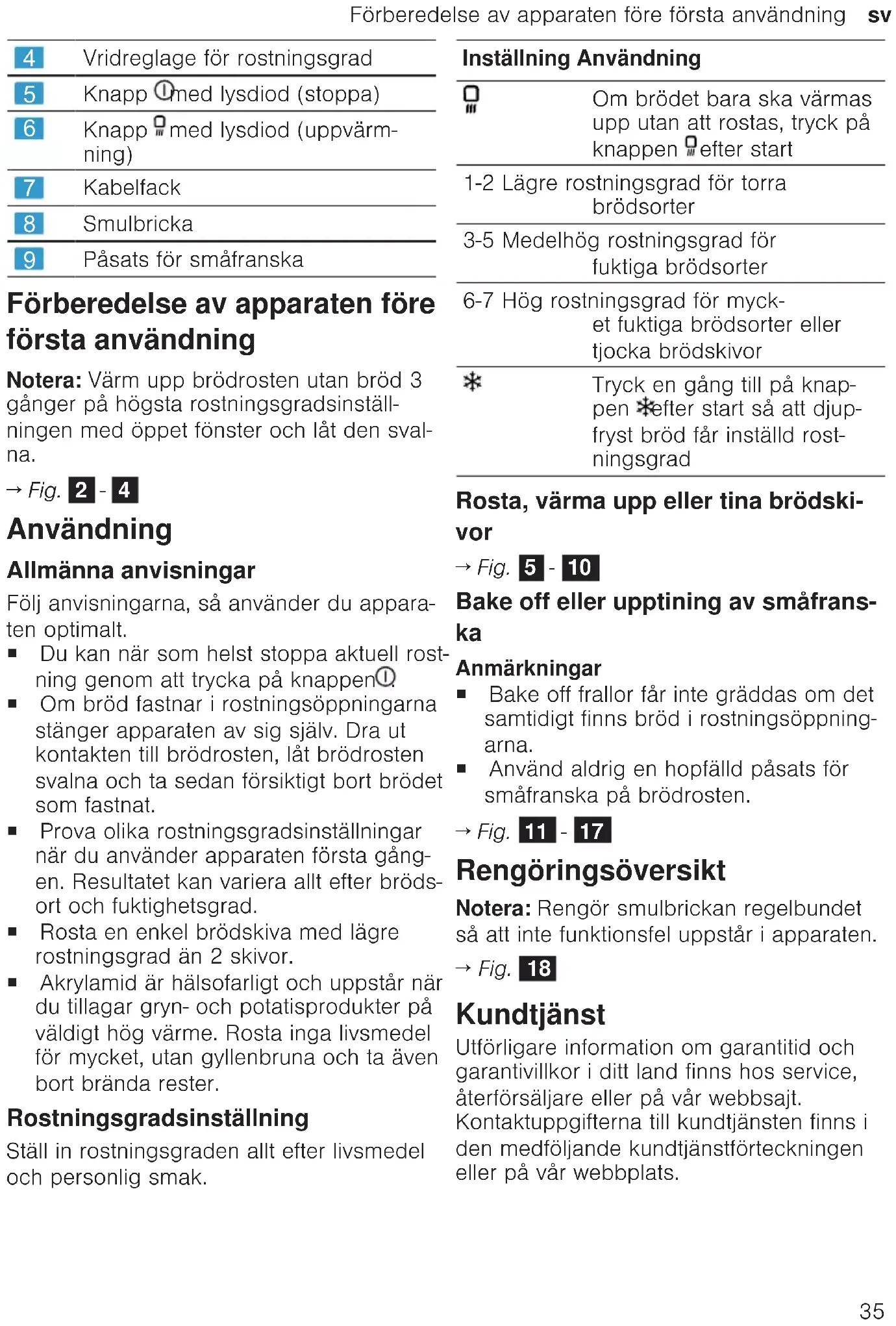 Turvallisuus ¡ Lue tämä ohje huolellisesti. ¡ Säilytä ohjeet ja tuotetiedot myöhempää käyttötarvetta tai mahdollista uutta omistajaa varten. Käytä laitetta vain: ¡ valvonnan alaisena. ¡ yksityisissä kotitalouksissa ja kodinomaisen ympäristön suljetuissa tiloissa huonelämpötilassa. ¡ enintään 2000m korkeudella merenpinnasta. ¡ paahtoleivän, leivän, sämpylöiden ja muiden leivänpaahtimessa valmistettavaksi tarkoitettujen elintarvikkeiden paahtamiseen, uudelleenlämmittämiseen tai sulattamiseen. Laite on irrotettava verkkovirrasta aina, kun sen käyttö lopetetaan, sitä ei voida valvoa, ennen puhdistusta sekä häiriötilanteissa. Kahdeksanvuotiaat ja sitä vanhemmat lapset ja sellaiset henkilöt, joilla on alentunut fyysinen, aistillinen tai henkinen toimintakyky tai joilta puuttuu kokemusta ja/tai tietoa laitteen käytöstä, saavat käyttää laitetta vain valvonnan alaisena tai kun heille on neuvottu, miten laitetta käytetään turvallisesti ja he ovat ymmärtäneet laitteesta aiheutuvat vaarat. Lapset eivät saa leikkiä laitteella. Lapset eivät saa puhdistaa tai huoltaa laitetta, paitsi jos he ovat vähintään kahdeksanvuotiaita ja aikuinen valvoo toimenpiteitä. Pidä alle kahdeksanvuotiaat lapset poissa laitteen ja liitäntäjohdon läheltä. ▶ Liitä laite ainoastaan tyyppikilvessä olevien tietojen mukaiseen sähköverkkoon. ▶ Liitä laite vain määräysten mukaisesti asennetun, maadoitetun pistorasian kautta vaihtovirtaverkkoon. ▶ Talon suojamaadoitusjärjestelmän täytyy olla asennettu määräysten mukaisesti. ▶ Älä syötä laitteeseen virtaa ulkoisella kytkentälaitteella, esimerkiksi kellokytkimellä tai kauko-ohjaimella. ▶ Laitteen korjaustöitä saavat tehdä vain alan ammattilaiset. ▶ Jos laitteen verkkojohto vaurioituu, sen saa turvallisuussyistä vaihtaa vain valmistaja, sen huoltopalvelu tai vastaavan pätevyyden omaava henkilö.Turvallisuus fi