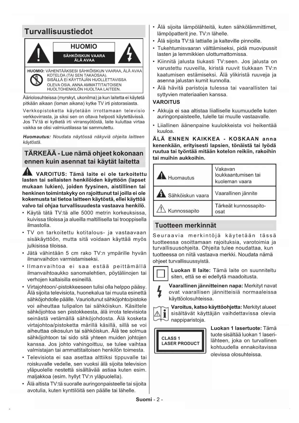 (d) 43” 50”, 55”, 65”Ruuvin syvyys (c)min. 9 mm 12 mmmax. 10 mm 15 mmHalkaisija M4~ M6~Huomautus: Ruuvit, joita tarvitaan television kiinnittämiseen seinäkiinnikkeeseen eivät sisälly toimitukseen. Johdanto Kiitos, että olet valinnut tuotteemme. Voit kohta nauttia uudesta televisiostasi. Lue nämä ohjeet huolellisesti. Ne sisältävät tärkeitä ohjeita, jotka auttavat TV:n käyttämisessä turvallisesti ja varmistavat oikean asennuksen ja käytön. Mukana tulevat varusteet