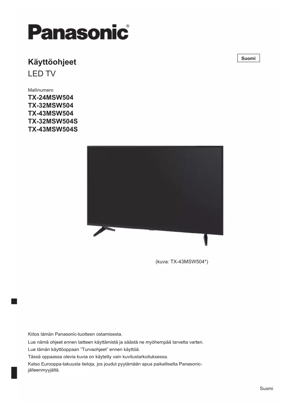 Käyttöohjeet LED TV Suomi Kiitos tämän Panasonic-tuotteen ostamisesta. Lue nämä ohjeet ennen laitteen käyttämistä ja säästä ne myöhempää tarvetta varten. Lue tämän käyttöoppaan ”Turvaohjeet” ennen käyttöä. Tässä oppaassa olevia kuvia on käytetty vain kuvitustarkoituksessa. Katso Eurooppa-takuusta tietoja, jos joudut pyytämään apua paikalliselta Panasonic- jälleenmyyjältä. (kuva: TX-43MSW504*) SuomiSuomi