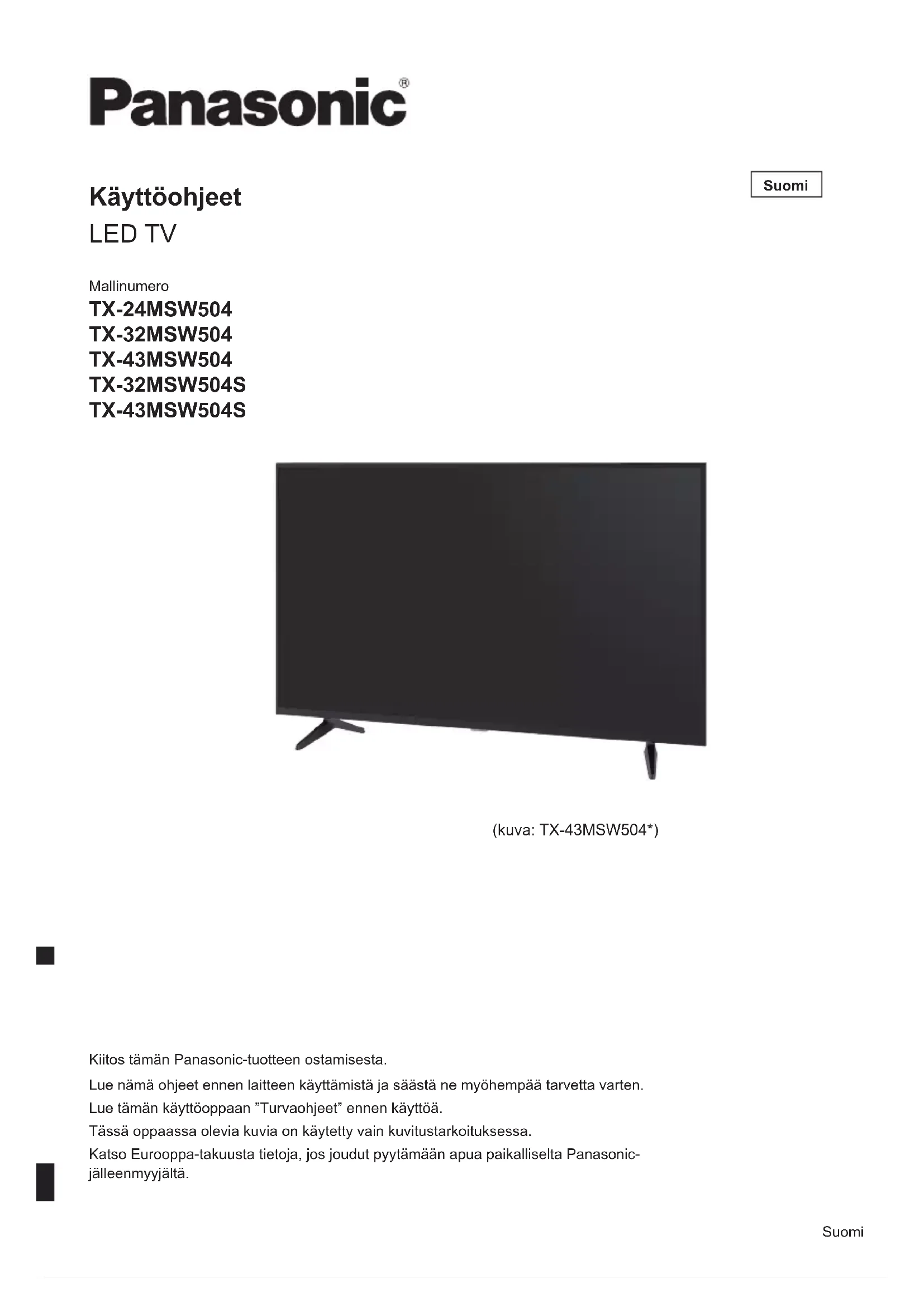Käyttöohjeet LED TV Suomi Kiitos tämän Panasonic-tuotteen ostamisesta. Lue nämä ohjeet ennen laitteen käyttämistä ja säästä ne myöhempää tarvetta varten. Lue tämän käyttöoppaan ”Turvaohjeet” ennen käyttöä. Tässä oppaassa olevia kuvia on käytetty vain kuvitustarkoituksessa. Katso Eurooppa-takuusta tietoja, jos joudut pyytämään apua paikalliselta Panasonic- jälleenmyyjältä. (kuva: TX-43MSW504*) SuomiSuomi