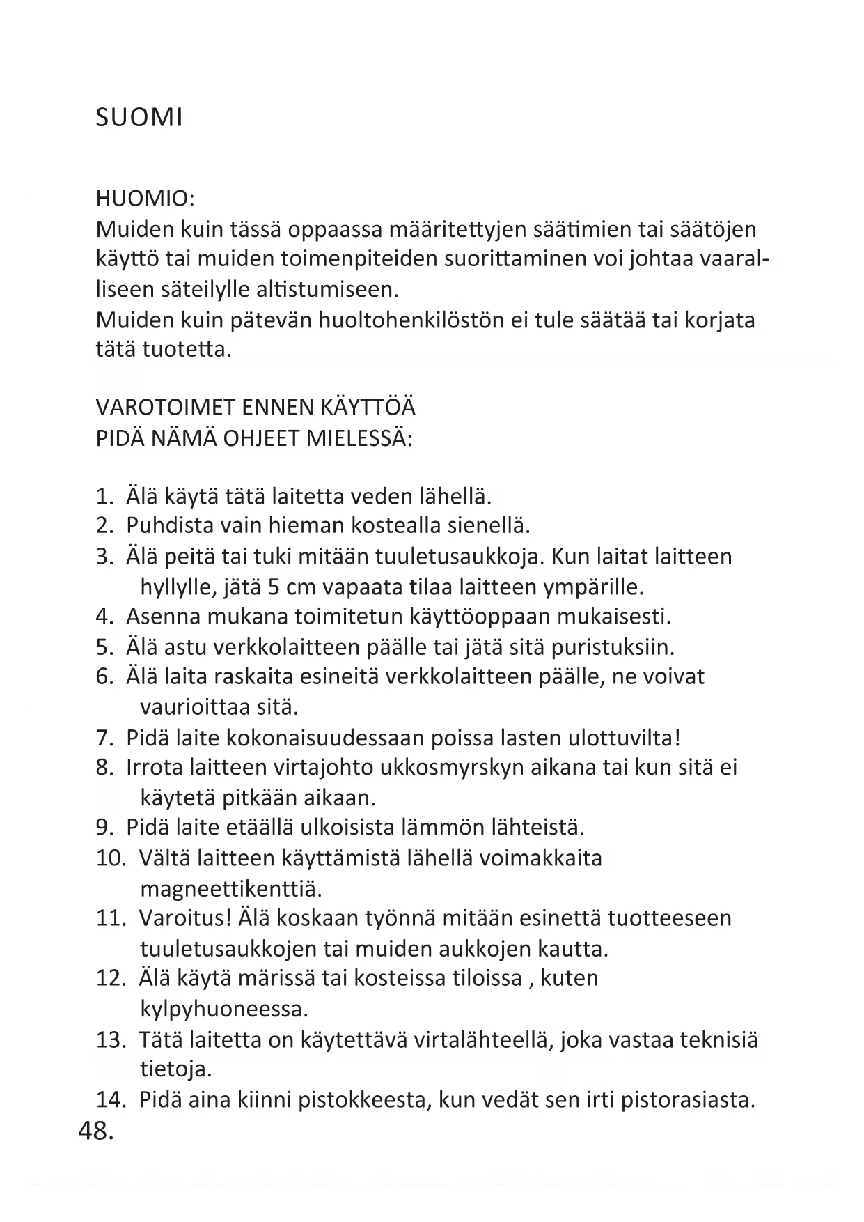 14. Pidä aina kiinni pistokkeesta, kun vedät sen irti pistorasiasta.49.