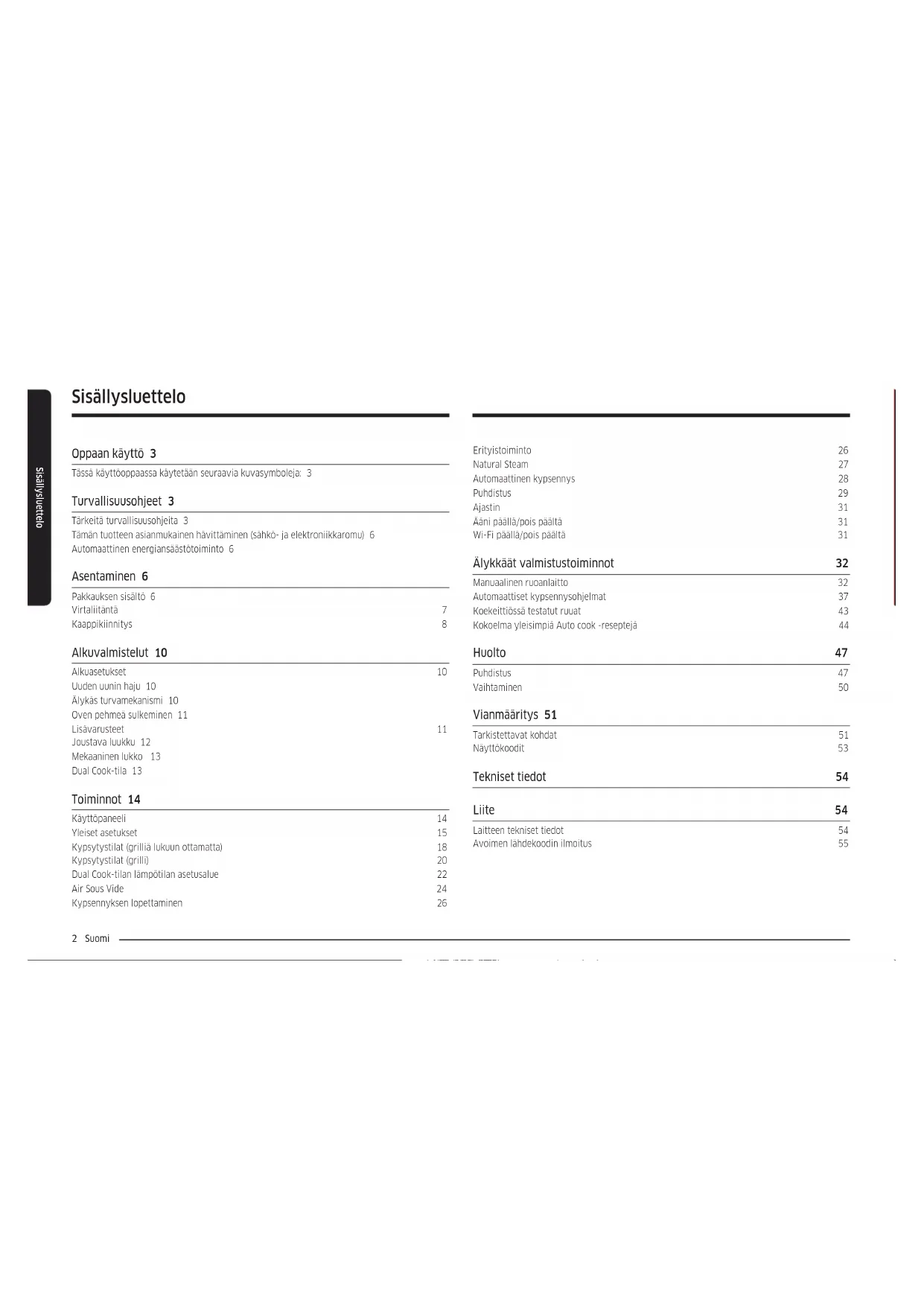 Chamada para a rede xa nacional Dias úteis das 9h às 20h www.samsung.com/pt/support SPAIN 91 175 00 15 www.samsung.com/es/support SWEDEN 0771-400 300 www.samsung.com/se/support SWITZERLAND 0800 726 786 www.samsung.com/ch/support (German) www.samsung.com/ch_fr/support (French) UK 0333 000 0333 www.samsung.com/uk/support IRELAND (EIRE) 0818 717100 www.samsung.com/ie/support DG68-01413A-03Kalusteuuni Käyttö- ja asennusohje NV7B441****/ NV7B442****/ NV7B443****/ NV7B444****/ NV7B445****/ NV7B441**C*/ NV7B442**C*/ NV7B444**C*/ NV7B451****/ NV7B452****/ NV7B453****/ NV7B454****/ NV7B455****2 Suomi Sisällysluettelo Sisällysluettelo Oppaan käyttö 3 Tässä käyttöoppaassa käytetään seuraavia kuvasymboleja: 3 Turvallisuusohjeet 3 Tärkeitä turvallisuusohjeita 3 Tämän tuotteen asianmukainen hävittäminen (sähkö- ja elektroniikkaromu) 6 Automaattinen energiansäästötoiminto 6 Asentaminen 6 Pakkauksen sisältö 6 Virtaliitäntä 7 Kaappikiinnitys 8 Alkuvalmistelut 10 Alkuasetukset 10 Uuden uunin haju 10 Älykäs turvamekanismi 10 Oven pehmeä sulkeminen 11 Lisävarusteet 11 Joustava luukku 12 Mekaaninen lukko 13 Dual Cook-tila 13 Toiminnot 14 Käyttöpaneeli 14 Yleiset asetukset 15 Kypsytystilat (grilliä lukuun ottamatta) 18 Kypsytystilat (grilli) 20 Dual Cook-tilan lämpötilan asetusalue 22 Air Sous Vide 24 Kypsennyksen lopettaminen 26 Erityistoiminto 26 Natural Steam 27 Automaattinen kypsennys 28 Puhdistus 29 Ajastin 31 Ääni päällä/pois päältä 31 Wi-Fi päällä/pois päältä 31 Älykkäät valmistustoiminnot 32 Manuaalinen ruoanlaitto 32 Automaattiset kypsennysohjelmat 37 Koekeittiössä testatut ruuat 43 Kokoelma yleisimpiä Auto cook -reseptejä 44 Huolto 47 Puhdistus 47 Vaihtaminen 50 Vianmääritys 51 Tarkistettavat kohdat 51 Näyttökoodit 53 Tekniset tiedot 54 Liite 54 Laitteen tekniset tiedot 54 Avoimen lähdekoodin ilmoitus 55Suomi 3 Oppaan käyttö Turvallisuusohjeet Tämän uunin saa asentaa vain valtuutettu sähköasentaja. Asentaja on vastuussa laitteen kytkemisestä verkkovirtaan noudattaen asianmukaisia turvallisuussuosituksia. Tärkeitä turvallisuusohjeita VAROITUS Tätä laitetta ei ole tarkoitettu sellaisten henkilöiden (mukaan lukien lapset) käyttöön, joilla on heikentyneet aistit, fyysiset, tai psyykkiset kyvyt tai joilla ei ole kokemusta tai tietoa, ellei heidän turvallisuudestaan vastaava henkilö ole valvonut tai opastanut heitä laitteen käytössä. Lapsia on valvottava, jotta he eivät leiki laitteella. Irrotuslaitteet on sisällytettävä kiinteään johdotukseen johdotussääntöjen mukaisesti. Tämä laite on kytkettävä irti verkosta asennuksen jälkeen. Kytkentä voidaan toteuttaa siten, että pistotulppa on saatavilla tai että kiinteään johdotukseen liitetään kytkin johdotussääntöjen mukaisesti. Jos verkkojohto on vaurioitunut, valmistajan, sen huoltoedustajan tai vastaavan pätevyyden omaavan henkilön on vaihdettava se vaaran välttämiseksi. Oppaan käyttö Kiitos, että valitsit Samsungin kalusteuunin. Tämä käyttöopas sisältää tärkeitä turvallisuustietoja ja ohjeita, joiden tarkoituksena on auttaa sinua laitteen käytössä ja huollossa. Lue tämä käyttöopas ennen uunin käyttöä ja säilytä tämä ohjekirja myöhempää käyttöä varten. Tässä käyttöoppaassa käytetään seuraavia kuvasymboleja: VAROITUS Vaarat tai vaaralliset käytännöt, jotka voivat aiheuttaa vakavia henkilövahinkoja, kuoleman ja/tai omaisuusvahinkoja. HUOMIO Vaarat tai vaaralliset käytännöt, jotka voivat aiheuttaa henkilövahinkoja ja/tai omaisuusvahinkoja. HUOM Hyödyllisiä vinkkejä, suosituksia tai tietoja, jotka auttavat käyttäjiä tuotteen käsittelyssä.4 Suomi Turvallisuusohjeet Turvallisuusohjeet Ilmoitettu kiinnitysmenetelmä ei saa perustua liimojen käyttöön, koska niitä ei pidetä luotettavana kiinnitysmenetelmänä. Tätä laitetta voivat käyttää vähintään 8-vuotiaat lapset ja henkilöt, joiden aistit, fyysiset, tai henkiset kyvyt ovat heikentyneet tai joilla ei ole riittävästi kokemusta tai tietoa, jos heitä on valvottu tai opastettu laitteen turvallisessa käytössä ja jos he ymmärtävät siihen liittyvät vaarat. Lapset eivät saa leikkiä laitteella. Lapset eivät saa suorittaa puhdistusta ja huoltoa ilman valvontaa. Pidä laite ja sen johto alle 8-vuotiaiden lasten ulottumattomissa. Laite kuumenee käytön aikana. On varottava koskettamasta uunin sisällä olevia lämmityselementtejä. VAROITUS: Käsiksi päästävät osat kuumenevat käytössä. Pienet lapset on pidettävä poissa. Älä käytä kovia hankaavia puhdistusaineita tai teräviä metallikaapimia uunin luukun lasin puhdistamiseen, koska ne voivat naarmuttaa pintaa, mikä voi johtaa lasin rikkoutumiseen. Jos tässä laitteessa on puhdistustoiminto, ylimääräiset roiskeet on poistettava ennen puhdistusta, eikä kaikkia astioita saa jättää uuniin höyrypuhdistuksen tai itsepuhdistuksen aikana. Puhdistustoiminto riippuu mallista. Jos tässä laitteessa on puhdistustoiminto, puhdistusolosuhteiden aikana pinnat voivat kuumentua tavallista kuumemmiksi, ja lapset on pidettävä poissa. Jotkin eläimet, erityisesti linnut, voivat olla herkkiä pyrolyyttisen puhdistusprosessin aikana syntyville höyryille ja paikallisille lämpötilan vaihteluille, ja ne olisi siirrettävä prosessin ajaksi sopivaan, hyvin tuuletettuun tilaan. Tuuleta huone pyropuhdistuksen aikana ja sen jälkeen. Puhdistustoiminto riippuu mallista. Käytä vain tähän uuniin suositeltua paistomittaria. (Vain paistomittari-malli) Höyrypuhdistinta ei saa käyttää. VAROITUS: Varmista, että laite on kytketty pois päältä ennen lampun vaihtamista, jotta vältetään sähköiskun mahdollisuus. Laitetta ei saa asentaa koristeoven taakse ylikuumenemisen välttämiseksi. VAROITUS: Laite ja sen käytettävissä olevat osat kuumenevat käytön aikana. On varottava koskemasta lämmityselementteihin. Alle 8-vuotiaat lapset on pidettävä poissa, ellei heitä jatkuvasti