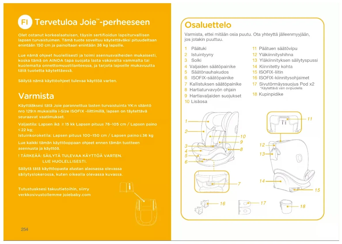 -perheeseen Olet ostanut korkealaatuisen﹐ täysin sertifioidun lapsiturvallisen lapsen turvaistuimen. Tämä tuote soveltuu käytettäväksi pituudeltaan enintään 150 cm ja painoltaan enintään 36 kg lapsille.Lue nämä ohjeet huolellisesti ja toimi asennusvaiheiden mukaisesti﹐ koska tämä on AINOA tapa suojata lasta vakavalta vammalta tai kuolemalta onnettomuustilanteessa﹐ ja tarjota lapselle mukavuutta tätä tuotetta käytettäessä.Säilytä nämä käyttöohjeet tulevaa käyttöä varten. Varmista Käyttääksesi tätä Joie parannettua lasten turvaistuinta YK:n sääntö nro 129:n mukaisilla i-Size ISOFIX -liittimillä﹐ lapsen on täytettävä seuraavat vaatimukset.Valjastila: Lapsen ikä 15 kk Lapsen pituus 76–105 cm / Lapsen paino 22 kg;Istuinkoroketila: Lapsen pituus 100–150 cm / Lapsen paino 36 kgLue kaikki tämän käyttöoppaan ohjeet ennen tämän tuotteen asennusta ja käyttöä.! TÄRKEÄÄ: SÄILYTÄ TULEVAA KÄYTTÖÄ VARTEN.LUE HUOLELLISESTI.Säilytä tätä käyttöopasta alustan alaosassa olevassa säilytyslokerossa﹐ kuten oikealla olevassa kuvassa.Tutustuaksesi takuutietoihin﹐ siirry verkkosivustollemme joiebaby.com Osaluettelo 1 Päätuki2 Istuintyyny3 Solki4 Valjaiden säätöpainike 5 Säätönauhakudos6 ISOFIX-säätöpainike7 Kallistuksen säätöpainike8 Hartiaturvavyön ohjain9 Hartiavaljaiden suojukset10 Lisäosa11 Päätuen säätövipu12 Yläkiinnityshihna13 Yläkiinnityksen säilytyspussi14 Kiinnitetty kohta15 ISOFIX-liitin16 ISOFIX-kiinnitysohjaimet17 Sivutörmäyssuojus Pod x2*Käytettävä vain ovipuolella18 KupinpidikeVarmista, ettei mitään osia puutu. Ota yhteyttä jälleenmyyjään, jos jotakin puuttuu.