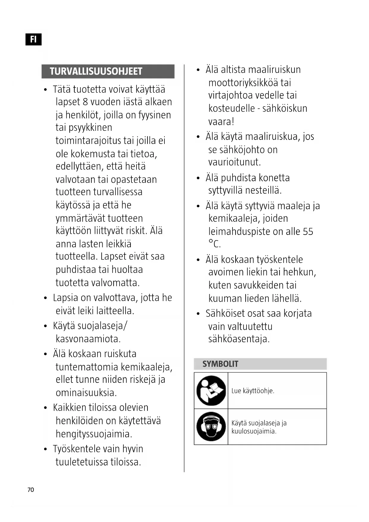 - Sähköiset osat saa korjata vain valtuutettu sähköasentaja. SYMBOLIT Lue käyttöohje. Käytä suojalaseja ja kuulosuojaimia. TURVALLISUUSOHJEET