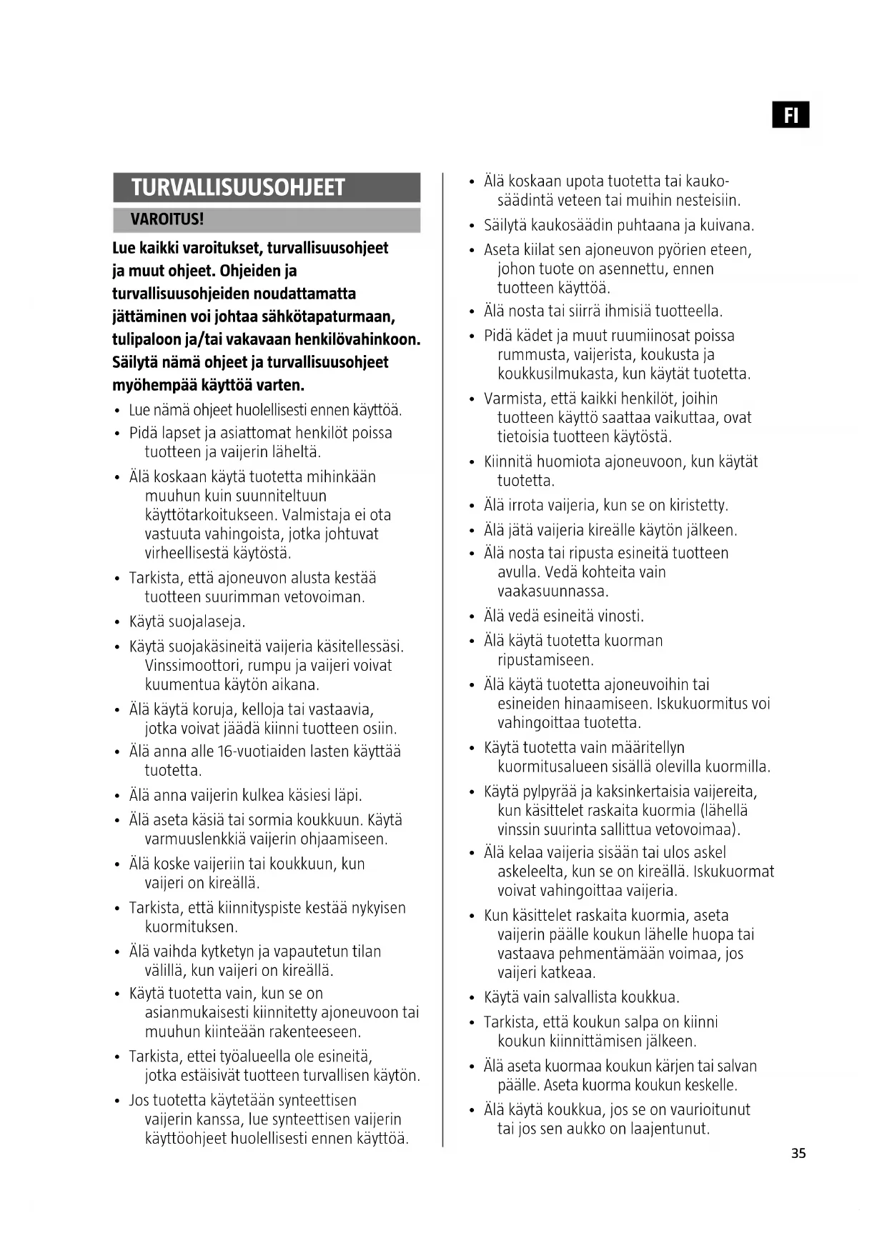 - Älä siirrä ajoneuvoa kuorman siirtämiseksi. Käytä tuotetta ainoastaan vetämään kuormia.