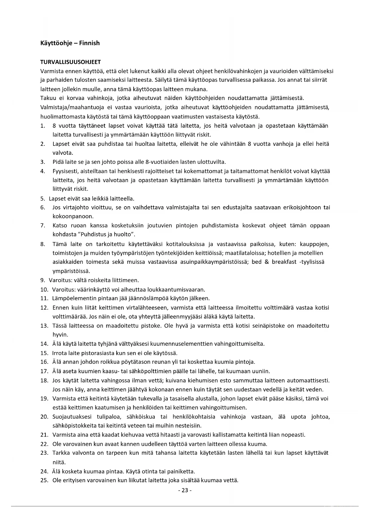 23. Tarkka valvonta on tarpeen kun mitä tahansa laitetta käytetään lasten lähellä tai kun lapset käyttävät