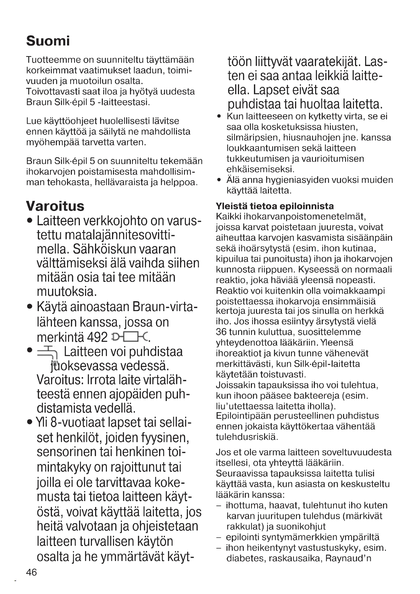 - Jos olet tottunut epilointiin, voit korvata hierontaosan kärkiosalla (1b), joka takaa tarkemman ihokontaktin ja mukautuu paremmin kaikkiin kehon alueisiin. 3 Säärien epilointi Epiloi sääret säären alaosasta ylöspäin. Kun epiloit polven takaa, pidä jalka suoraksi ojennettuna. 4 Kainaloiden ja bikinirajan epilointi Huomioi, että varsinkin alussa nämä alueet ovat erityisen kipuherkkiä. Sen vuoksi suosittelemme aloittamaan asetuksella «I». Toistuvassa käytössä kivun tunne vähenee. Puhdista epiloitava alue perusteellisesti jäämistä (kuten deodorantista) ennen 90340813_SE5_Power_MN.indd 4790340813_SE5_Power_MN.indd 47 02.06.22 10:4902.06.22 10:4948 epilointia. Taputtele sen jälkeen iho kuivaksi pyyhkeellä. Pidä kainaloita epiloidessasi käsivartta kohotettuna, jolloin iho venyy, ja ohjaa laitetta eri suuntiin. Koska iho voi olla herkempi heti epiloinnin jälkeen, vältä käyttä- mästä ihoa ärsyttäviä aineita, kuten alkoholia sisältäviä deodorantteja. 5 Epilointipään puhdistus Irrota laitteen pistoke pistorasiasta ennen puhdistamista. Säännöllinen puhdistaminen varmistaa laitteen paremman suorituskyvyn. a Puhdistaminen harjalla: Irrota kärkikappale (1) ja harjaa se. Puhdista epilaattorin takaosan pinsetit perusteellisesti alkoholiin kostutetulla harjalla. Käännä samalla pinsettiosaa manuaalisesti. Tämä puhdistusme- netelmä varmistaa epilointipään hygieenisyyden. b Puhdistaminen juoksevan veden alla: Irrota kärkikappale. Pidä laitetta ja epilointipäätä juoksevassa vedessä. Irrota sen jälkeen epilointipää (2) painamalla vapautuspainiketta (5). Ravista sekä epilointipäätä että laitetta perusteellisesti, jotta jäljellä oleva vesi tippuu pois. Jätä molemmat osat kuivumaan. Varmista ennen uudelleen- liittämistä, että osat ovat täysin kuivia. B Ajopään käyttö Ajopää (7) on suunniteltu säärien, kainaloiden ja bikinirajan nopeaan ja tarkkaan ajamiseen, rajaukseen ja ihokarvojen leikkaamiseen 5 mm:n pituisiksi. Käytä ajopääosaa ainoastaan kuivalla iholla ja nopeusasetuksella II. a Ajaminen: valitse « ». b Rajaus: valitset « ». c Ihokarvojen ajaminen 5 mm:n pituisiksi: valitse « » ja aseta viimeistelijän kärkikappale paikalleen (I). d Puhdistaminen: Älä puhdista teräsverkkoa (II) harjalla, koska se saattaa vahingoittaa teräsverkkoa. e Ajo-osat tulee voidella säännöllisesti 3 kuukauden välein. f Vaihda teräverkko (II) ja leikkuri (III), kun huomaat ajotuloksen heikentyvän. Varaosia saa jälleenmyyjältä, Braunin asiakaspalvelusta tai osoitteesta www.service.braun.com. Älä käytä, jos teräverkko on vaurioitunut. Ympäristöseikkoihin liittyviä tietoja Tässä laitteessa on ladattavat akut. Ympäristönsuojelullisista syistä tuotetta ei saa hävittää kotitalousjätteen mukana käyttöiän päättyessä. Hävitä tuote viemällä se Braun-huoltoliikkeeseen tai asianmukaiseen keräyspisteeseen. Tiedot voivat muuttua ilman ennakkoilmoitusta. Takuu Tälle tuotteelle myönnämme 2 vuoden takuun ostopäivästä lukien Suomessa voimassa olevien alan takuuehtojen TE90 mukaan. Takuuaikana korvataan veloituksetta kaikki viat, jotka aiheutuvat materiaaliviasta tai valmistusvirheestä. Korvaus tapahtuu harkintamme mukaan korjaamalla, vaihtamalla viallinen osa tai vaihtamalla koko laite uuteen. Takuu on voimassa kaikkialla maailmassa sillä edellytyksellä, että laitetta myydään ko. maassa Braunin tai virallisen maahantuojan toimesta. Takuun piiriin eivät kuulu seuraavat viat: viat, jotka johtuvat virheellisestä käytöstä, normaalista kulumisesta tai viat, jolla on vähäinen merkitys laitteen arvoon tai toimintaan. Takuun voimassaolo lakkaa, jos laitetta korjataan muualla kuin valtuutetussa Braun-huoltoliikkeessä tai jos laitteessa käytetään muita kuin alkuperäisiä varaosia. 90340813_SE5_Power_MN.indd 4890340813_SE5_Power_MN.indd 48 02.06.22 10:4902.06.22 10:4949 Yksilöity ostokuitti riittää takuun voimassaolon osoittamiseksi: www.service.braun.com. Lisätietoa takuuseen liittyvistä asioista saa asiakaspalvelukeskuksestamme numerosta 020-377 877. 90340813_SE5_Power_MN.indd 4990340813_SE5_Power_MN.indd 49 02.06.22 10:4902.06.22 10:4950 Nasze produkty odpowiadają najwyż- szym standardom pod względem jakości, funkcjonalności i wzornictwa. Życzmy zadowolenia z użytkowania Braun Silk·épil 5. Prosimy uważnie przeczytać instrukcję przed zastosowaniem urządzenia i zachować do skorzystania w przyszłości. Braun Silk·épil 5 zaprojektowano tak, aby usuwanie zbędnego owłosienia było jak najbardziej efektywne, delikatne i proste. Ostrzeżenie