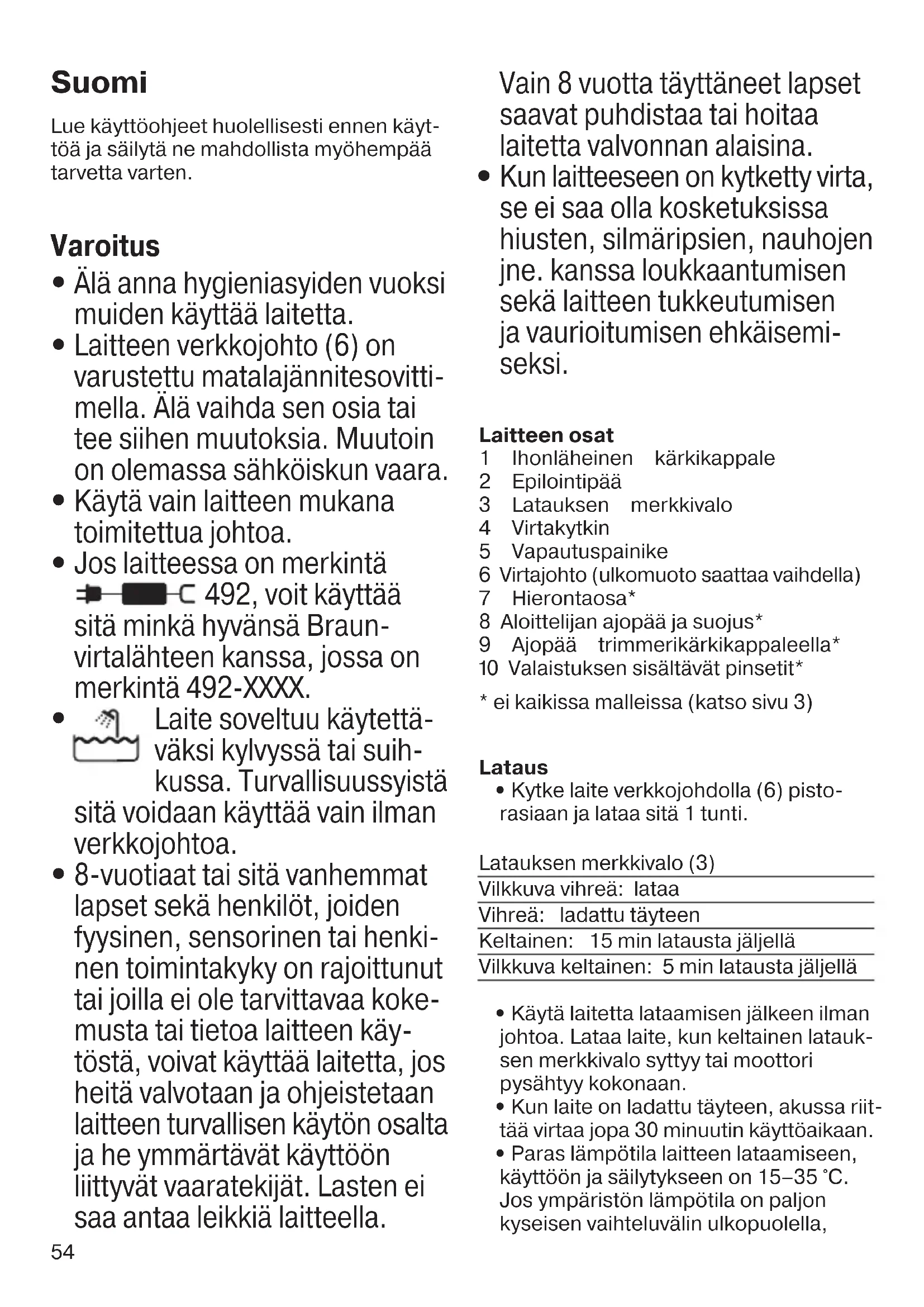 - Ohuet ihokarvat eivät välttämättä pääse kasvamaan ihon pinnalle asti. Kuorinta auttaa estämään ihokarvojen kasvun sisäänpäin hankaamalla/poistamalla pinnallista ihosolukkoa, jotta hennot ihokarvat pääsevät ihon pinnan läpi. Epilointipään puhdistus Säännöllinen epilointipään puhdistus var- mistaa hyvän hygienian. Irrota ensin käy- tetty kärkiosa (1, 7 tai 8) ja huuhtele se juoksevalla vedellä. Irrota epilointipää pai- namalla vapautuspainiketta (5). Kuiva-ajo: Puhdista pinsettiosa perusteel- lisesti puhdistusharjalla. Märkäajo: Huuhtele epilointipää juoksevalla vedellä jokaisen märkäkäytön (erityisesti geelin kanssa) jälkeen. Käynnistä epilaat- tori muutamaksi sekunniksi puhdistuksen aikana. Kiinnitä yksi kärkikappaleista pai- kalleen vasta sitten, kun epilointipää on täysin kuiva. Yleistä tietoa epiloinnista Kaikki ihokarvanpoistomenetelmät, joissa karvat poistetaan juuresta, voivat aiheuttaa ihokarvojen kasvua sisäänpäin tai ihoärsy- tystä (esim. ihon kutinaa, epämukavuutta tai punoitusta) ihon ja ihokarvojen kunnosta riippuen. Kyseessä on normaali reaktio, joka häviää yleensä nopeasti. Reaktio voi kuitenkin olla voimakkaampi, kun ihokar- voja poistetaan juuresta ensimmäisiä ker- toja tai jos sinulla on herkkä iho. Jos iho on ärtynyt vielä 36 tunnin kuluttua, suosit- telemme kääntymistä lääkärin puoleen. Yleensä ihoreaktiot ja kivun tunne vähene- vät huomattavasti, kun Silk·épil-laitetta käytetään toistuvasti. Joissakin tapauk- sissa ihon sisään pääsevät bakteerit (esimerkiksi kun laitetta liikutellaan iholla) saattavat aiheuttaa tulehduksen. Epilointi- pään perusteellinen puhdistus ennen jokaista käyttökertaa vähentää tulehdus- riskiä. Jos et ole varma laitteen soveltuvuudesta itsellesi, ota yhteyttä lääkäriin. Seuraavissa tapauksissa laitetta tulisi käyttää vasta, kun asiasta on keskusteltu lääkärin kanssa: ihottuma, haavat, tulehtunut iho kuten karvan juuritupen tulehdus (märkivät karvatupet), suonikohjut, luomien ympärillä, ihon heikentynyt vastustuskyky (syynä esim. diabetes), raskausaika, Raynaud’n oireyhtymä, verenvuototauti, hiivatulehdus tai heikko vastustuskyky. Ajopään käyttö Ajopää (9) on suunniteltu säärien, kaina- loiden ja bikinirajan nopeaan ja tarkkaan ajamiseen, rajaukseen ja ihokarvojen leikkaamiseen 5 mm:n pituisiksi. Käytä ajopääosaa ainoastaan kuivalla iholla ja nopeusasetuksella II. a Ajaminen: valitse « ». b Rajaus: valitset « ». c Ihokarvojen ajaminen 5 mm:n pitui- siksi: valitse « » ja aseta viimeistelijän kärkikappale paikalleen (I). d Puhdistaminen: Älä puhdista teräs- verkkoa (II) harjalla, koska se saattaa vahingoittaa teräsverkkoa. e Ajo-osat tulee voidella säännöllisesti 3 kuukauden välein. f Vaihda teräverkko (II) ja leikkuri (III), kun huomaat ajotuloksen heikentyvän. Varaosia saa jälleenmyyjältä, Braun huoltoliikkeistä tai osoitteesta www. service.braun.com. Älä käytä vaurioitu- nutta teräverkkoa. Valaistuksen sisältävät pinsetit Varoitus