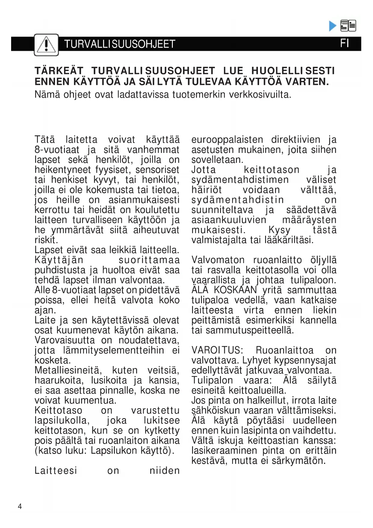 MYYNNIN JÄLKEINEN PALVELUMYYNNIN JÄLKEINEN PALVELU ............................................................19 FI4 Tätä laitetta voivat käyttää 8-vuotiaat ja sitä vanhemmat lapset sekä henkilöt, joilla on heikentyneet fyysiset, sensoriset tai henkiset kyvyt, tai henkilöt, joilla ei ole kokemusta tai tietoa, jos heille on asianmukaisesti kerrottu tai heidät on koulutettu laitteen turvalliseen käyttöön ja he ymmärtävät siitä aiheutuvat riskit. Lapset eivät saa leikkiä laitteella. Käyttäjän suorittamaa puhdistusta ja huoltoa eivät saa tehdä lapset ilman valvontaa. Alle 8-vuotiaat lapset on pidettävä poissa, ellei heitä valvota koko ajan. Laite ja sen käytettävissä olevat osat kuumenevat käytön aikana. Varovaisuutta on noudatettava, jotta lämmityselementteihin ei kosketa. Metalliesineitä, kuten veitsiä, haarukoita, lusikoita ja kansia, ei saa asettaa pinnalle, koska ne voivat kuumentua. Keittotaso on varustettu lapsilukolla, joka lukitsee keittotason, kun se on kytketty pois päältä tai ruoanlaiton aikana (katso luku: Lapsilukon käyttö). Laitteesi on niiden eurooppalaisten direktiivien ja asetusten mukainen, joita siihen sovelletaan. Jotta keittotason ja sydämentahdistimen väliset häiriöt voidaan välttää, sydämentahdistin on suunniteltava ja säädettävä asiaankuuluvien määräysten mukaisesti. Kysy tästä valmistajalta tai lääkäriltäsi. Valvomaton ruoanlaitto öljyllä tai rasvalla keittotasolla voi olla vaarallista ja johtaa tulipaloon. ÄLÄ KOSKAAN yritä sammuttaa tulipaloa vedellä, vaan katkaise laitteesta virta ennen liekin peittämistä esimerkiksi kannella tai sammutuspeitteellä. VAROITUS: Ruoanlaittoa on valvottava. Lyhyet kypsennysajat edellyttävät jatkuvaa valvontaa. Tulipalon vaara: Älä säilytä esineitä keittoalueilla. Jos pinta on halkeillut, irrota laite sähköiskun vaaran välttämiseksi. Älä käytä pöytääsi uudelleen ennen kuin lasipinta on vaihdettu. Vältä iskuja keittoastian kanssa: lasikeraaminen pinta on erittäin kestävä, mutta ei särkymätön.