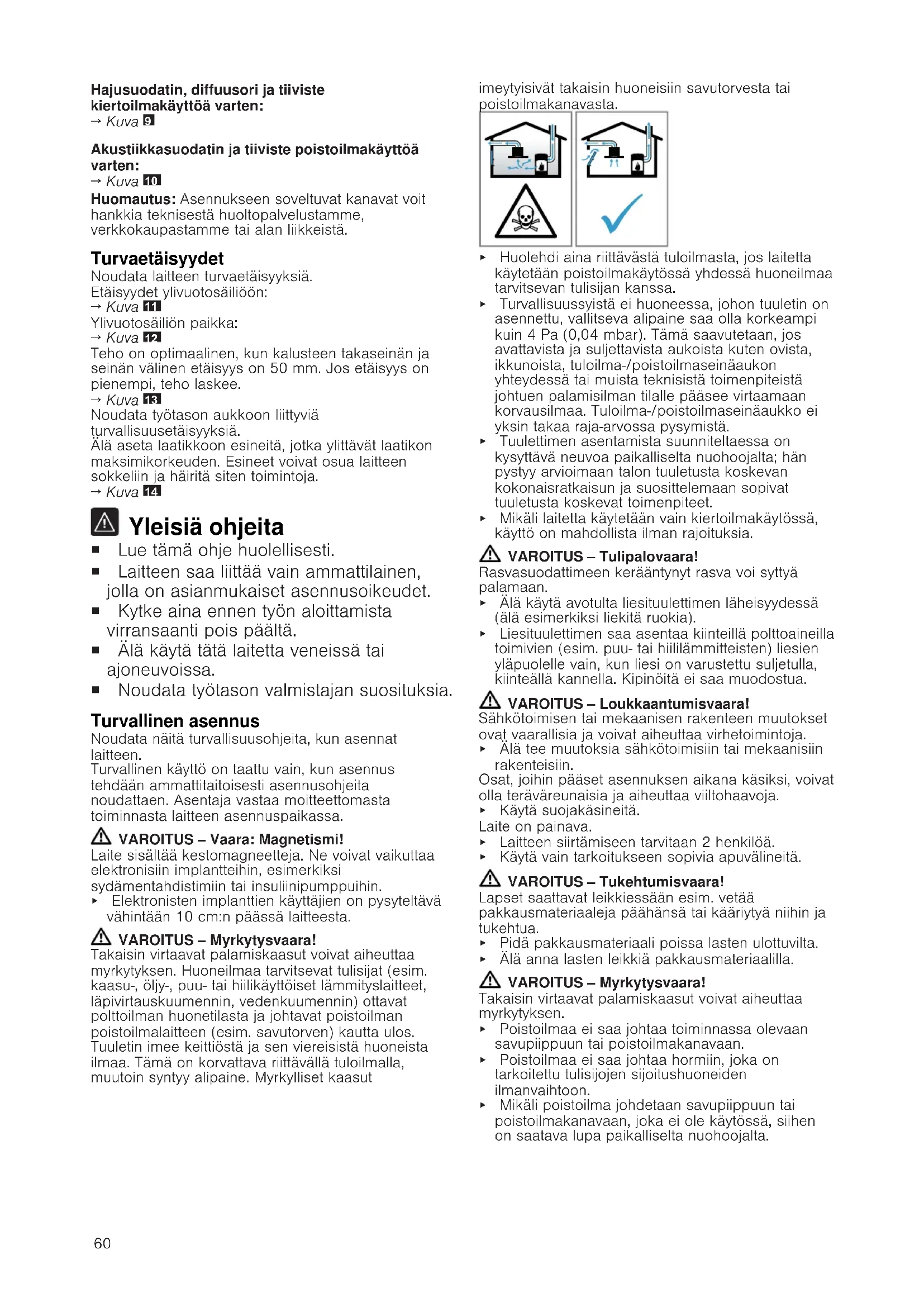 Yleisiä ohjeita ¡ Lue tämä ohje huolellisesti. ¡ Laitteen saa liittää vain ammattilainen, jolla on asianmukaiset asennusoikeudet. ¡ Kytke aina ennen työn aloittamista virransaanti pois päältä. ¡ Älä käytä tätä laitetta veneissä tai ajoneuvoissa. ¡ Noudata työtason valmistajan suosituksia. Turvallinen asennus Noudata näitä turvallisuusohjeita, kun asennat laitteen. Turvallinen käyttö on taattu vain, kun asennus tehdään ammattitaitoisesti asennusohjeita noudattaen. Asentaja vastaa moitteettomasta toiminnasta laitteen asennuspaikassa. VAROITUS‒Vaara: Magnetismi! Laite sisältää kestomagneetteja. Ne voivat vaikuttaa elektronisiin implantteihin, esimerkiksi sydämentahdistimiin tai insuliinipumppuihin. ▶ Elektronisten implanttien käyttäjien on pysyteltävä vähintään 10cm:n päässä laitteesta. VAROITUS‒Myrkytysvaara! Takaisin virtaavat palamiskaasut voivat aiheuttaa myrkytyksen. Huoneilmaa tarvitsevat tulisijat (esim. kaasu-, öljy-, puu- tai hiilikäyttöiset lämmityslaitteet, läpivirtauskuumennin, vedenkuumennin) ottavat polttoilman huonetilasta ja johtavat poistoilman poistoilmalaitteen (esim. savutorven) kautta ulos. Tuuletin imee keittiöstä ja sen viereisistä huoneista ilmaa. Tämä on korvattava riittävällä tuloilmalla, muutoin syntyy alipaine. Myrkylliset kaasut imeytyisivät takaisin huoneisiin savutorvesta tai poistoilmakanavasta. ▶ Huolehdi aina riittävästä tuloilmasta, jos laitetta käytetään poistoilmakäytössä yhdessä huoneilmaa tarvitsevan tulisijan kanssa. ▶ Turvallisuussyistä ei huoneessa, johon tuuletin on asennettu, vallitseva alipaine saa olla korkeampi kuin 4Pa(0,04mbar). Tämä saavutetaan, jos avattavista ja suljettavista aukoista kuten ovista, ikkunoista, tuloilma-/poistoilmaseinäaukon yhteydessä tai muista teknisistä toimenpiteistä johtuen palamisilman tilalle pääsee virtaamaan korvausilmaa. Tuloilma-/poistoilmaseinäaukko ei yksin takaa raja-arvossa pysymistä. ▶ Tuulettimen asentamista suunniteltaessa on kysyttävä neuvoa paikalliselta nuohoojalta; hän pystyy arvioimaan talon tuuletusta koskevan kokonaisratkaisun ja suosittelemaan sopivat tuuletusta koskevat toimenpiteet. ▶ Mikäli laitetta käytetään vain kiertoilmakäytössä, käyttö on mahdollista ilman rajoituksia. VAROITUS‒Tulipalovaara! Rasvasuodattimeen kerääntynyt rasva voi syttyä palamaan. ▶ Älä käytä avotulta liesituulettimen läheisyydessä (älä esimerkiksi liekitä ruokia). ▶ Liesituulettimen saa asentaa kiinteillä polttoaineilla toimivien (esim. puu- tai hiililämmitteisten) liesien yläpuolelle vain, kun liesi on varustettu suljetulla, kiinteällä kannella. Kipinöitä ei saa muodostua. VAROITUS‒Loukkaantumisvaara! Sähkötoimisen tai mekaanisen rakenteen muutokset ovat vaarallisia ja voivat aiheuttaa virhetoimintoja. ▶ Älä tee muutoksia sähkötoimisiin tai mekaanisiin rakenteisiin. Osat, joihin pääset asennuksen aikana käsiksi, voivat olla teräväreunaisia ja aiheuttaa viiltohaavoja. ▶ Käytä suojakäsineitä. Laite on painava. ▶ Laitteen siirtämiseen tarvitaan 2 henkilöä. ▶ Käytä vain tarkoitukseen sopivia apuvälineitä. VAROITUS‒Tukehtumisvaara! Lapset saattavat leikkiessään esim. vetää pakkausmateriaaleja päähänsä tai kääriytyä niihin ja tukehtua. ▶ Pidä pakkausmateriaali poissa lasten ulottuvilta. ▶ Älä anna lasten leikkiä pakkausmateriaalilla. VAROITUS‒Myrkytysvaara! Takaisin virtaavat palamiskaasut voivat aiheuttaa myrkytyksen. ▶ Poistoilmaa ei saa johtaa toiminnassa olevaan savupiippuun tai poistoilmakanavaan. ▶ Poistoilmaa ei saa johtaa hormiin, joka on tarkoitettu tulisijojen sijoitushuoneiden ilmanvaihtoon. ▶ Mikäli poistoilma johdetaan savupiippuun tai poistoilmakanavaan, joka ei ole käytössä, siihen on saatava lupa paikalliselta nuohoojalta.61 Takaisin virtaavat palamiskaasut voivat aiheuttaa myrkytyksen. ▶ Jos liesituuletin asennetaan tilaan, jossa on huoneilmaa käyttävä tulisija, liesituulettimen virransyöttöön on asennettava asianmukainen turvakytkin. Sähköliitäntää koskevia ohjeita Jotta laitteen sähköliitäntä on turvallinen, noudata seuraavia ohjeita. VAROITUS‒Sähköiskun vaara! Laite pitää saada aina irrotettua verkkovirrasta. Laitteen saa liittää vain määräystenmukaisesti asennettuun pistorasiaan. ▶ Kiinteään sähköliitäntään on asennettava ylijänniteluokan III ehtojen ja asennusmääräysten mukainen jokanapainen katkaisin. ▶ Kiinteän sähköasennuksen saa tehdä vain sähköasentaja. Suosittelemme asentamaan vikavirtakatkaisimen (FI-katkaisin) laitteen jännitteensaannin virtapiiriin. ¡ Älä taita liitäntäjohtoa tai jätä sitä puristuksiin äläkä vie sitä terävien kulmien lähelle. ¡ Sijoita liitäntäjohto siten, että se ei kosketa laitteen kuumaa koteloa. ¡ Käytä vain laitteen mukana toimitettua tai teknisen huoltopalvelun toimittamaa liitäntäjohtoa. ¡ Laite on radiohäiriösuojattu EY-määräysten mukaisesti. ¡ Laitteen suojaluokka on 1. Laitteen käyttö on siten sallittu vain maadoitusliitännän kanssa. ¡ Valmistaja ei vastaa käyttöhäiriöistä tai mahdollisista vaurioista, jotka johtuvat virheellisestä sähköasennuksesta. Sähköliitännän valmistelu Vaatimus:Laitteen sisäpuolelle kohdistuvat työt ja verkkojohdon vaihdon saa tehdä vain asianmukaisen koulutuksen saanut huoltopalvelun henkilöstö.