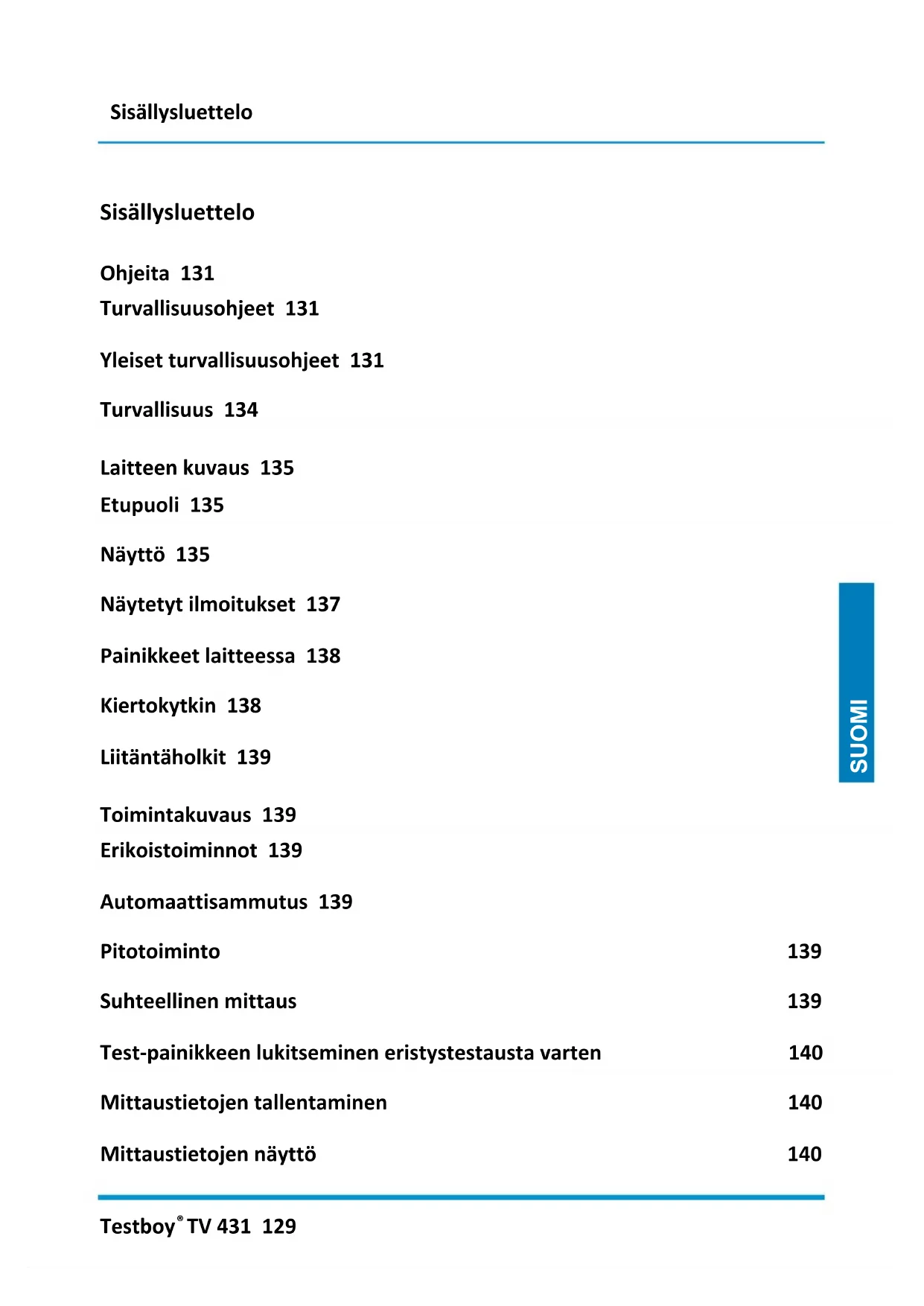 TV 431 129 SUOMI Sisällysluettelo Ohjeita 131 Turvallisuusohjeet 131 Yleiset turvallisuusohjeet 131 Turvallisuus 134 Laitteen kuvaus 135 Etupuoli 135 Näyttö 135 Näytetyt ilmoitukset 137 Painikkeet laitteessa 138 Kiertokytkin 138 Liitäntäholkit 139 Toimintakuvaus 139 Erikoistoiminnot 139 Automaattisammutus 139 Pitotoiminto 139 Suhteellinen mittaus 139 Test-painikkeen lukitseminen eristystestausta varten 140 Mittaustietojen tallentaminen 140 Mittaustietojen näyttö 140Sisällysluettelo Testboy