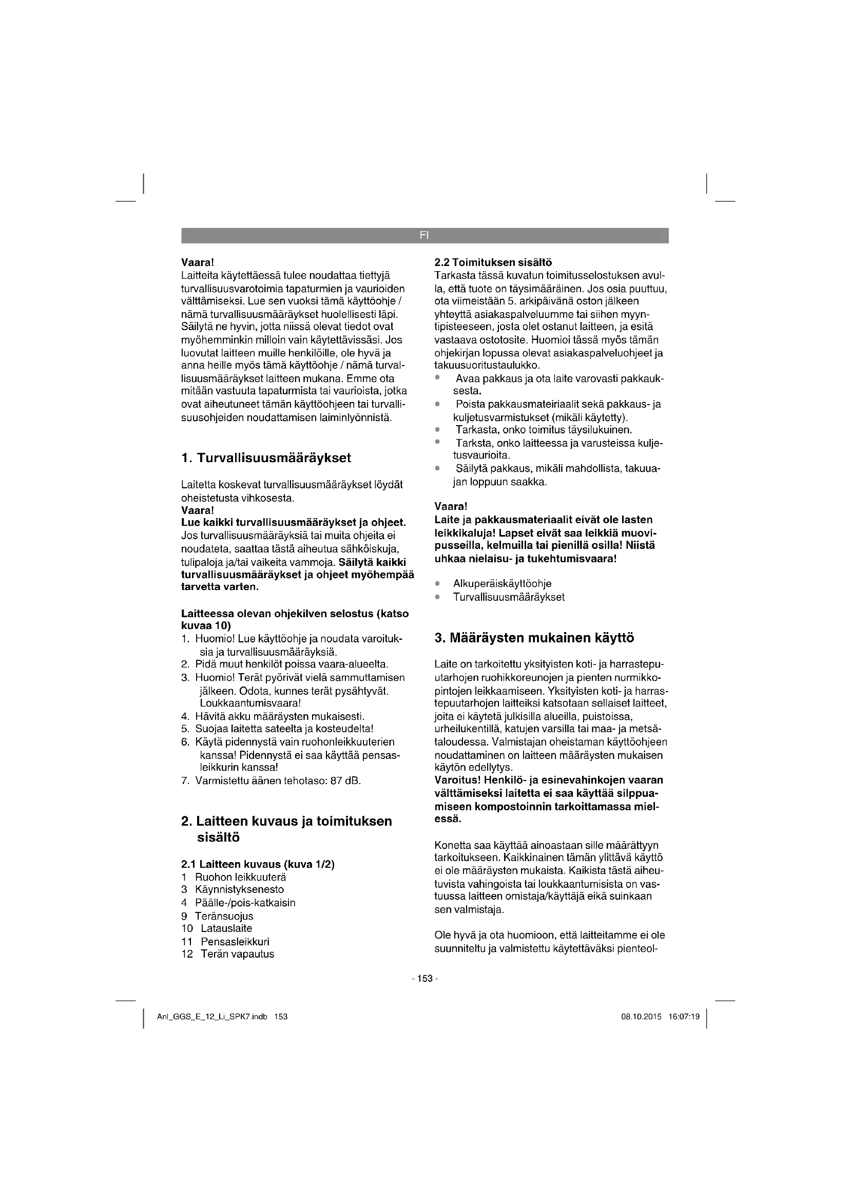 Laite on tarkoitettu yksityisten koti- ja harrastepu- utarhojen ruohikkoreunojen ja pienten nurmikko- pintojen leikkaamiseen. Yksityisten koti- ja harras- tepuutarhojen laitteiksi katsotaan sellaiset laitteet, joita ei käytetä julkisilla alueilla, puistoissa, urheilukentillä, katujen varsilla tai maa- ja metsä- taloudessa. Valmistajan oheistaman käyttöohjeen noudattaminen on laitteen määräysten mukaisen käytön edellytys. Varoitus! Henkilö- ja esinevahinkojen vaaran välttämiseksi laitetta ei saa käyttää silppua- miseen kompostoinnin tarkoittamassa miel- essä. Konetta saa käyttää ainoastaan sille määrättyyn tarkoitukseen. Kaikkinainen tämän ylittävä käyttö ei ole määräysten mukaista. Kaikista tästä aiheu- tuvista vahingoista tai loukkaantumisista on vas- tuussa laitteen omistaja/käyttäjä eikä suinkaan sen valmistaja. Ole hyvä ja ota huomioon, että laitteitamme ei ole suunniteltu ja valmistettu käytettäväksi pienteol- Anl_GGS_E_12_Li_SPK7.indb 153Anl_GGS_E_12_Li_SPK7.indb 153 08.10.2015 16:07:1908.10.2015 16:07:19FI