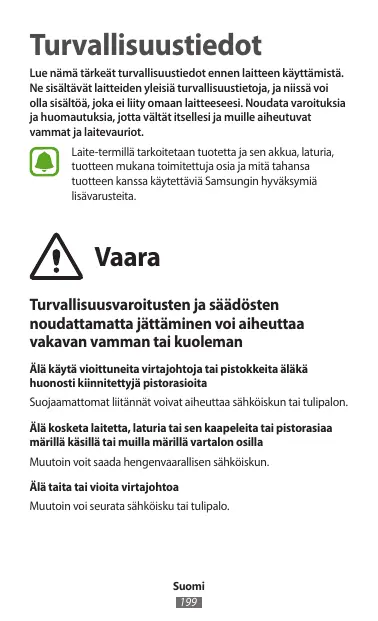 Turvallisuustiedot Lue nämä tärkeät turvallisuustiedot ennen laitteen käyttämistä. Ne sisältävät laitteiden yleisiä turvallisuustietoja, ja niissä voi olla sisältöä, joka ei liity omaan laitteeseesi. Noudata varoituksia ja huomautuksia, jotta vältät itsellesi ja muille aiheutuvat vammat ja laitevauriot. Laite-termillä tarkoitetaan tuotetta ja sen akkua, laturia, tuotteen mukana toimitettuja osia ja mitä tahansa tuotteen kanssa käytettäviä Samsungin hyväksymiä lisävarusteita.