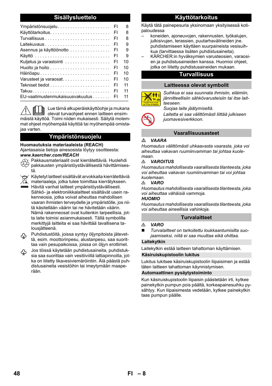 Käytä tätä painepesuria yksinomaan yksityisessä kotipaloudessa – koneiden, ajoneuvojen, rakennusten, työkalujen, julkisivujen, terassien, puutarhavälineiden jne. puhdistamiseen käyttäen suurpaineista vesisuihkua (tarvittaessa lisäten puhdistusaineita). – KÄRCHER:in hyväksymien varusteosien, varaosien ja puhdistusaineiden kanssa. Huomioi ohjeet, jotka on liitetty puhdistusaineiden mukaan. Turvallisuus Laitteessa olevat symbolit Suihkua ei saa suunnata ihmisiin, eläimiin, jännitteellisiin sähkövarusteisiin tai itse laitteeseen. Suojaa laite jäätymiseltä. Laitetta ei saa välittömästi liittää julkiseen juomavesiverkkoon. Lue tämä alkuperäiskäyttöohje ja mukana olevat turvaohjeet ennen laitteen ensimmäistä käyttöä. Toimi niiden mukaisesti. Säilytä molemmat ohjeet myöhempää käyttöä tai myöhempää omistajaa varten. Ympäristönsuojelu Huomautuksia materiaaleista (REACH) Ajantasaisia tietoja ainesosista löytyy osoitteesta: www.kaercher.com/REACH Pakkausmateriaalit ovat kierrätettäviä. Huolehdi pakkausten ympäristöystävällisestä hävittämisestä. Käytetyt laitteet sisältävät arvokkaita kierrätettäviä materiaaleja, jotka tulee toimittaa kierrätykseen. Hävitä vanhat laitteet ympäristöystävällisesti. Sähkö- ja elektroniikkalaitteet sisältävät usein rakenneosia, jotka voivat aiheuttaa mahdollisen vaaran ihmisten terveydelle ja ympäristölle, jos niitä käsitellään väärin tai ne hävitetään väärin. Nämä rakenneosat ovat kuitenkin tarpeellisia, jotta laite toimisi asianmukaisesti. Tällä symbolilla merkittyjä laitteita ei saa hävittää tavallisena talousjätteenä. Puhdistustöitä, joissa syntyy öljynpitoista jätevettä, esim. moottorinpesu, alustanpesu, saa suorittaa vain pesupaikoissa, joissa on öljyn erottimet. Jos töissä käytetään puhdistusaineita, puhdistuksia saa suorittaa vain vesitiiviillä lattiapinnoilla, jotka on liitetty likavesiviemäröintiin. Älä päästä puhdistusaineita vesistöihin tai imeytymään maaperään. Vaarallisuusasteet VAARA Huomautus välittömästi uhkaavasta vaarasta, joka voi aiheuttaa vakavan ruumiinvamman tai johtaa kuolemaan. 몇 VAROITUS Huomautus mahdollisesta vaarallisesta tilanteesta, joka voi aiheuttaa vakavan ruumiinvamman tai voi johtaa kuolemaan. 몇 VARO Huomautus mahdollisesta vaarallisesta tilanteesta, joka voi aiheuttaa vähäisiä vammoja. HUOMIO Huomautus mahdollisesta vaarallisesta tilanteesta, joka voi aiheuttaa aineellisia vahinkoja. Turvalaitteet