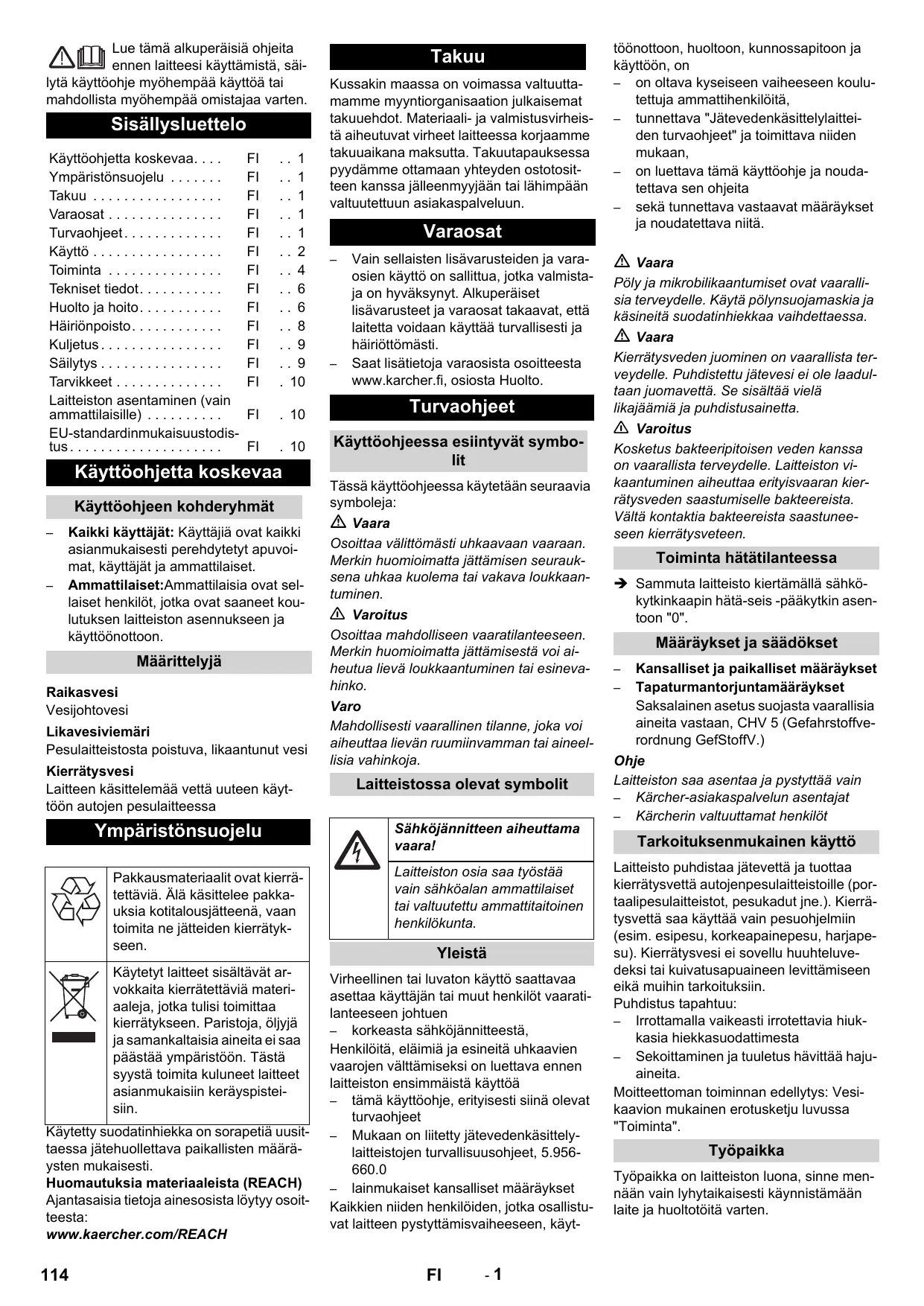 Kaikki käyttäjät: Käyttäjiä ovat kaikki asianmukaisesti perehdytetyt apuvoimat, käyttäjät ja ammattilaiset. Ammattilaiset:Ammattilaisia ovat sellaiset henkilöt, jotka ovat saaneet koulutuksen laitteiston asennukseen ja käyttöönottoon. Määrittelyjä Raikasvesi Vesijohtovesi Likavesiviemäri Pesulaitteistosta poistuva, likaantunut vesi Kierrätysvesi Laitteen käsittelemää vettä uuteen käyttöön autojen pesulaitteessa Ympäristönsuojelu Pakkausmateriaalit ovat kierrätettäviä. Älä käsittelee pakkauksia kotitalousjätteenä, vaan toimita ne jätteiden kierrätykseen. Käytetyt laitteet sisältävät arvokkaita kierrätettäviä materiaaleja, jotka tulisi toimittaa kierrätykseen. Paristoja, öljyjä ja samankaltaisia aineita ei saa päästää ympäristöön. Tästä syystä toimita kuluneet laitteet asianmukaisiin keräyspisteisiin. Käytetty suodatinhiekka on sorapetiä uusittaessa jätehuollettava paikallisten määräysten mukaisesti. Huomautuksia materiaaleista (REACH) Ajantasaisia tietoja ainesosista löytyy osoitteesta: www.kaercher.com/REACH