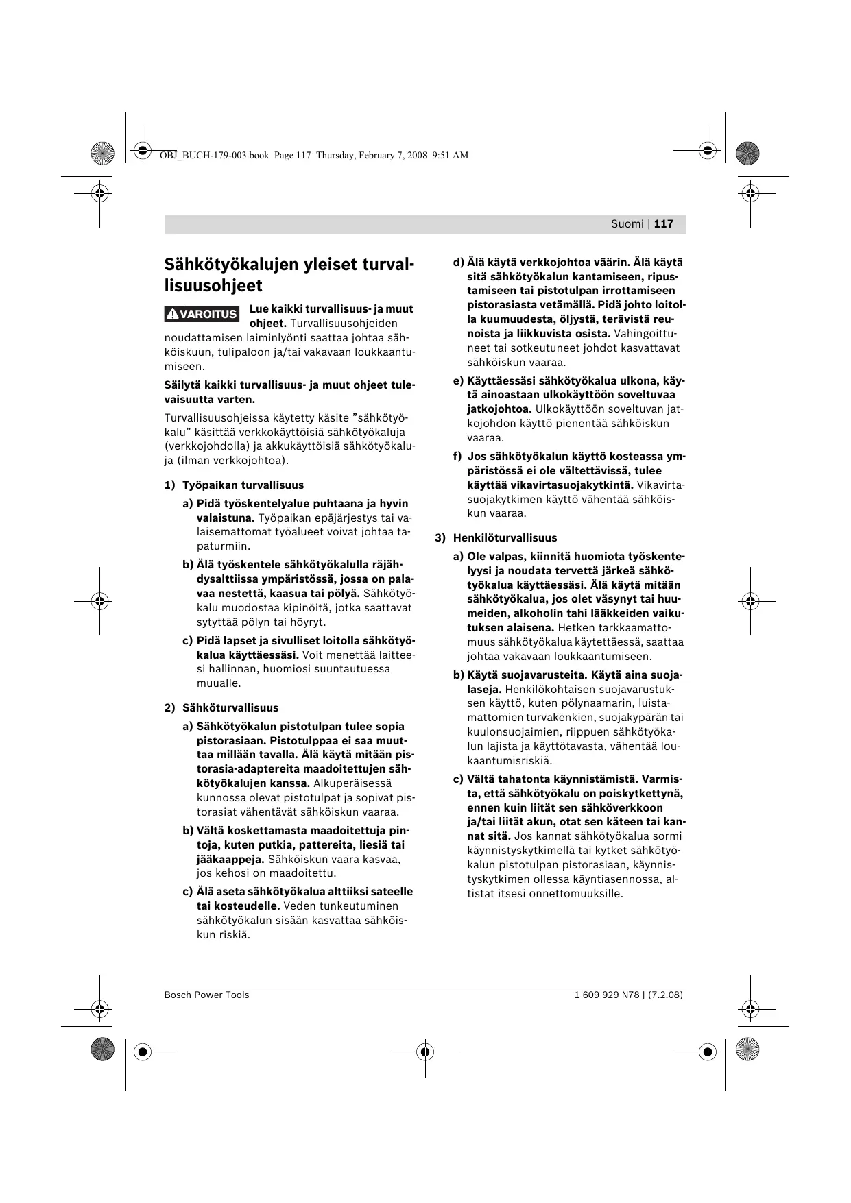 Sähkôtyôkalujen yleiset turval- lisuusohjeet Lue kaïkki turvallisuus- ja muut ohjeet. Turvallisuusohjeiden noudattamisen laiminlyônti saattaa johtaa säh- kôiskuun, tulipaloon ja/tai vakavaan loukkaantu- miseen. À VAROITUS Säilytä kaikki turvallisuus- ja muut ohjeet tule- vaisuutta varten. Turvallisuusohjeissa käytetty käsite "sähkôtyS- kalu” käsittää verkkokäyttôisià sähkôtyôkaluja {verkkojohdolla) ja akkukäyttôisiä sähkôtykalu- ja (ilman verkkojohtoa).