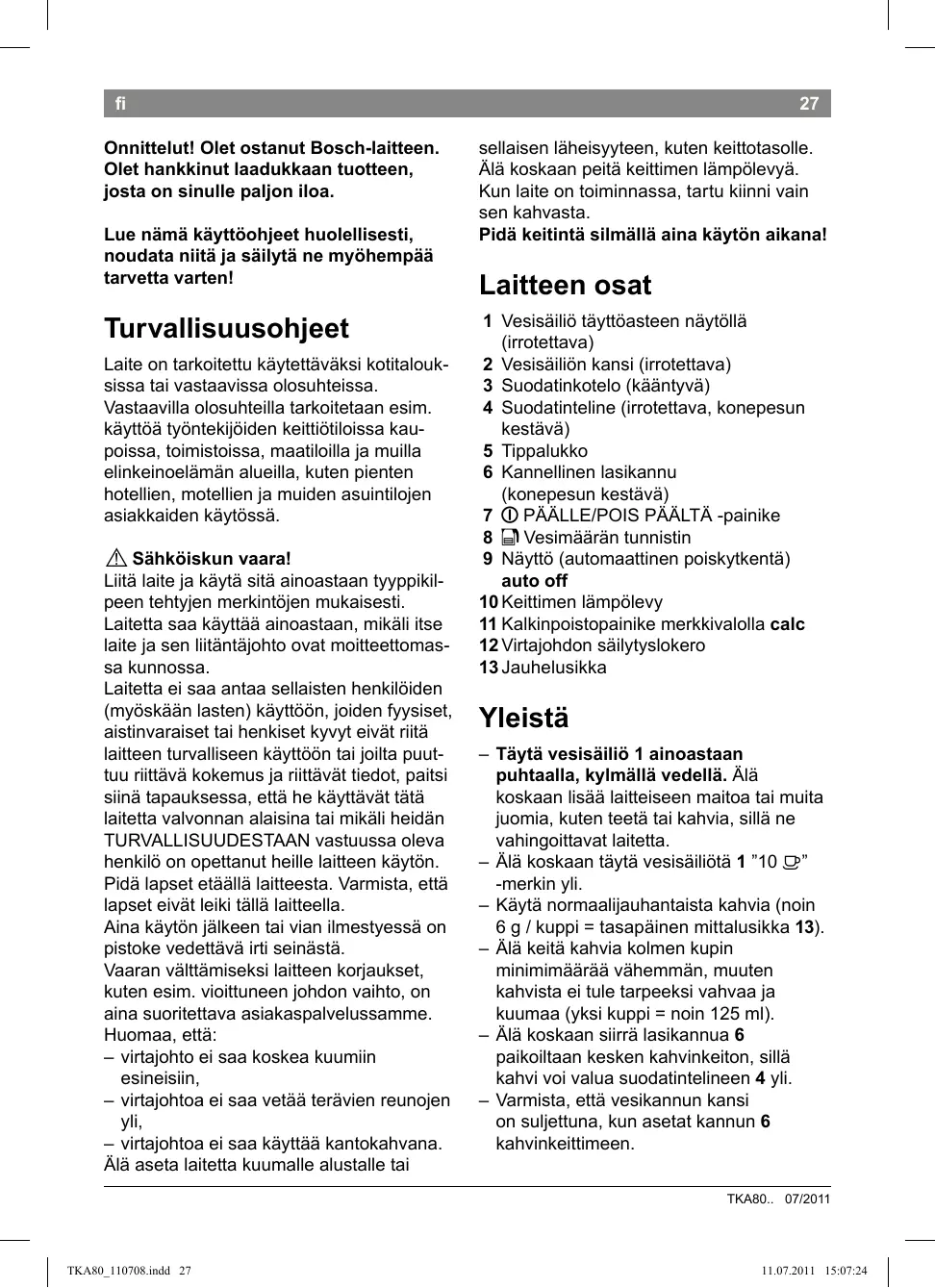 KÄYTTÖOHJE TKA8013, TKA8653 BOSCH