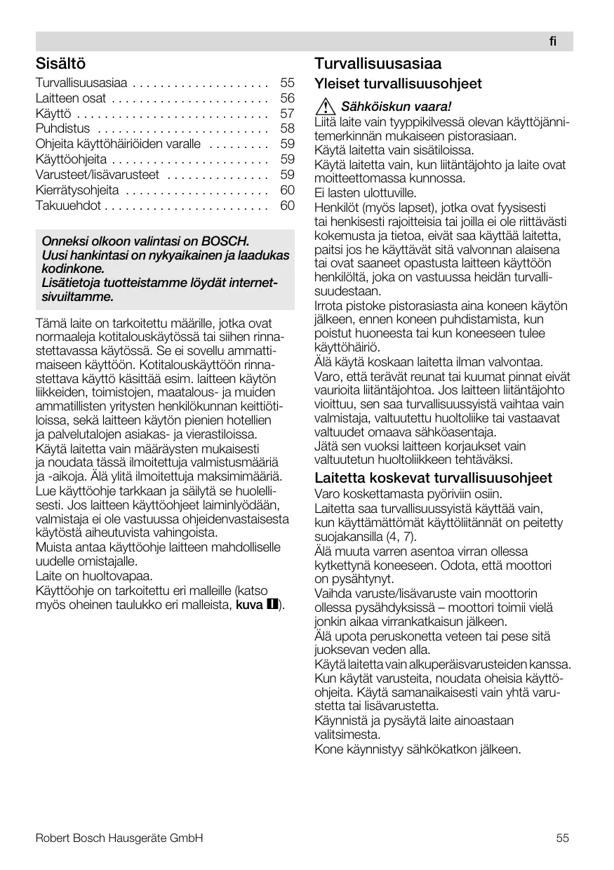 lååÉâëá=çäâççå=î~äáåí~ëá=çå=_lp`eK rìëá=Ü~åâáåí~ëá=çå=åóâó~áâ~áåÉå=à~=ä~~Çìâ~ë= âçÇáåâçåÉK iáë®íáÉíçà~=íìçííÉáëí~ããÉ=ä∏óÇ®í=áåíÉêåÉíJ ëáîìáäí~ããÉK Tämä laite on tarkoitettu määrille, jotka ovat normaaleja kotitalouskäytössä tai siihen rinnastettavassa käytössä. Se ei sovellu ammattimaiseen käyttöön. Kotitalouskäyttöön rinnastettava käyttö käsittää esim. laitteen käytön liikkeiden, toimistojen, maatalous- ja muiden ammatillisten yritysten henkilökunnan keittiötiloissa, sekä laitteen käytön pienien hotellien ja palvelutalojen asiakas- ja vierastiloissa. Käytä laitetta vain määräysten mukaisesti ja noudata tässä ilmoitettuja valmistusmääriä ja -aikoja. Älä ylitä ilmoitettuja maksimimääriä. Lue käyttöohje tarkkaan ja säilytä se huolellisesti. Jos laitteen käyttöohjeet laiminlyödään, valmistaja ei ole vastuussa ohjeidenvastaisesta käytöstä aiheutuvista vahingoista. Muista antaa käyttöohje laitteen mahdolliselle uudelle omistajalle. Laite on huoltovapaa. Käyttöohje on tarkoitettu eri malleille (katso myös oheinen taulukko eri malleista, kuva ). Robert Bosch Hausgeräte GmbH Yleiset turvallisuusohjeet p®Üâ∏áëâìå=î~~ê~> Liitä laite vain tyyppikilvessä olevan käyttöjännitemerkinnän mukaiseen pistorasiaan. Käytä laitetta vain sisätiloissa. Käytä laitetta vain, kun liitäntäjohto ja laite ovat moitteettomassa kunnossa. Ei lasten ulottuville. Henkilöt (myös lapset), jotka ovat fyysisesti tai henkisesti rajoitteisia tai joilla ei ole riittävästi kokemusta ja tietoa, eivät saa käyttää laitetta, paitsi jos he käyttävät sitä valvonnan alaisena tai ovat saaneet opastusta laitteen käyttöön henkilöltä, joka on vastuussa heidän turvallisuudestaan. Irrota pistoke pistorasiasta aina koneen käytön jälkeen, ennen koneen puhdistamista, kun poistut huoneesta tai kun koneeseen tulee käyttöhäiriö. Älä käytä koskaan laitetta ilman valvontaa. Varo, että terävät reunat tai kuumat pinnat eivät vaurioita liitäntäjohtoa. Jos laitteen liitäntäjohto vioittuu, sen saa turvallisuussyistä vaihtaa vain valmistaja, valtuutettu huoltoliike tai vastaavat valtuudet omaava sähköasentaja. Jätä sen vuoksi laitteen korjaukset vain valtuutetun huoltoliikkeen tehtäväksi. Laitetta koskevat turvallisuusohjeet Varo koskettamasta pyöriviin osiin. Laitetta saa turvallisuussyistä käyttää vain, kun käyttämättömät käyttöliitännät on peitetty suojakansilla (4, 7). Älä muuta varren asentoa virran ollessa kytkettynä koneeseen. Odota, että moottori on pysähtynyt. Vaihda varuste/lisävaruste vain moottorin ollessa pysähdyksissä – moottori toimii vielä jonkin aikaa virrankatkaisun jälkeen. Älä upota peruskonetta veteen tai pese sitä juoksevan veden alla. Käytä laitetta vain alkuperäisvarusteiden kanssa. Kun käytät varusteita, noudata oheisia käyttöohjeita. Käytä samanaikaisesti vain yhtä varustetta tai lisävarustetta. Käynnistä ja pysäytä laite ainoastaan valitsimesta. Kone käynnistyy sähkökatkon jälkeen.