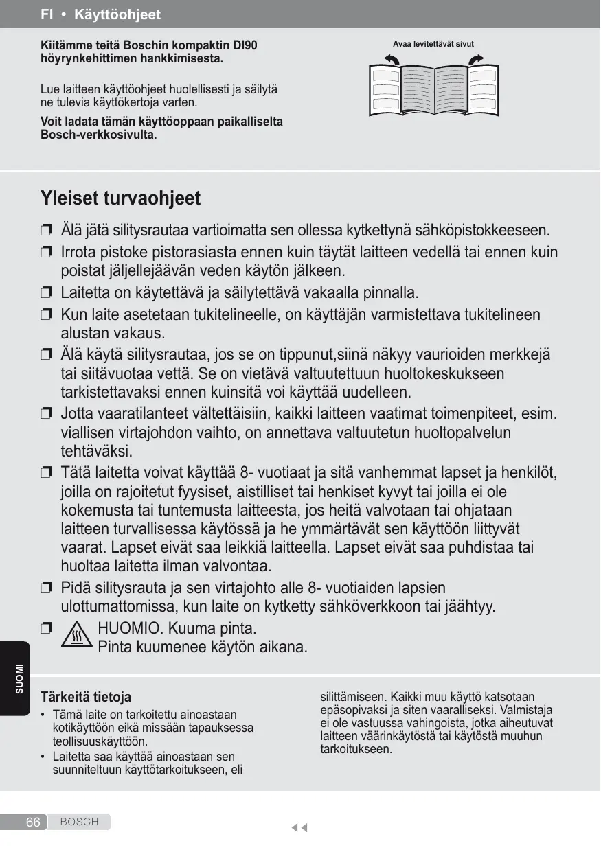Lue laitteen käyttöohjeet huolellisesti ja säilytä ne tulevia käyttökertoja varten. Voit ladata tämän käyttöoppaan paikalliselta Bosch-verkkosivulta.