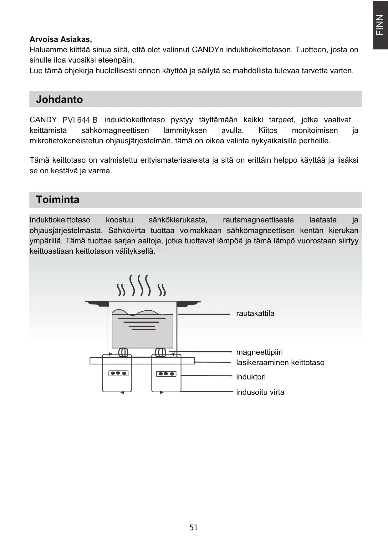 Arvoisa Asiakas, Haluamme kiittää sinua siitä, että olet valinnut CANDYn induktiokeittotason. Tuotteen, josta on sinulle iloa vuosiksi eteenpäin. Lue tämä ohjekirja huolellisesti ennen käyttoä ja säilytä se mahdollista tulevaa tarvetta varten. Johdanto CANDY PVI644B induktiokeittotaso pystyy täyttämään kaikki tarpeet, jotka vaativat keittämistä sähkômagneettisen lämmityksen avulla. Kiitos monitoimisen ja mikrotietokoneistetun ohjausjärjestelmän, tämä on oikea valinta nykyaikaisille perheille. Tämä keittotaso on valmistettu erityismateriaaleista ja sitäà on erittäin helppo käyttää ja lisäksi se on kestävä ja varma. Toiminta Induktiokeittotaso koostuu sähkôkierukasta, rautamagneettisesta laatasta ja ohjausjärjestelmästä. Sähkôvirta tuottaa voimakkaan sähkômagneettisen kentän Kkierukan ympärillà. Tämä tuottaa sarjan aaltoja, jotka tuottavat lämpôä ja tämä lämpô vuorostaan siirtyy keittoastiaan keittotason välityksellàä.