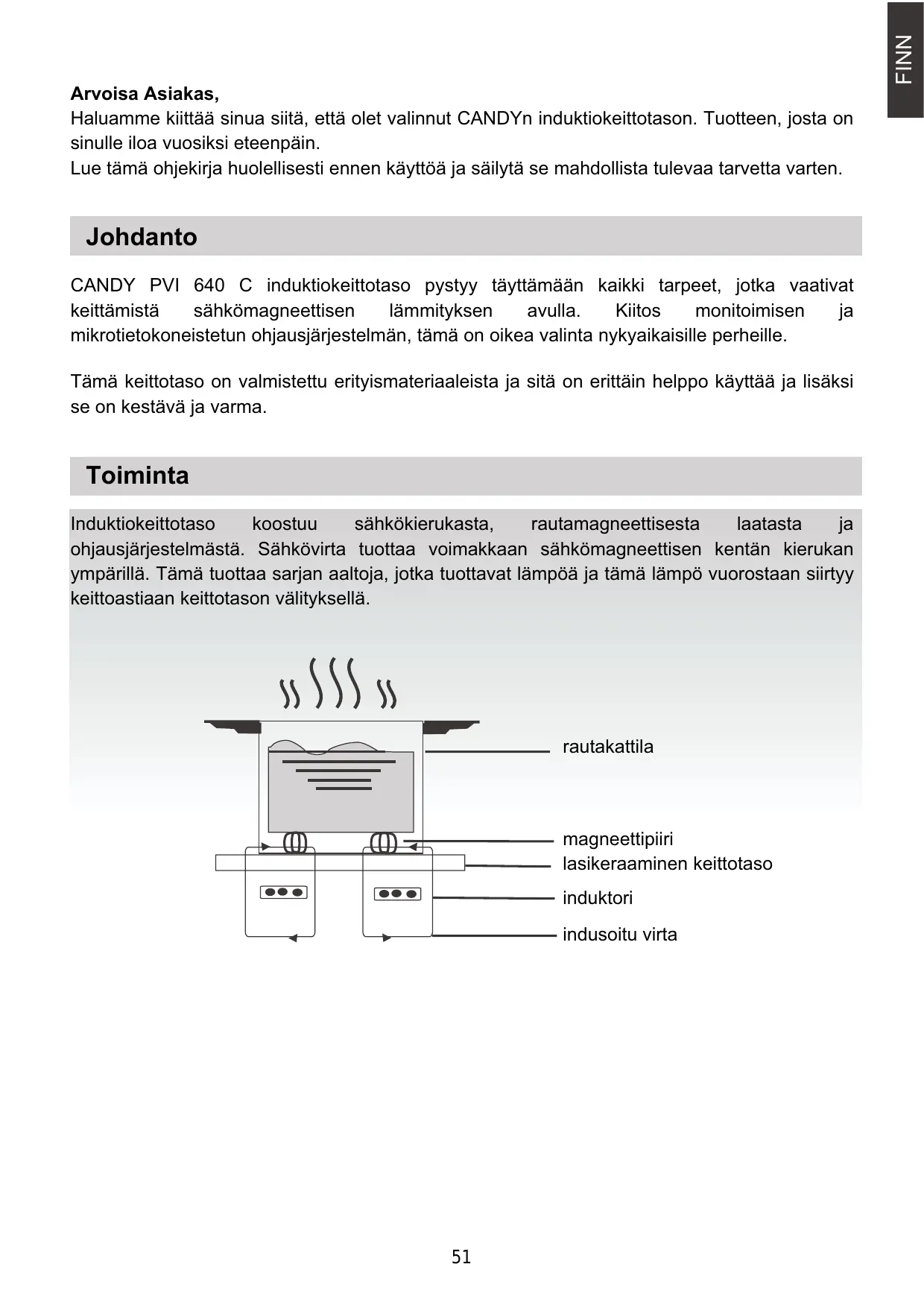 FINN Arvoisa Asiakas, Haluamme kiittää sinua siitä, että olet valinnut CANDYn induktiokeittotason. Tuotteen, josta on sinulle iloa vuosiksi eteenpäin. Lue tämä ohjekirja huolellisesti ennen käyttöä ja säilytä se mahdollista tulevaa tarvetta varten. Johdanto CANDY PVI 640 C induktiokeittotaso pystyy täyttämään kaikki tarpeet, jotka vaativat keittämistä sähkömagneettisen lämmityksen avulla. Kiitos monitoimisen mikrotietokoneistetun ohjausjärjestelmän, tämä on oikea valinta nykyaikaisille perheille. Tämä keittotaso on valmistettu erityismateriaaleista ja sitä on erittäin helppo käyttää ja lisäksi se on kestävä ja varma. Toiminta Induktiokeittotaso koostuu sähkökierukasta, rautamagneettisesta laatasta ohjausjärjestelmästä. Sähkövirta tuottaa voimakkaan sähkömagneettisen kentän kierukan ympärillä. Tämä tuottaa sarjan aaltoja, jotka tuottavat lämpöä ja tämä lämpö vuorostaan siirtyy keittoastiaan keittotason välityksellä. rautakattila magneettipiiri lasikeraaminen keittotaso induktori indusoitu virta