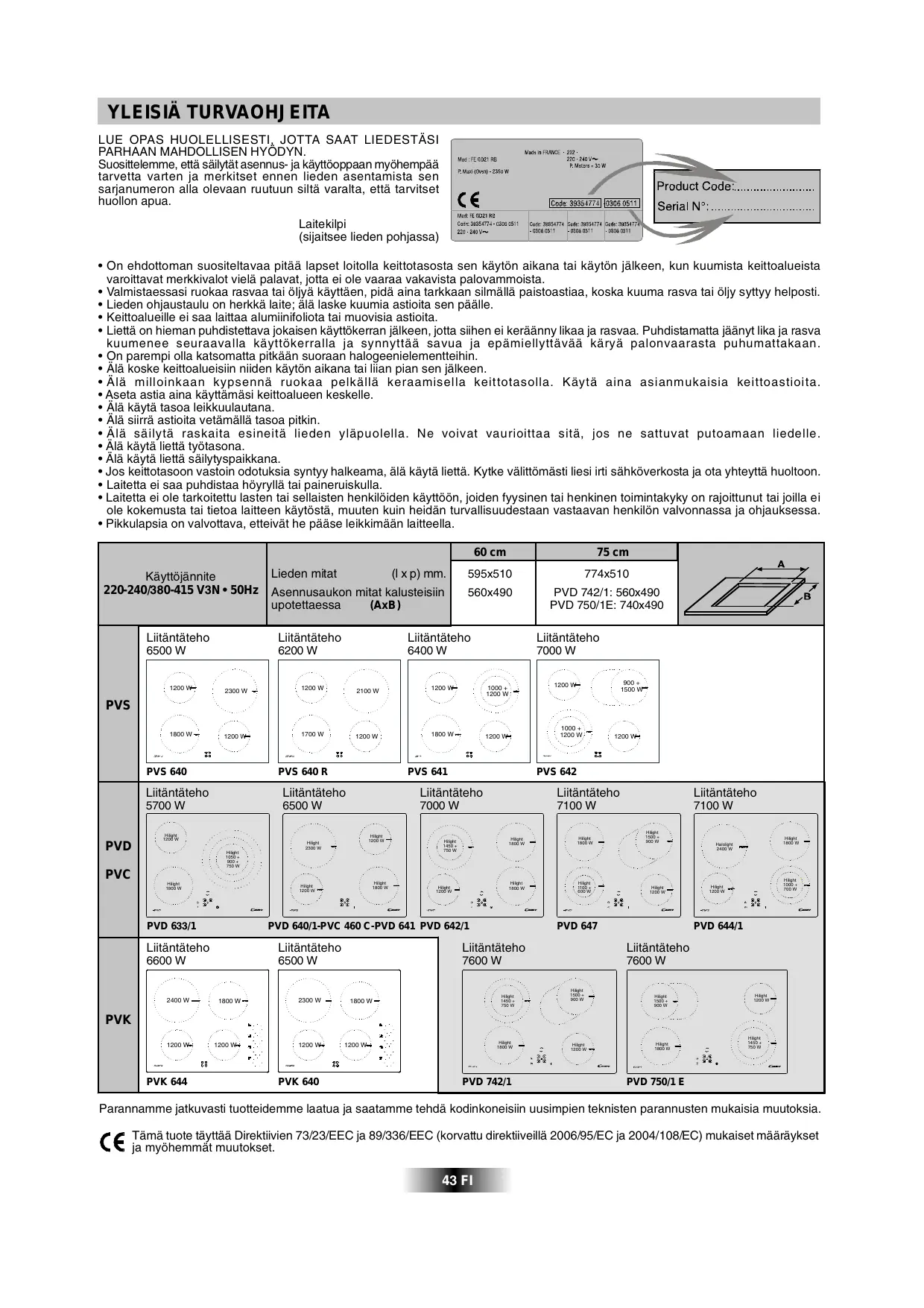 - Pikkulapsia on valvottava, etteivät he pääse leikkimään laitteella. 60 cm Käyttöjännite 220-240/380-415 V3N • 50Hz Lieden mitat 75 cm (l x p) mm. 595x510 774x510 Asennusaukon mitat kalusteisiin upotettaessa (AxB) 560x490 PVD 742/1: 560x490 PVD 750/1E: 740x490 Liitäntäteho Liitäntäteho Liitäntäteho Liitäntäteho 6500 W 6200 W 6400 W 7000 W 1200 W 2300 W 1200 W 2100 W 1200 W 1000 + 1200 W 1800 W 1200 W 1700 W 1200 W 1800 W 1200 W 900 + 1500 W 1200 W PVS PVS 640 PVD PVS 640 R 1000 + 1200 W PVS 641 1200 W PVS 642 Liitäntäteho Liitäntäteho Liitäntäteho Liitäntäteho Liitäntäteho 5700 W 6500 W 7000 W 7100 W 7100 W Hilight 1200 W Hilight 1200 W Hilight 2300 W Hilight 1050 + 900 + 750 W Hilight 1450 + 750 W Hilight 1800 W Hilight 1800 W Hilight 1800 W Hilight 1100 + 600 W Hilight 1500 + 900 W Hilight 1800 W Halolight 2400 W PVC Hilight 1800 W Hilight 1800 W Hilight 1200 W PVD 633/1 Hilight 1200 W