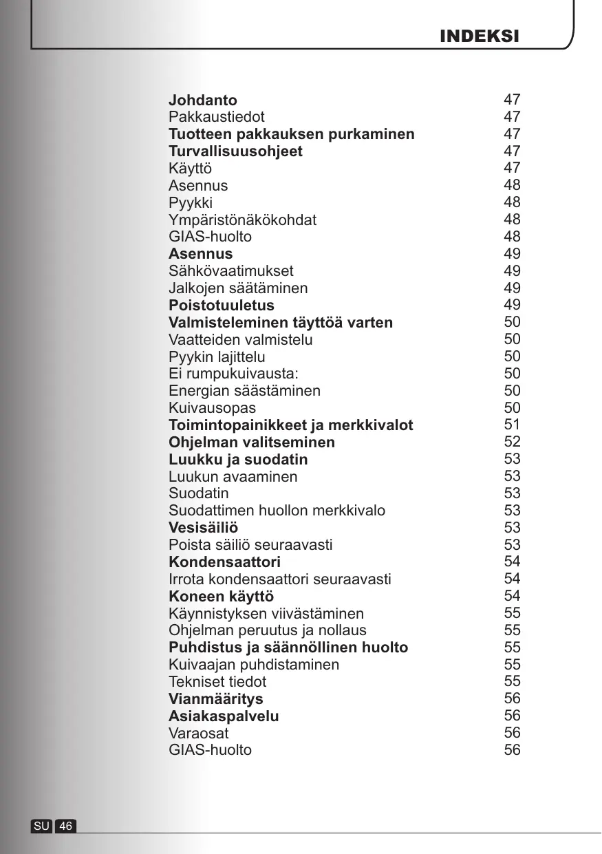 nosta kuivain polystyreenialustalta. Hävitä pakkausmateriaali turvallisesti. Pidä se poissa lasten ulottuvilta, koska se voi aiheuttaa vaaraa. TURVALLISUUSOHJEET Käyttö ● Tätä konetta ei ole tarkoitettu sellaisten henkilöiden (mukaan lukien lapset) käyttöön, joiden fyysiset, henkiset tai aistitoimintoihin liittyvät kyvyt ovat alentuneet tai joilla ei ole koneen käyttöön tarvittavaa kokemusta ja tietoa, ellei heidän turvallisuudestaan vastaava henkilö ole neuvonut heitä koneen käytössä tai valvo käyttötilannetta. ● Lapsia on valvottava sen varmistamiseksi, että he eivät leiki koneella. ● VAROITUS Kuivausrummun väärinkäyttö voi aiheuttaa palovaaran. ● Tämä kone on tarkoitettu vain kotikäytössä tapahtuvaan tekstiilien ja vaatteiden kuivaamiseen. ● Tätä laitetta tulee käyttää vain suunniteltuun käyttötarkoitukseen, joka on kuvattu tässä oppaassa. Perehdy asennus- ja käyttöohjeisiin hyvin ennen laitteen käyttöä. ● Älä koske laitteeseen kostein tai märin käsin tai jaloin. ● Älä nojaa luukkuun, kun täytät konetta, äläkä nosta tai liikuta konetta luukusta. ● Älä päästä lapsia leikkimään koneella tai sen toimintopainikkeilla. ● VAROITUS Älä käytä tuotetta, jos nukkasuodatin ei ole paikallaan tai jos se on vaurioitunut – nukka saattaa syttyä palamaan. ● VAROITUS Kuumien pintojen varoitussymbolilla merkittyjen pintojen lämpötila voi kuivausrumpua käytettäessä olla yli 60 °C. ● Irrota pistoke pistorasiasta. Irrota pistoke aina ennen koneen puhdistamista. ● Älä jatka koneen käyttöä, jos havaitset sen vialliseksi. ● Älä anna pölyn tai nukan kerääntyä lattialle koneen ympärille. ● Kuivaimen sisällä oleva rumpu voi olla erittäin kuuma. Älä poista pyykkiä koneesta, ennen kuin jäähdytysaika on kokonaan loppunut. SU 47 TURVALLISUUSOHJEET Asennus ● Tarkasta ennen käyttöä, että tuotteessa ei ole havaittavia vaurioita. Älä käytä vaurioitunutta tuotetta, vaan ota yhteyttä GIAS-huoltoon. ● Älä käytä sovittimia, useita liittimiä tai jatkojohtoja. ● Älä koskaan asenna kuivainta verhoja vasten ja varmista, että tavaroiden putoaminen tai kerääntyminen laitteen taakse on estetty. ● Konetta ei saa asentaa lukittavan oven, liukuoven tai sellaisen oven taakse, jossa on sarana vastakkaisella puolella kuivausrummun luukkuun nähden. Pyykki ● Älä kuivata kuivausrummussa pese-mättömiä tekstiilejä. ● VAROITUS ÄLÄ kuivaa rummussa tekstiilejä, jotka on käsitelty kuivapesunes-teillä. ● VAROITUS Vaahtokumimateriaalit voivat tietyissä oloissa lämmitettyinä syttyä palamaan itsestään. Kuivausrummussa EI SAA kuivata vaahtokumia (lateksivaahtoa) sisältäviä vaatekappaleita kuten suihkumyssyjä, vedenpitäviä tekstiileitä, kumiselkäisiä esineitä tai tyynyjä, jotka sisältävät vaahtokumia. ● Varmista aina tuotteen soveltuvuus kuivaukseen tuotteen pesuohjeista. . ● Vaatteet pitää lingota tai niistä pitää vääntää vesi kunnolla pois, ennen kuin ne voi asettaa kuivausrumpuun. Vaatteita, joista valuu vettä, EI saa laittaa kuivaimeen. ● Sytyttimiä tai tulitikkuja ei saa jäädä taskuihin. Koneen läheisyydessä EI SAA KOSKAAN käsitellä palavia nesteitä. ● Lasikuitukankaita EI SAA KOSKAAN laittaa koneeseen. Vaatteisiin joutuneet lasikuidut saattavat aiheuttaa ihoärsytystä. ● Vaatteet, jotka ovat likaantuneet ruokaöljyyn, asetoniin, alkoholiin, bensiiniin, paloöljyyn, tahranpoistoaineisiin, tärpättiin, vahoihin ja vahanpoistoaineisiin, on pestävä kuumalla vedellä ja tavallista runsaammalla pesuaineella ennen kuivausta kuivausrummussa. ● Huuhteluaineita ja muita vastaavia tuotteita tulee käyttää huuhteluaineen valmistajan ohjeiden mukaisesti. SU 48 Ympäristönäkökohdat ● Kaikki pakkausmateriaalit ovat ympäristöystävällisiä, ja ne voidaan kierrättää. Muista hävittää pakkausmateriaalit ympäristöystävällisellä tavalla. Paikallisviranomaiset antavat lisätietoja käytössä olevista hävitystavoista. ● Varmista turvallisuus poistaessasi vanhan pesukoneen käytöstä. Irrota pistoke pistorasiasta, katkaise virtajohto ja hävitä se yhdessä pistokkeen kanssa. Hajota luukun saranat tai luukun lukko, jotta lapset eivät pysty sulkemaan itseään koneen sisään. Euroopan Unionin Direktiivi 2002/96/EY Tämä laite on merkitty sähkö- ja elektroniikkalaiteromusta annetun Euroopan unionin direktiivin 2002/96/EY mukaisesti. Tämän tuotteen asianmukainen hävittäminen auttaa estämään mahdolliset kielteiset ympäristö- ja terveysvaikutukset, joita vääränlainen jätteenkäsittely voisi muutoin aiheuttaa. Tuotteeseen merkitty tunnus osoittaa, että tätä tuotetta ei saa käsitellä kotitalousjätteenä. Sen sijaan se tulee toimittaa sähköja elektroniikkalaiteromun keräyspisteeseen. Tuote tulee hävittää paikallisten jätehuoltomääräysten mukaisesti. Lisätietoja tämän tuotteen käsittelystä, keräämisestä ja kierrätyksestä saa kunnan ympäristöviranomaisilta, jätehuoltoyhtiöstä ja liikkeestä, josta tuote on ostettu. GIAS-huolto ● Jotta varmistat koneen jatkuvan turvallisuuden ja tehokkaan toiminnan, suosittelemme, että kaikki huolto- ja korjaustyöt suorittaa vain GIAS-huollon huoltoteknikko. Jos laite ei toimi oikein tai jos se lakkaa toimimasta, sammuta virta ja irrota sähköjohto pistorasiasta. Ota yhteys GIAS-huoltoon ja kysy neuvoa korjauksesta. ASENNUS Sähkövaatimukset Kuivausrummut toimivat 220-240V:n jännitteellä (50Hz:n yksivaihe). Varmista, että syöttövir-tapiirin mitoitusvirta on vähintään 10 Sähkö voi olla erittäin vaarallista. Tämä laite on maadoitettava. Pistorasian ja pistokkeen on oltava samantyyppisiä. Älä käytä useita sovittimia tai jatkojohtoja. Pistokkeen pitää olla irrotettavissa pistorasiasta myös laitteen asennuksen jälkeen. POISTOTUULETUS Huoneeseen, johon rumpukuivaaja on asennettu, on järjestettävä riittävä poistotuuletus, jo